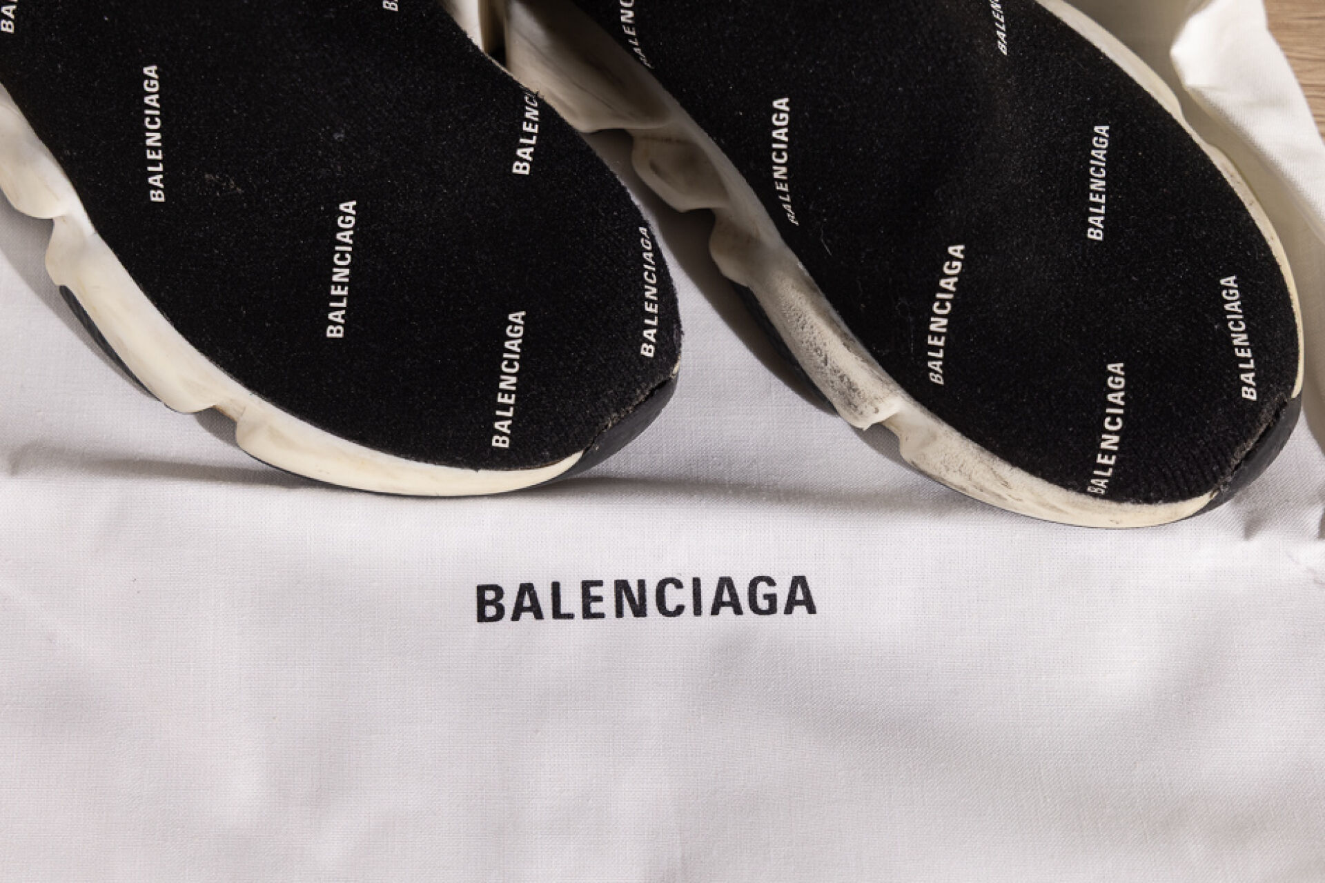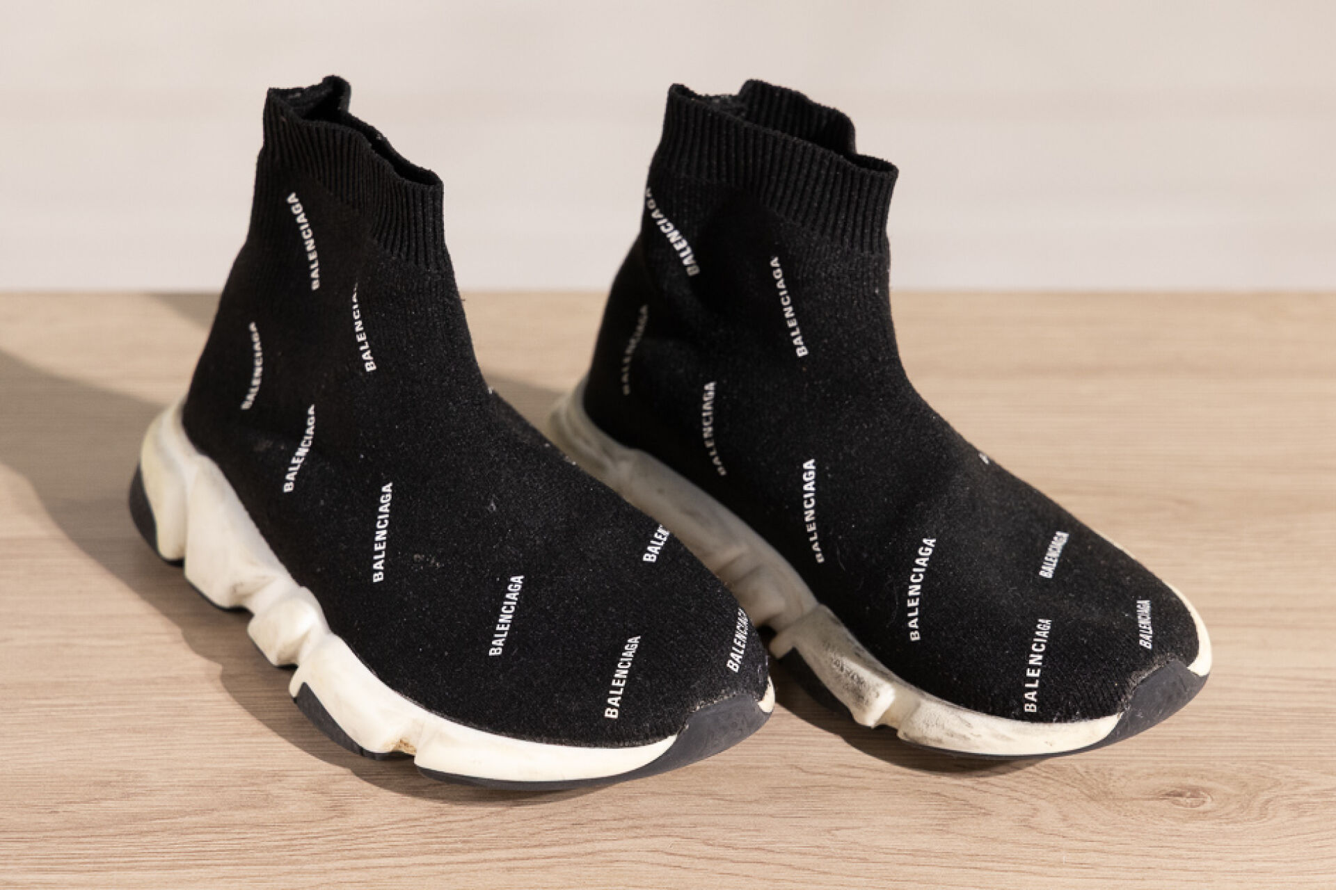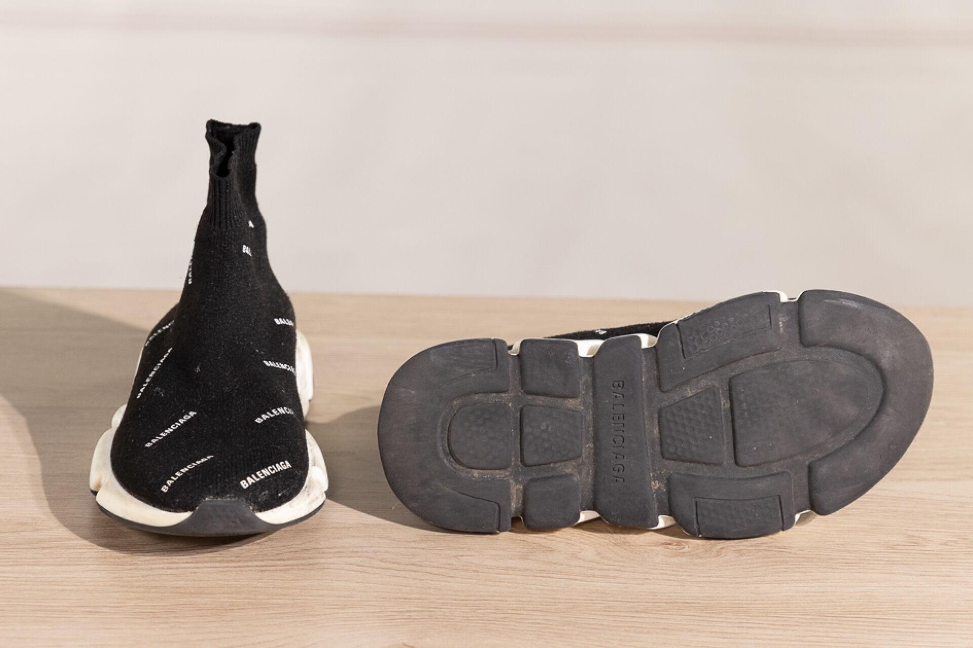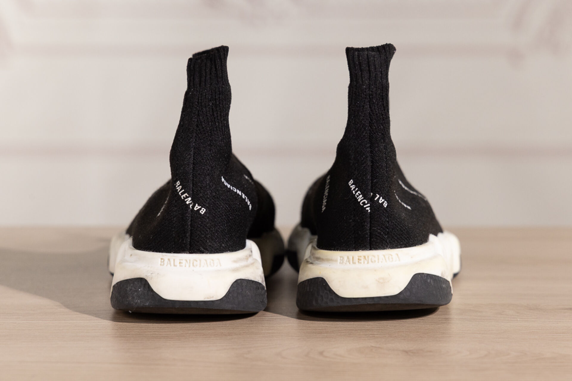 BALENCIAGA - Paire de baskets chaussettes noires portant le nom en blanc sur semelle crantée coordonnée. Boite. Pointure 29-30 Salissures, traces d'usage