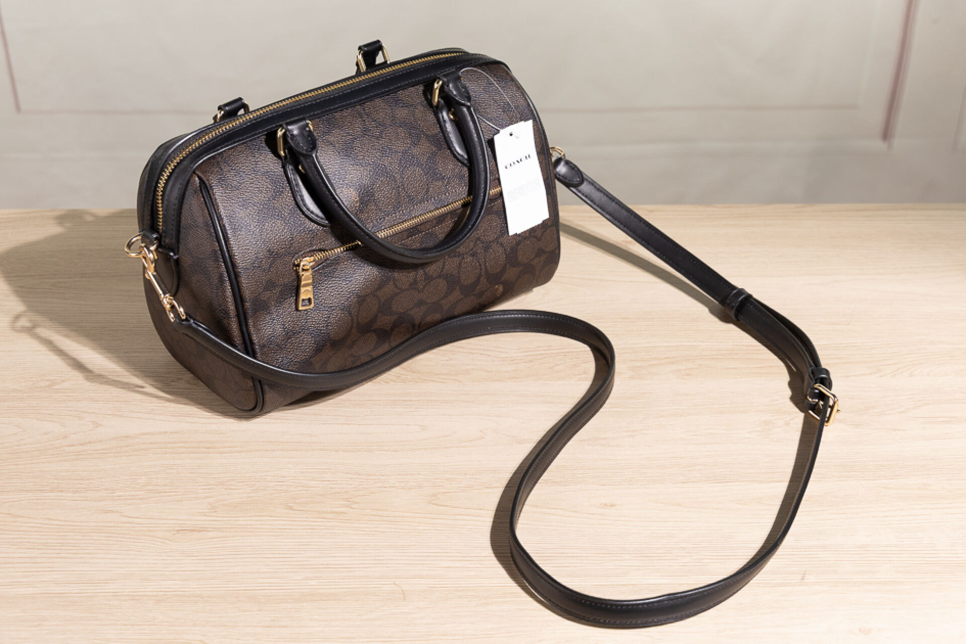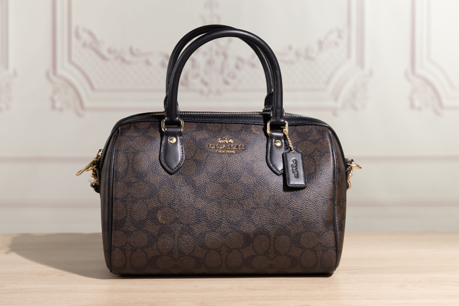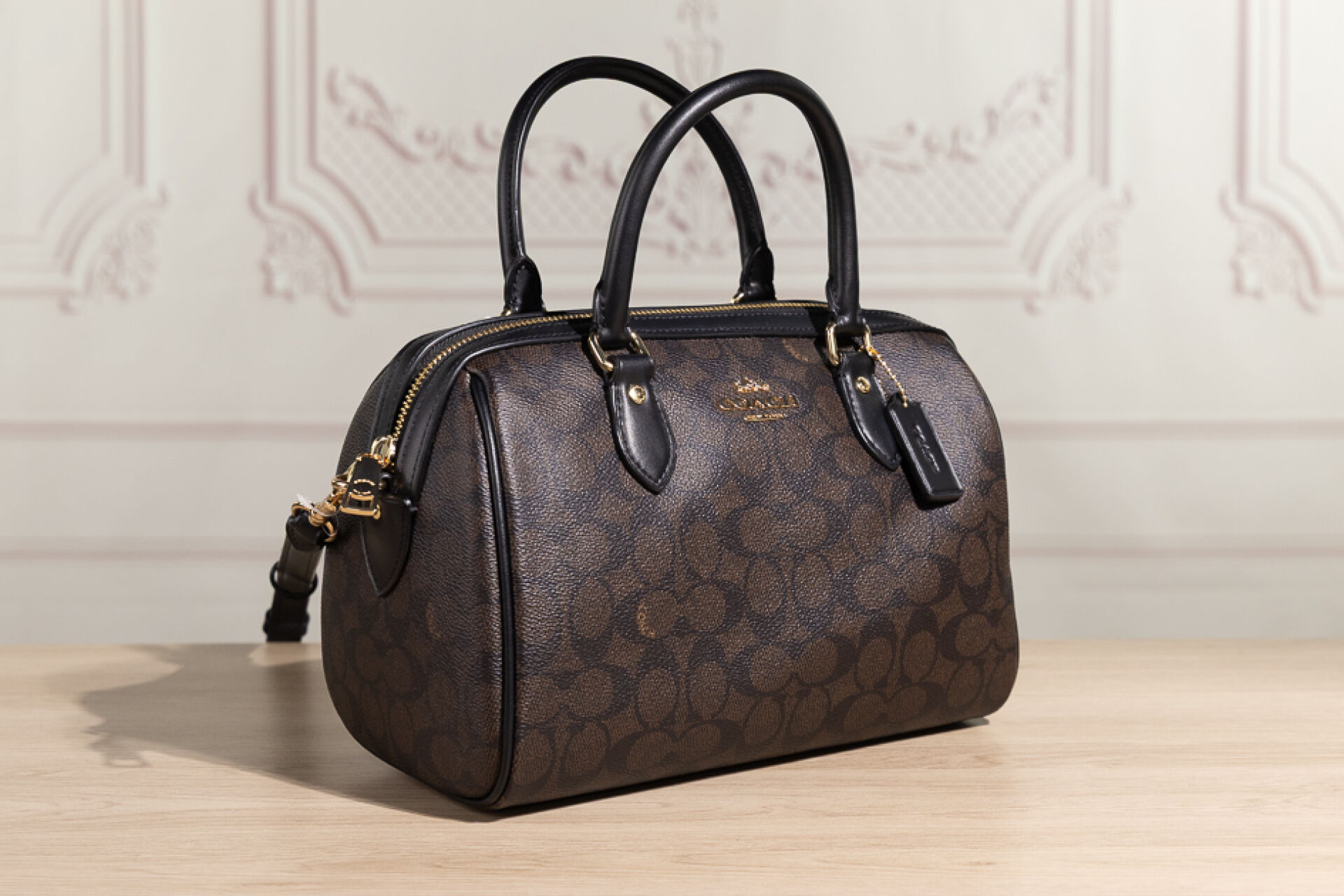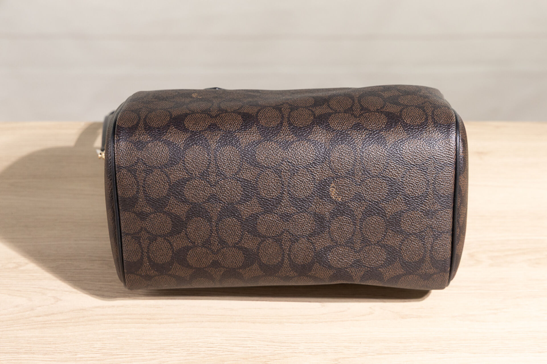 COACH - Petit sac bowling en toile enduite siglée marron et cuir noir, double poignée, fermeture à glissière, anse bandoulière amovible réglable, poche zippée au dos. Haut. : 18 cm - Long. : 25 cm Non porté
