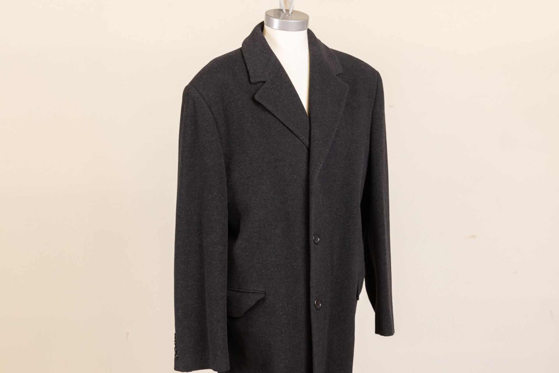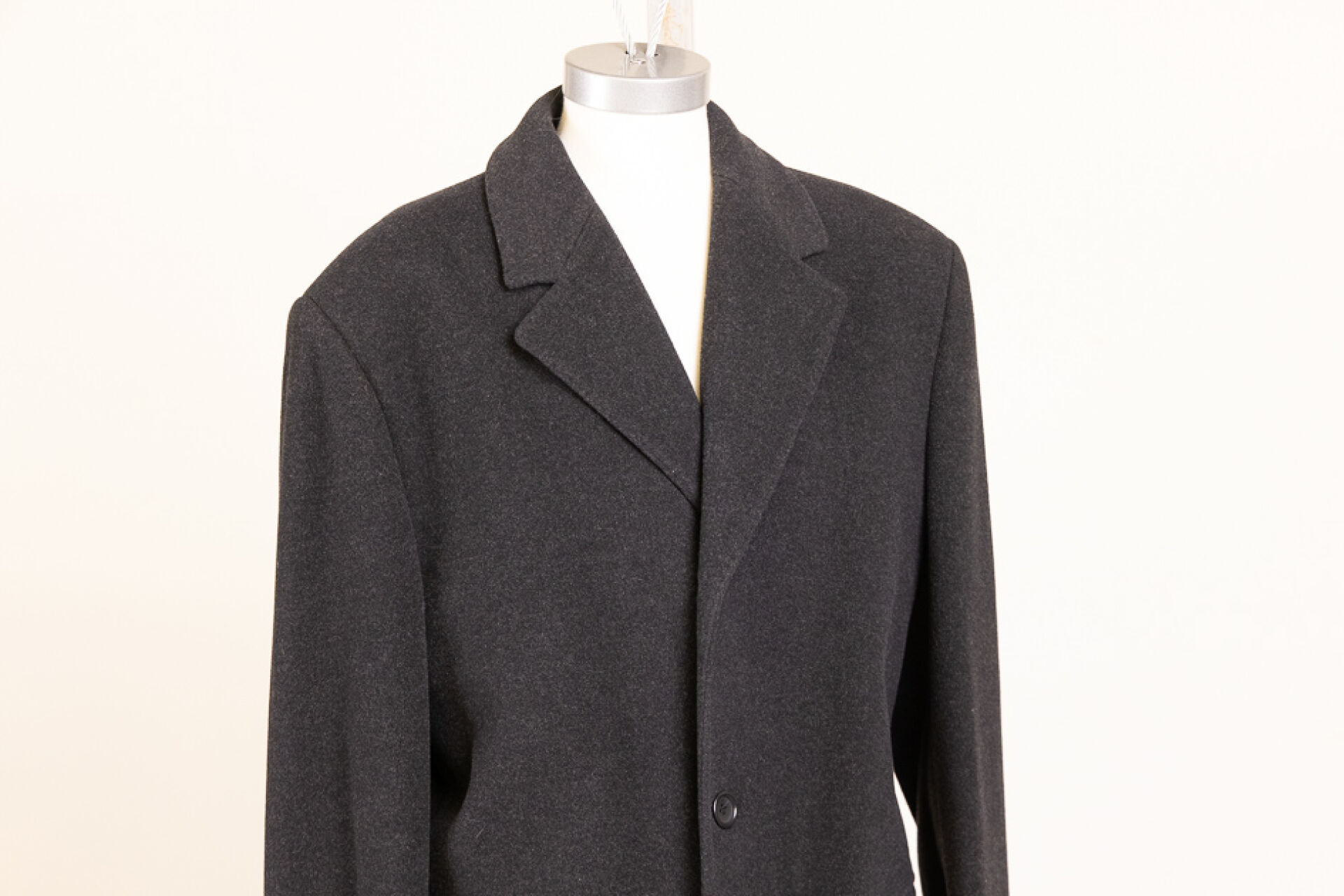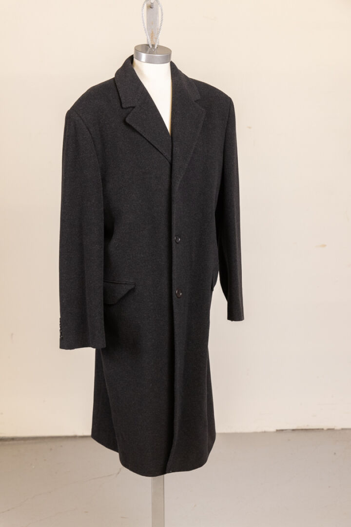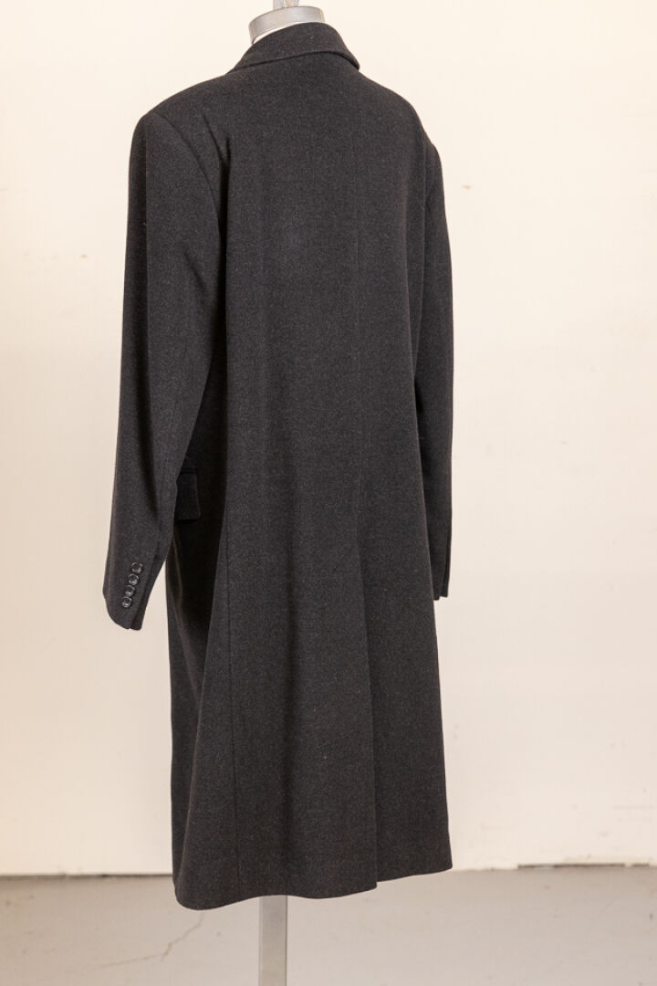 B.FIELD - Manteau d'homme modèle "Barone" en cachemire et laine anthracite, col cranté, simple boutonnage, manches longues, deux poches sous rabat, fente au dos. Taille indiquée 50