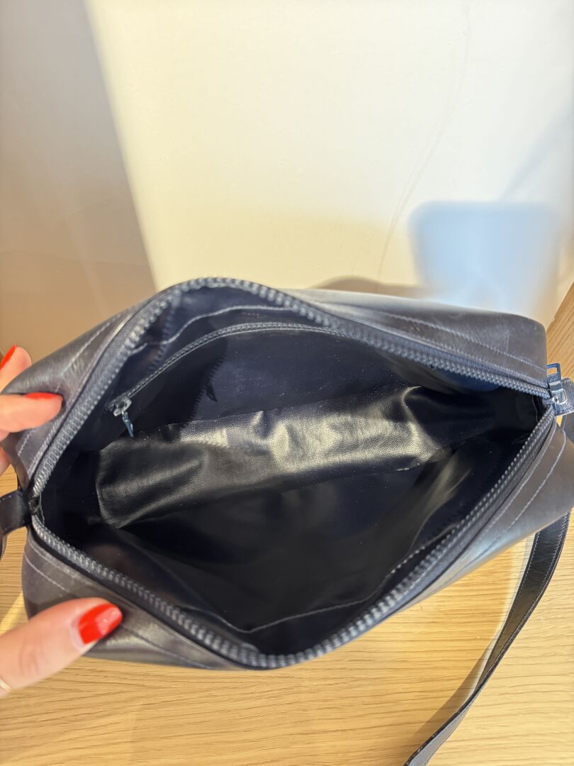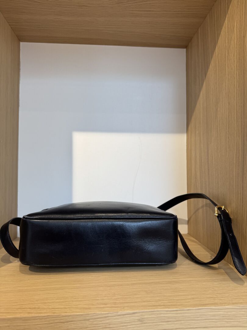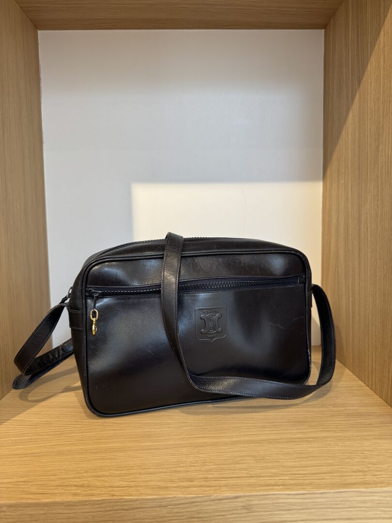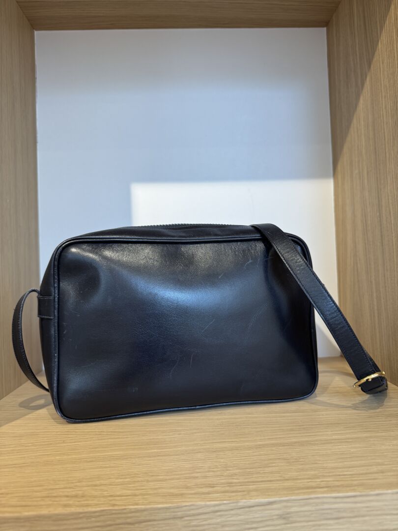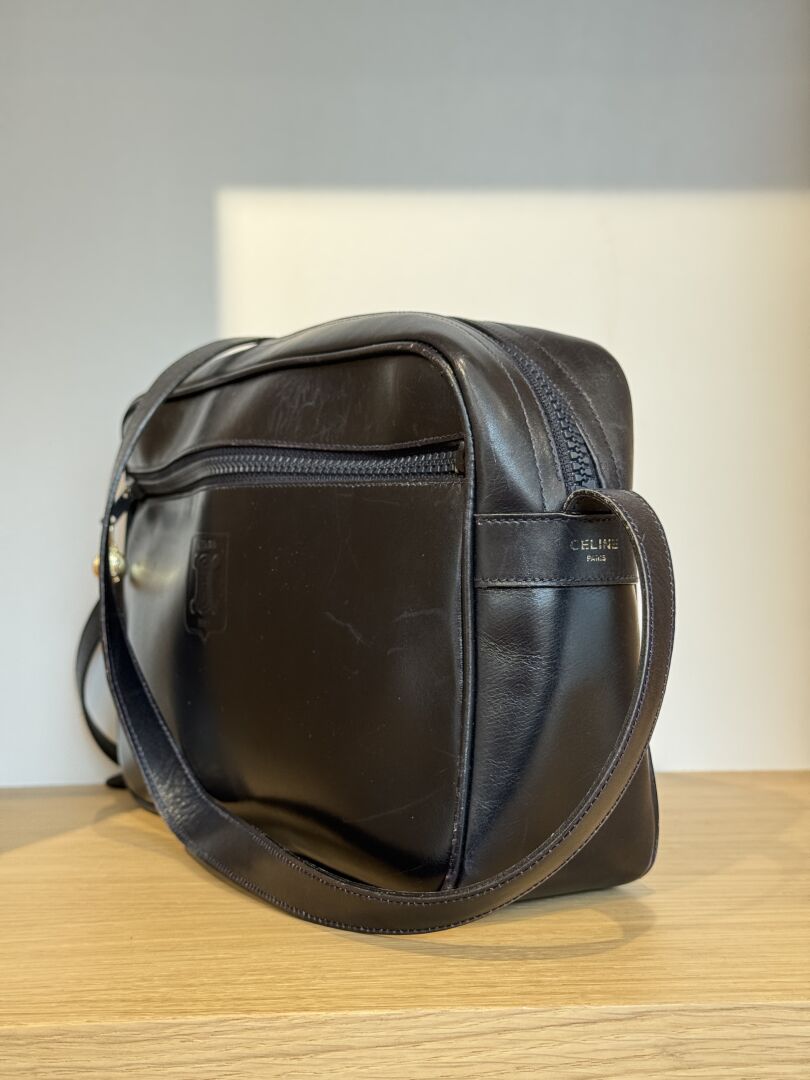 CELINE - Sac à main, cuir marine, fermeture à glissière, sigle de la Maison embossé, poches intérieure et extérieure zippées, anse bandoulière ajustable. Haut. : 17 cm - 25,5 cm Etat d'usage