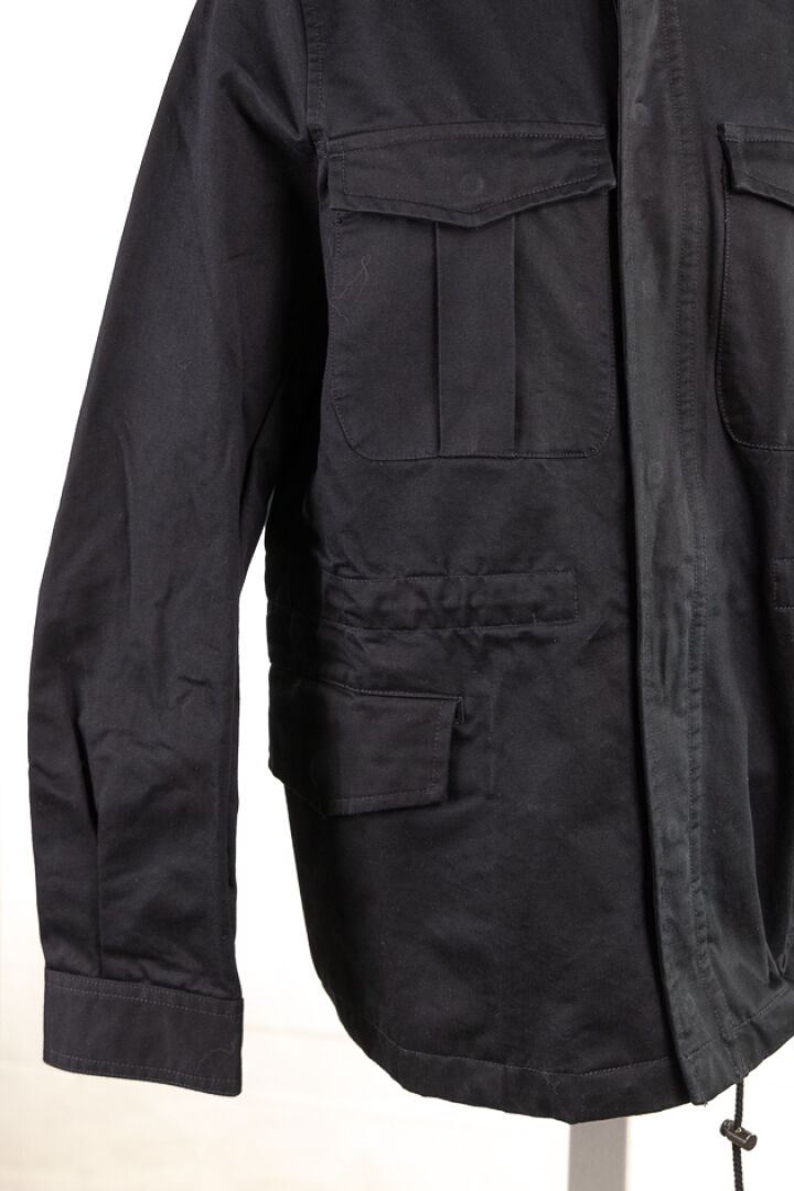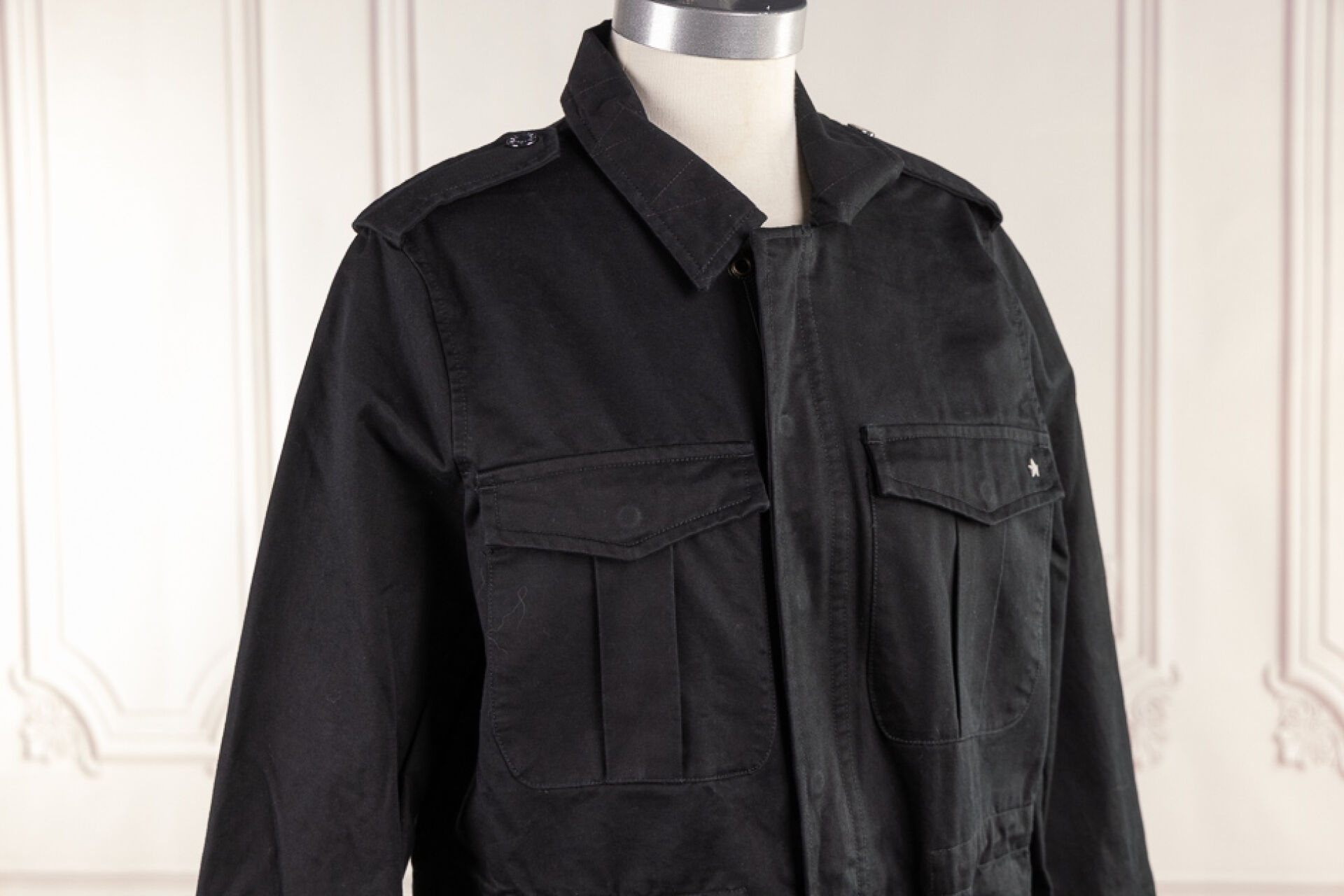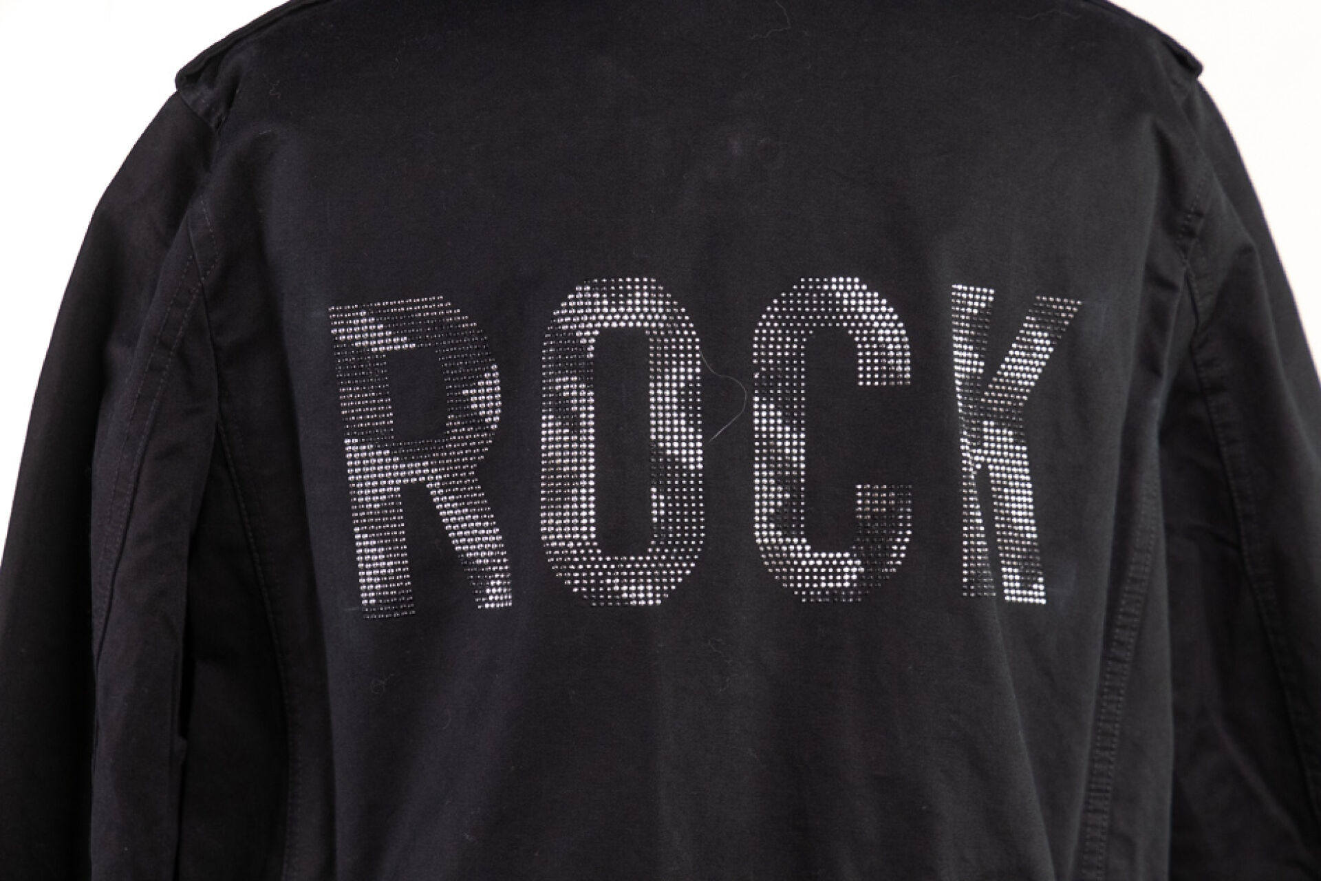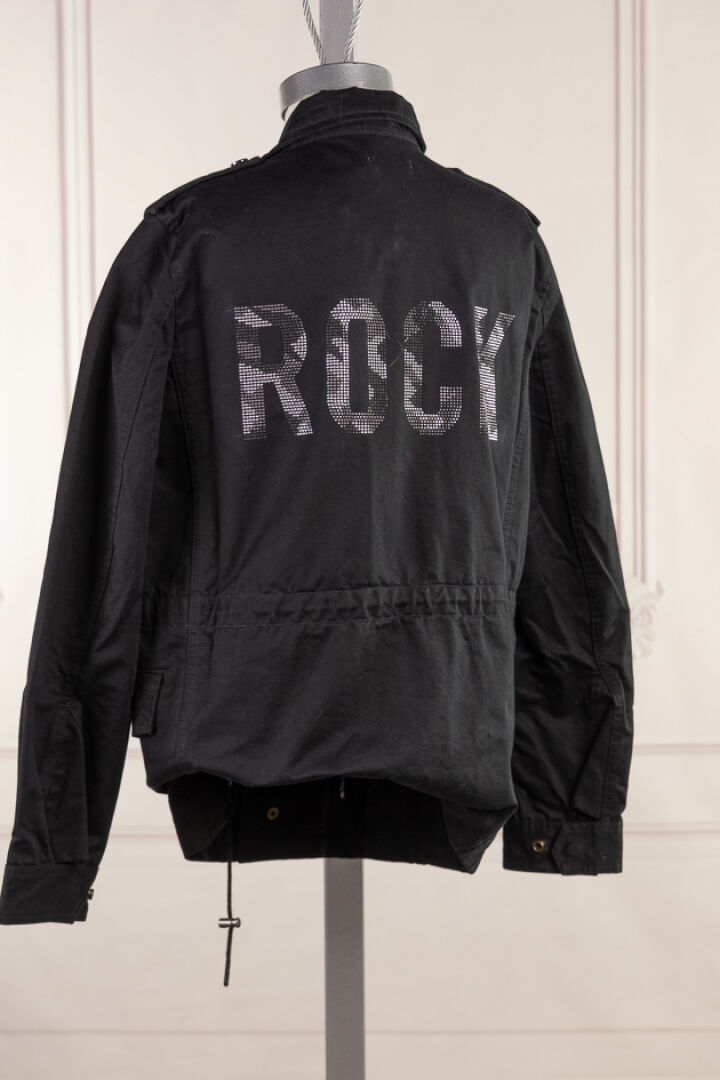 ZADIG & VOLTAIRE - Veste homme 3/4 en coton noir, col, pattes d'épaule, simple boutonnage pressions sous patte, quatre poches, manches longues, taille coulissée, dos portant l'inscription "ROCK" en paillettes. Taille L Non porté, étiquette d'origine
