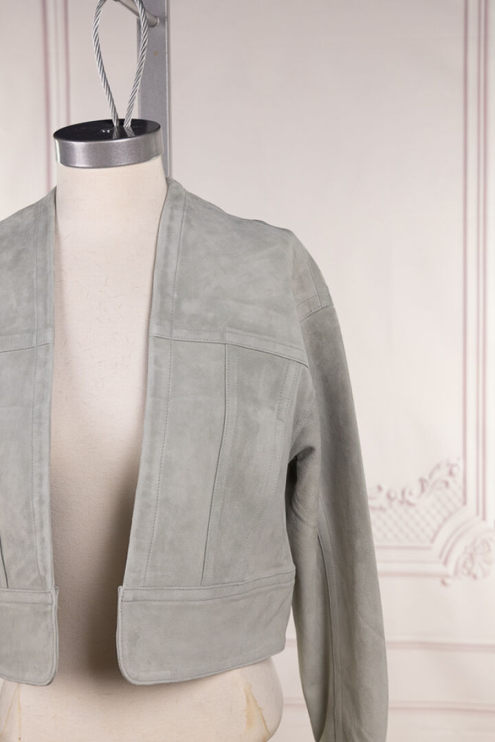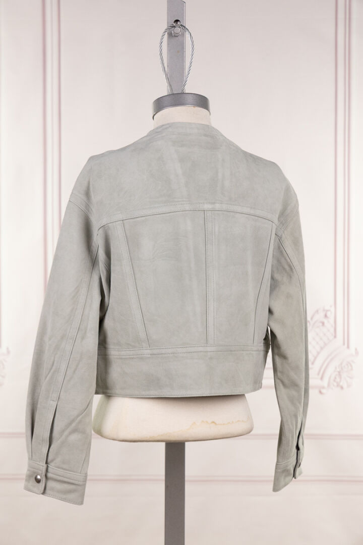 IRO - Blouson en daim gris/bleu, sans col sans boutonnage, à manches longues, deux poches verticales. Taille indiquée 38 Non porté, étiquette d'origine