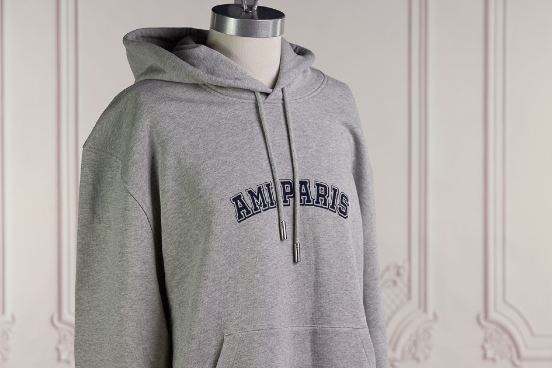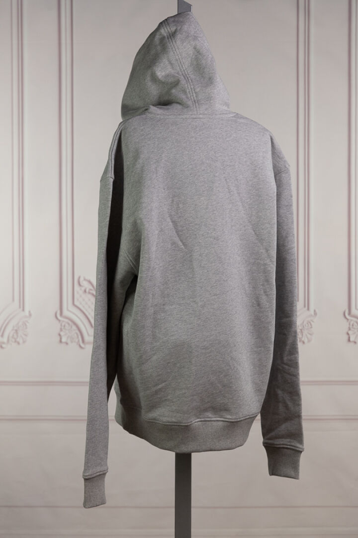 AMI par Alexandre Mattiussi - Sweat en coton chiné gris signé devant en lettres marine, à capuche coulissée, poche kangourou, manches longues. Taille indiquée XL Non porté, étiquette d'origine