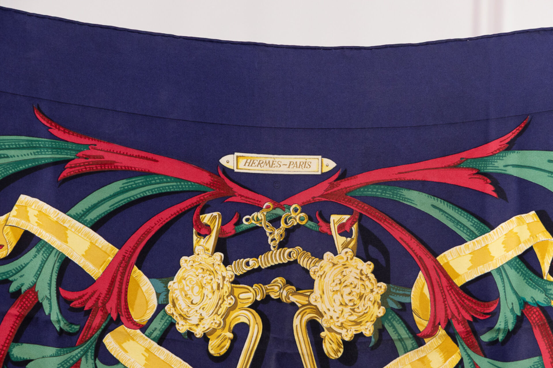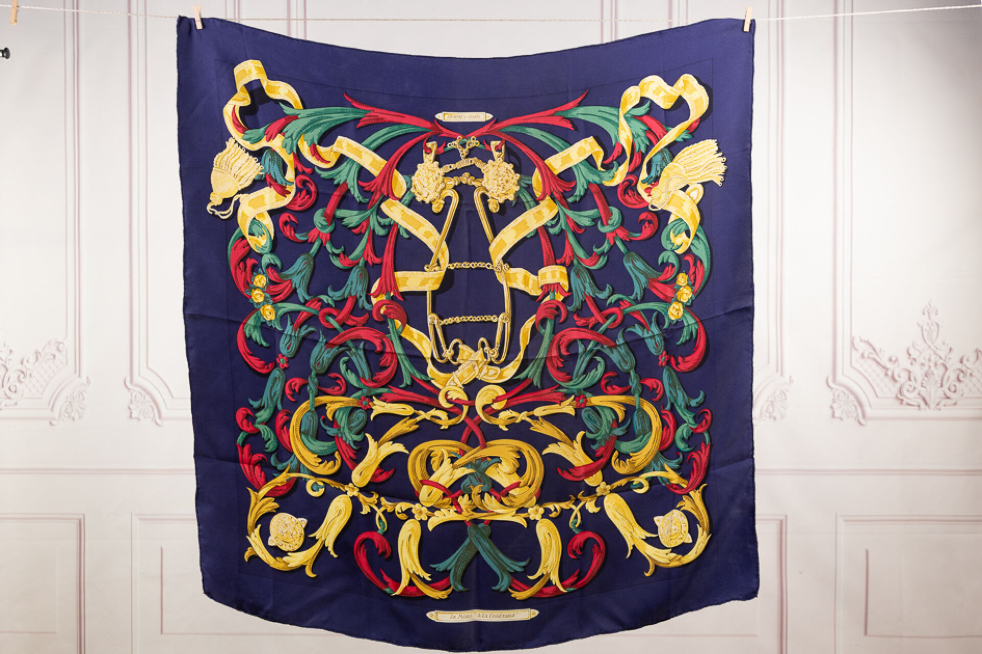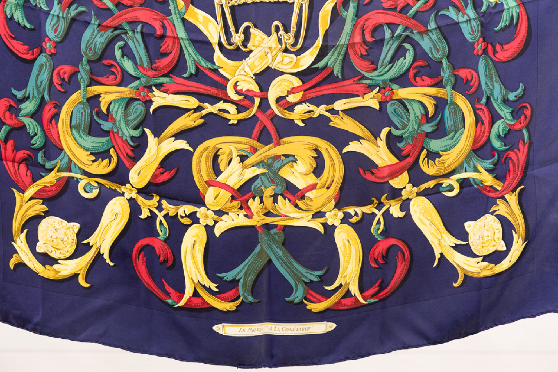 HERMES Paris - Carré en twill de soie imprimée titré "Le Mors à la Connétable", à dominantes vert, rouge, or sur fond marine. 90 x 90 cm Quelques traces