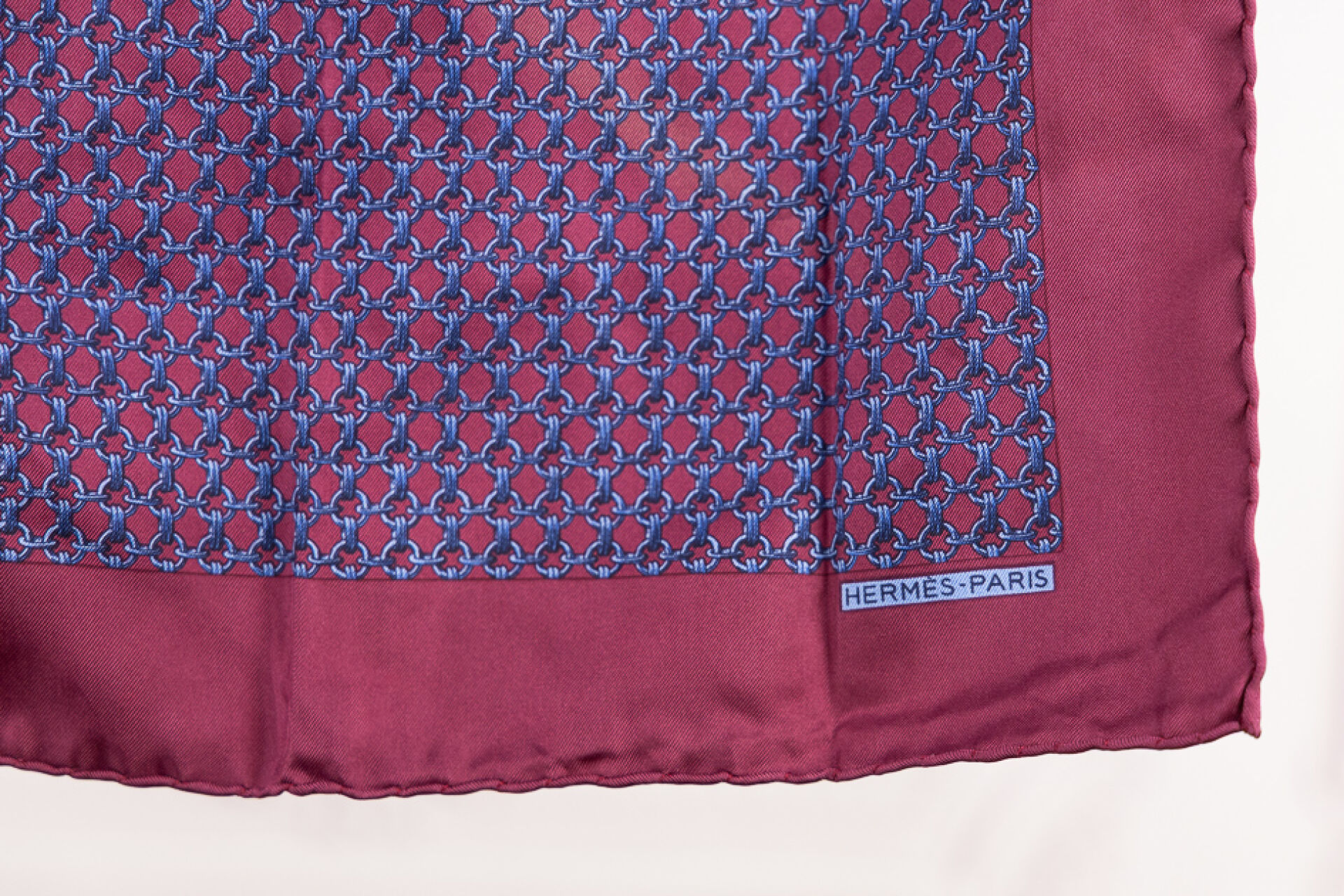 HERMES Paris - Pochette en twill de soie imprimée d'anneaux acier en croisillons sur fond bordeaux. 40 x 40 cm Quelques tâches