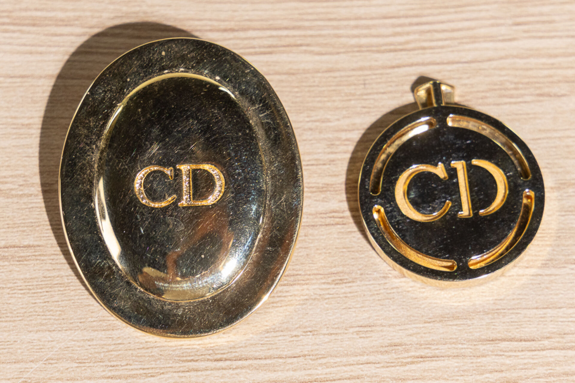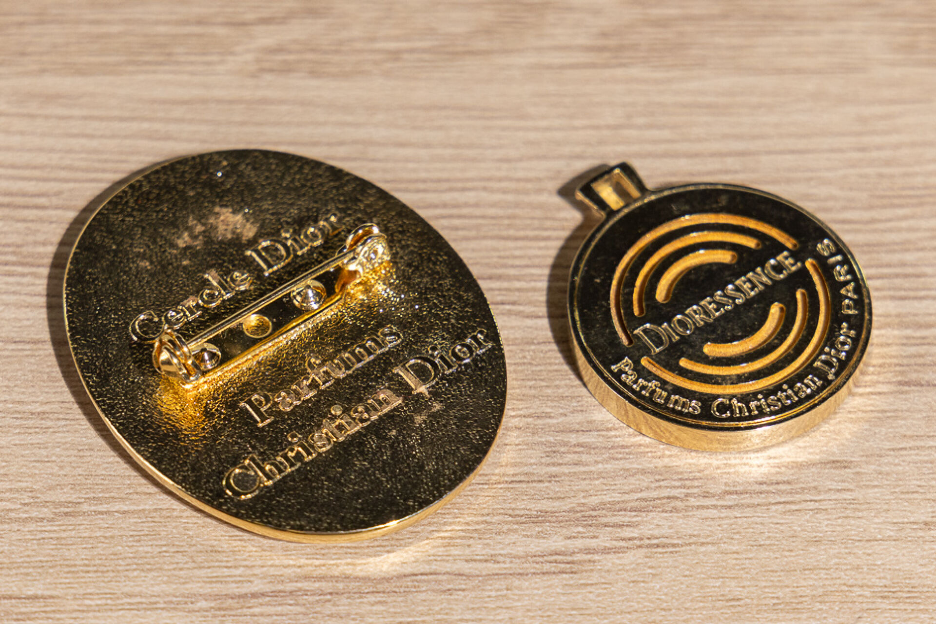 CHRISTIAN DIOR - Ensemble comprenant une broche et un pendentif en métal doré, initial "CD". La broche signée au dos "Cercle Dior - Parfums Christian Dior" Le pendentif signé au dos "Dioressence - Parfums Christian Dior Paris"