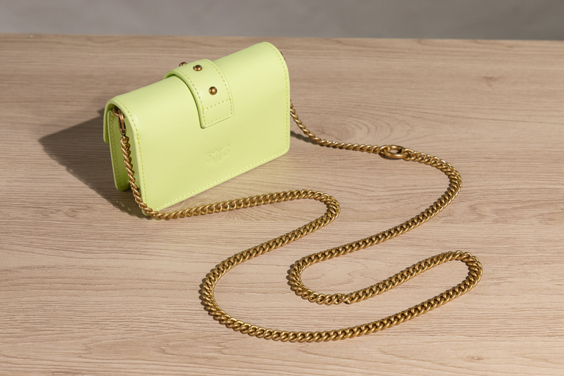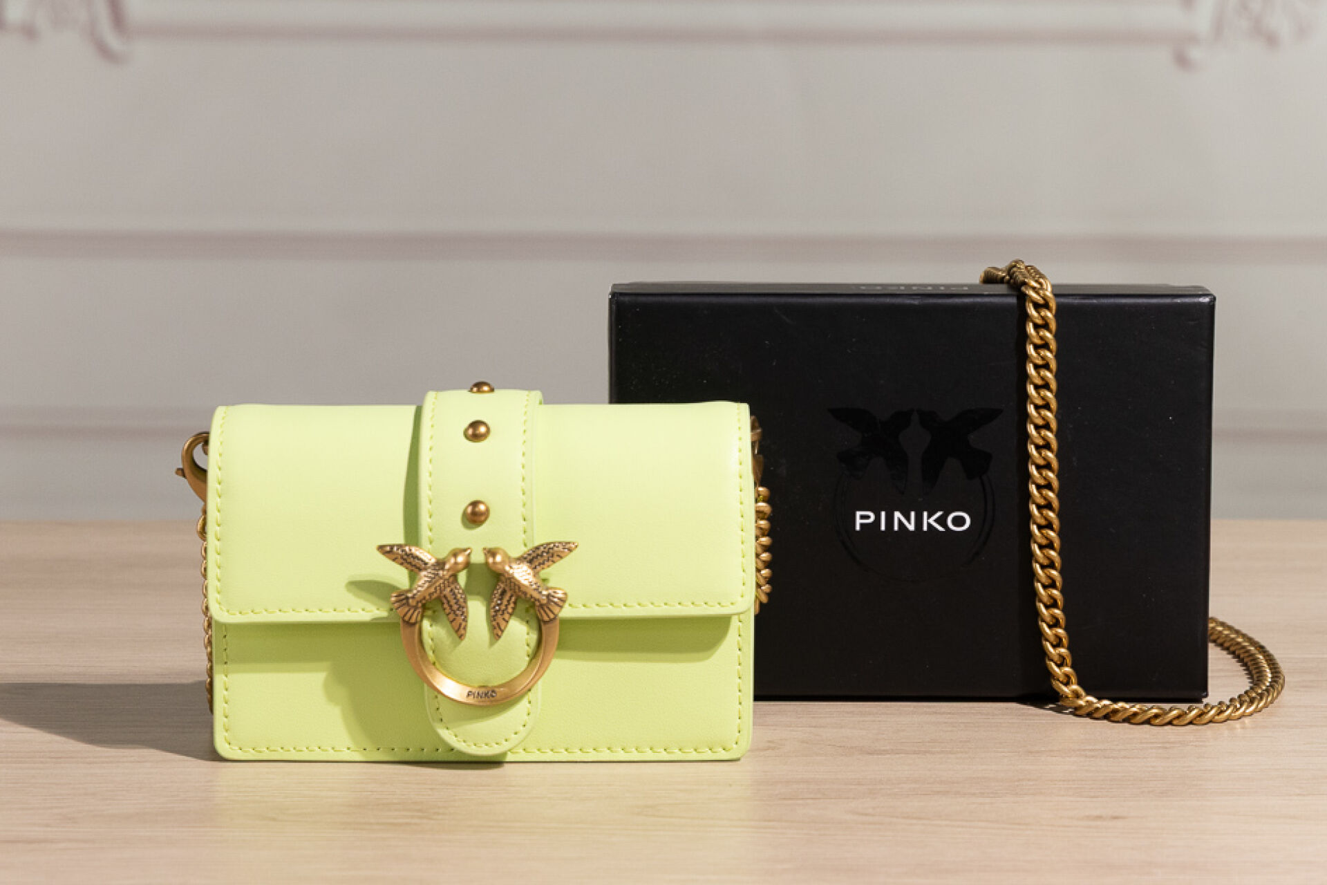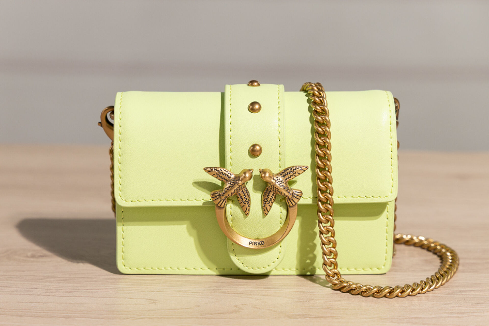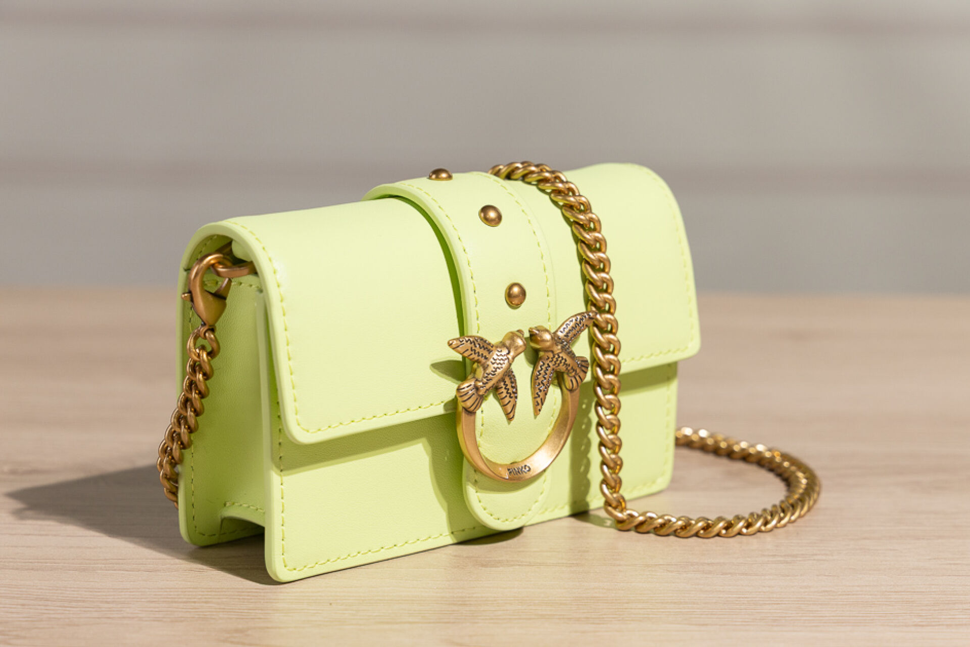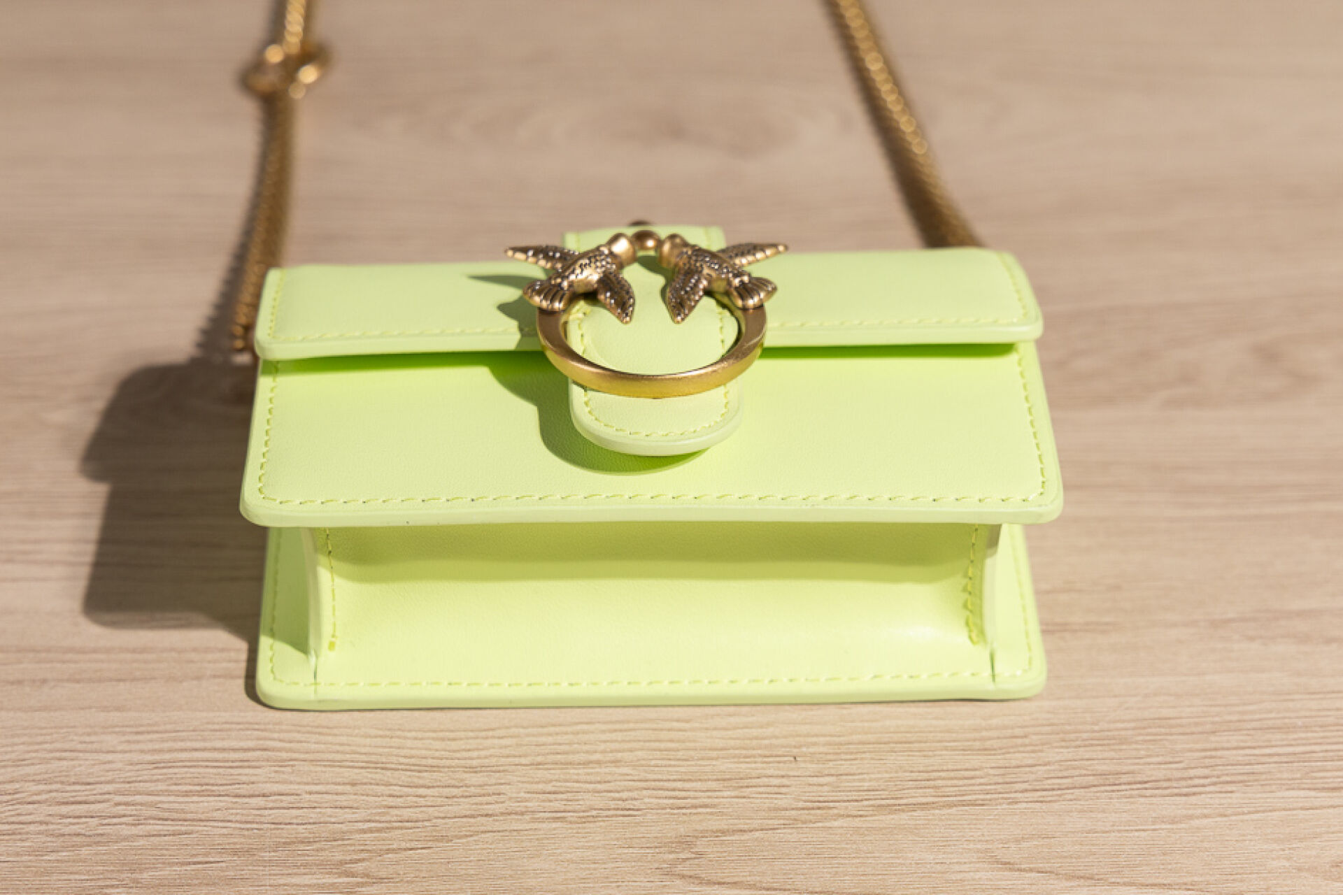 PINKO - Mini sac vert pistache, fermoir aimanté sous rabat rehaussé des deux oiseaux, anse chaine amovible. Boite. Haut. : 8,5 cm - Long. : 13 cm État neuf