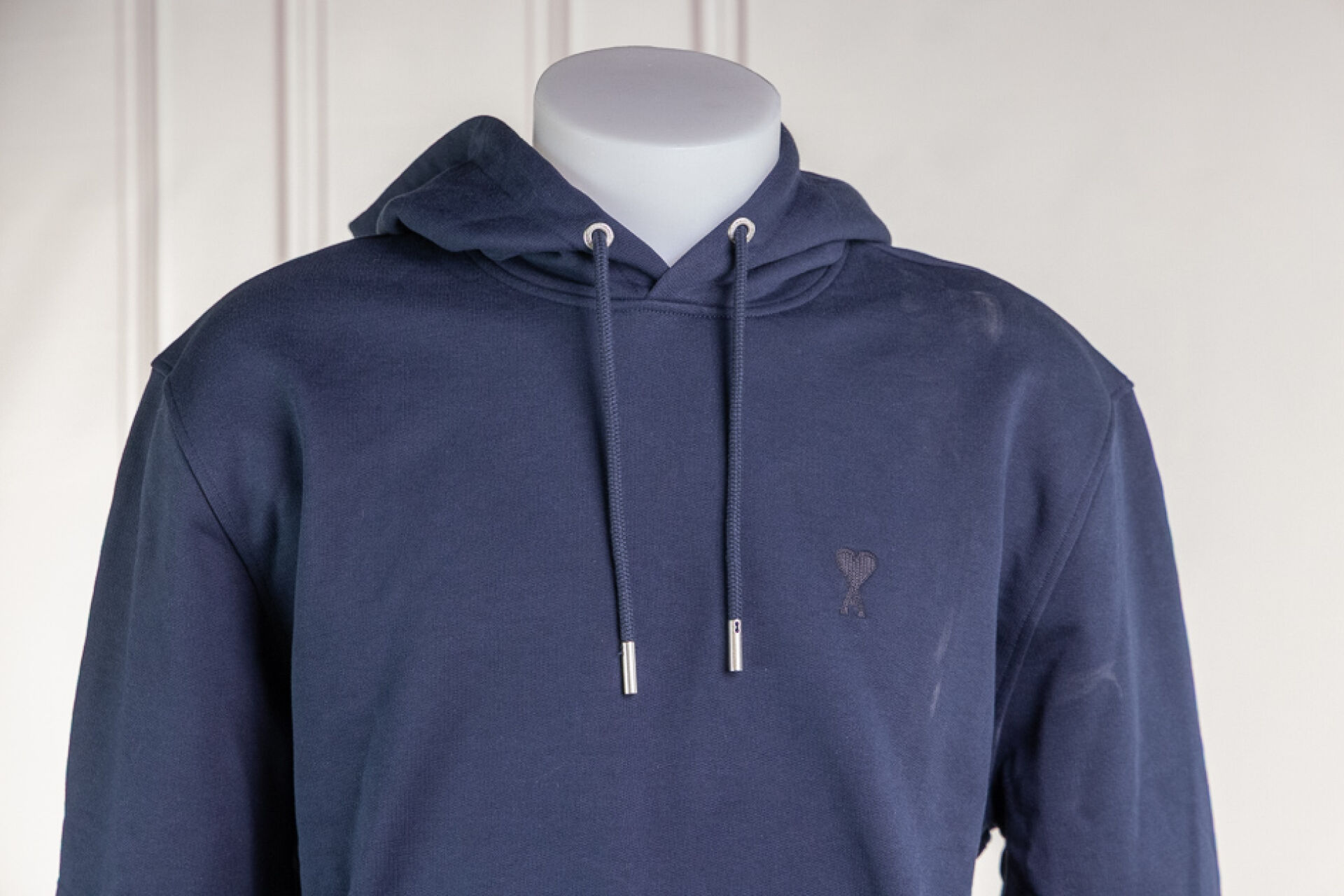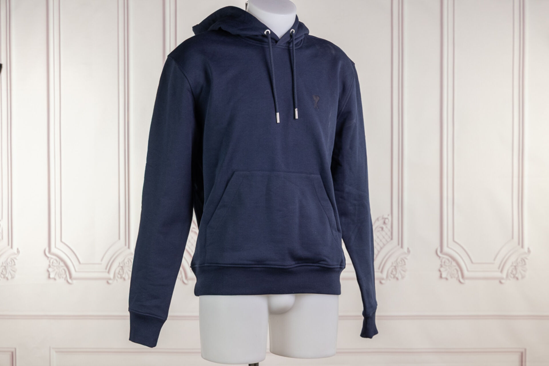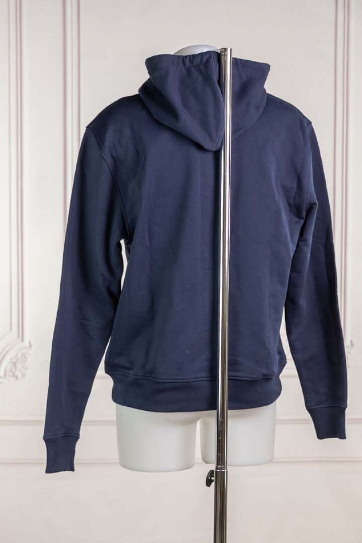 AMI par ALEXANDRE MATTIUSSI - Sweat à capuche coulissée en coton marine, manches longues, poche kangourou. Taille indiquée M Non porté, étiquette d'origine, cependant salissures et poussière