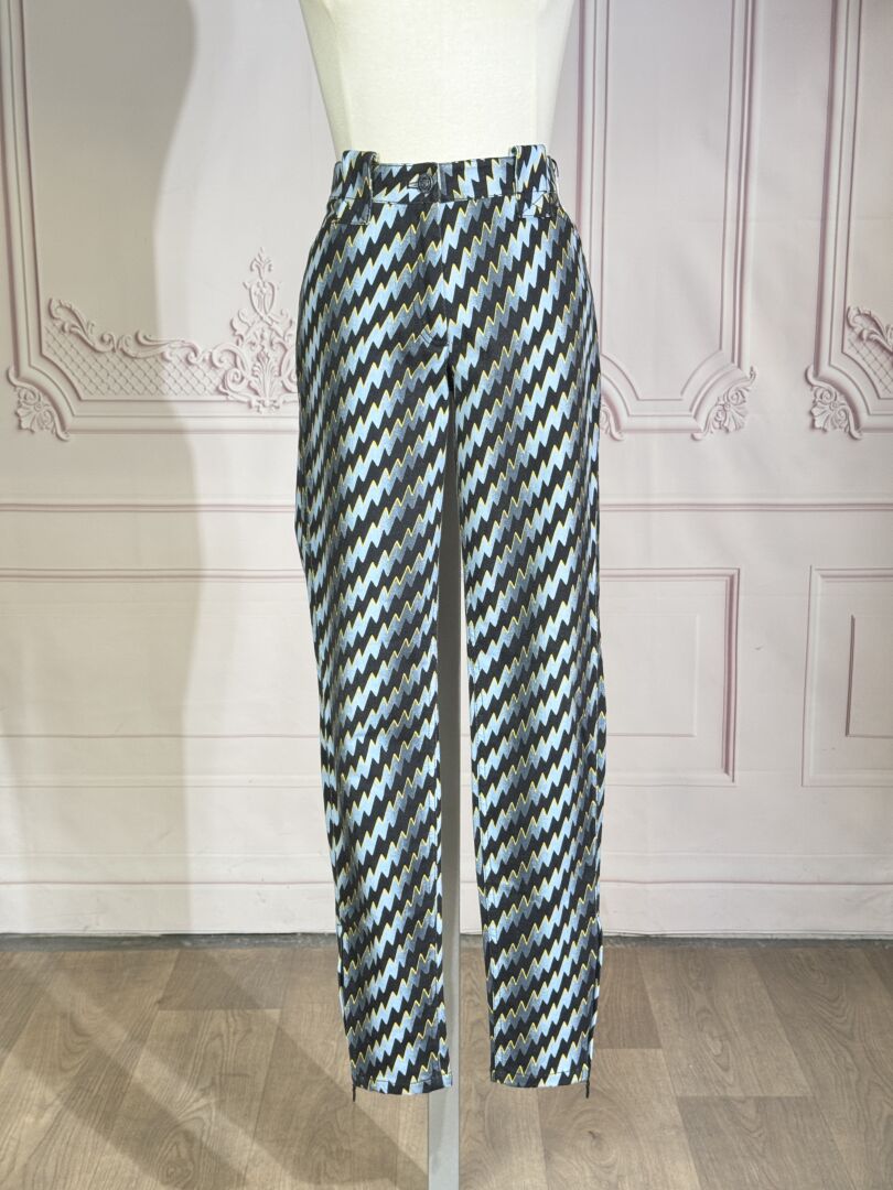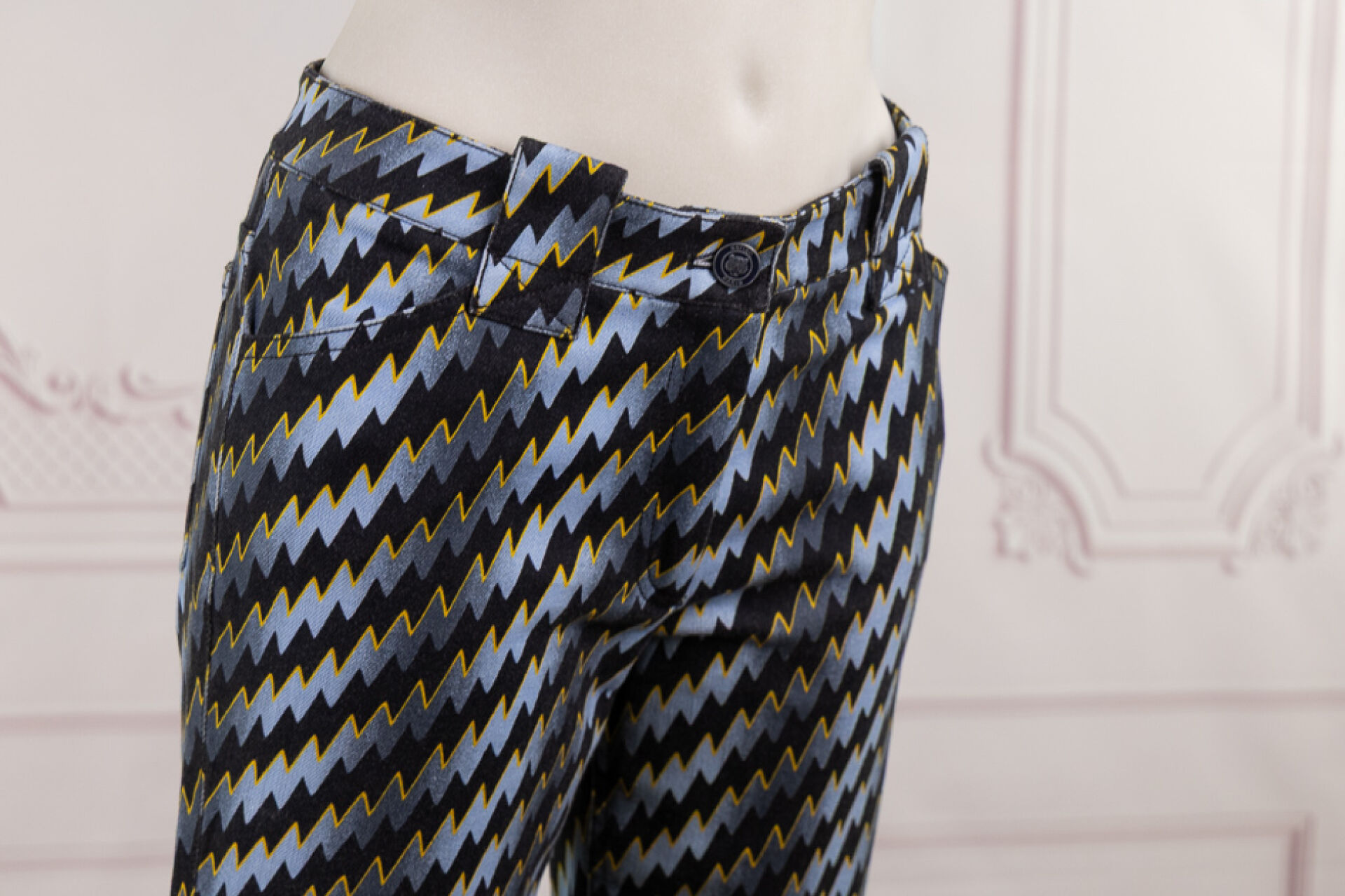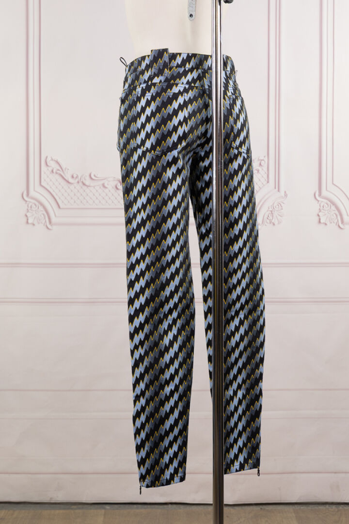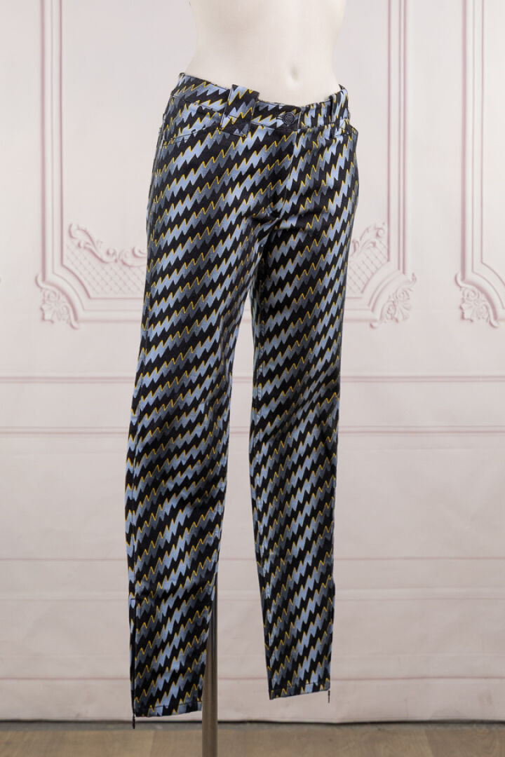 KENZO - Pantalon slim denim à motifs d'éclairs en biais noir, jaune, gris et bleu, fermetures zippées à la cheville. Taille indiquée 38 Bon état