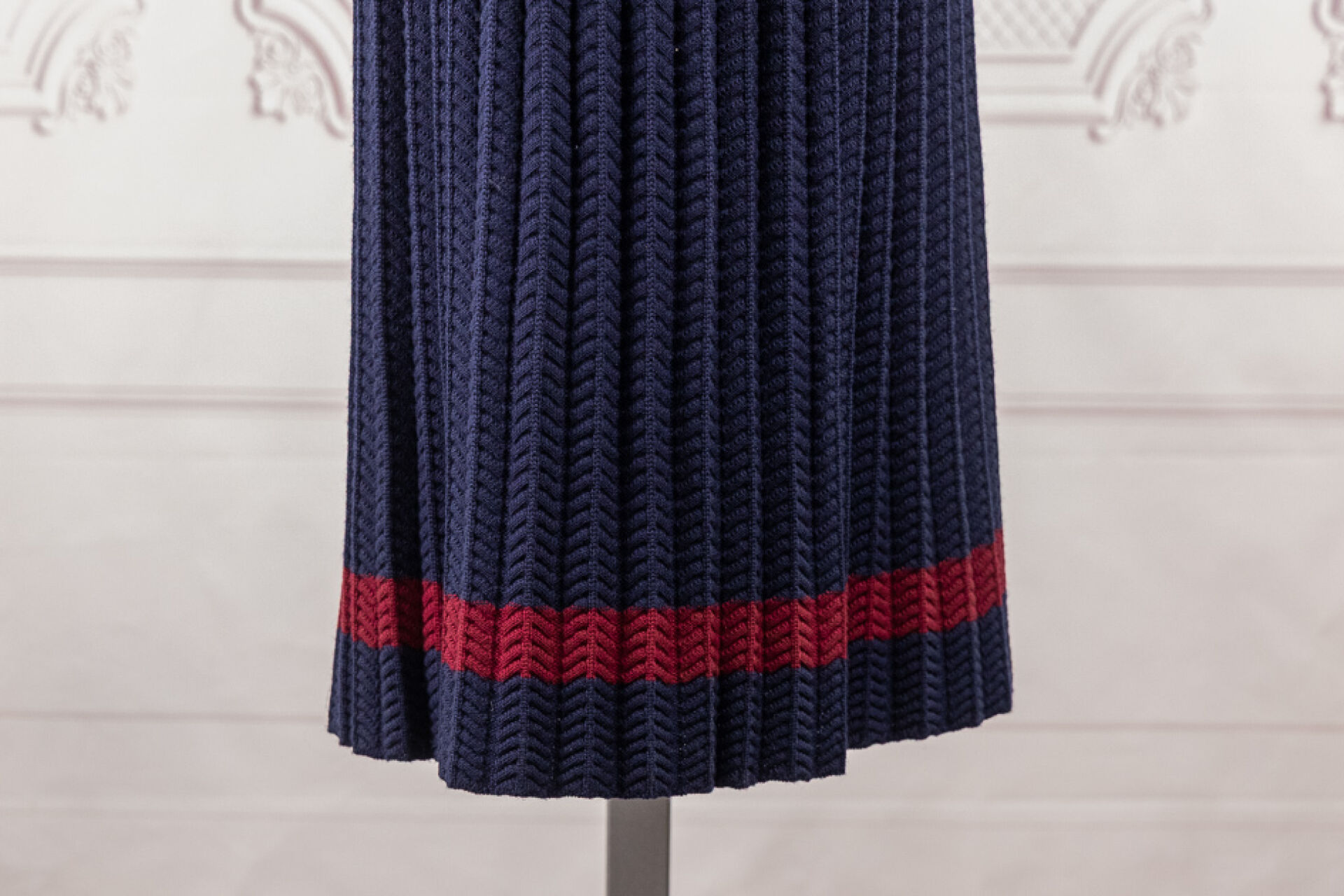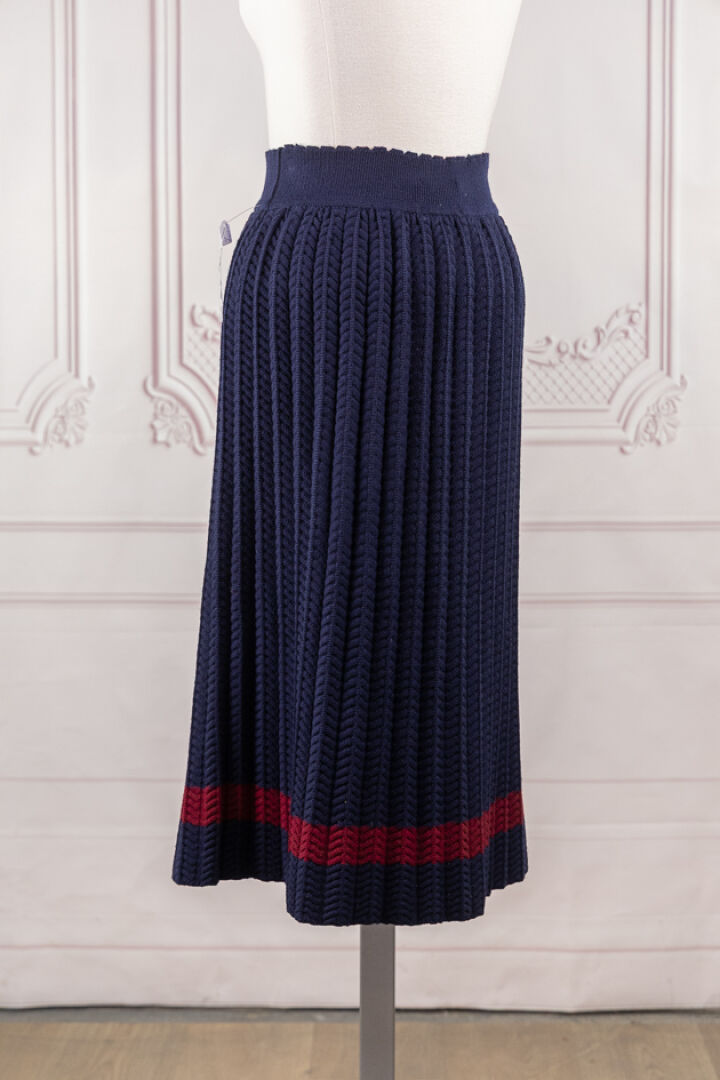 MOLLI - Jupe mi longue, mailles fantaisie marine, liseré bordeaux dans le bas. Taille S Très bon état