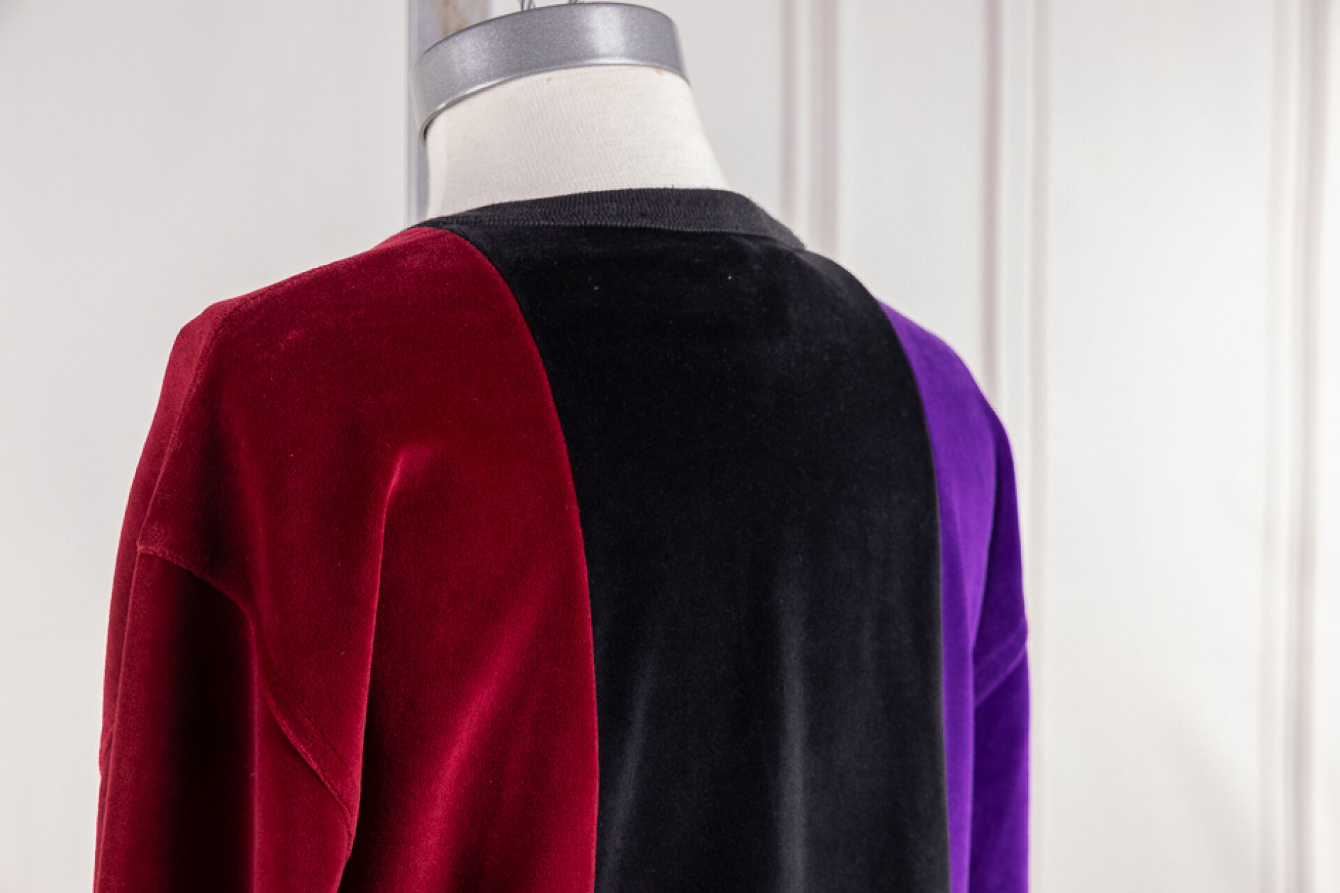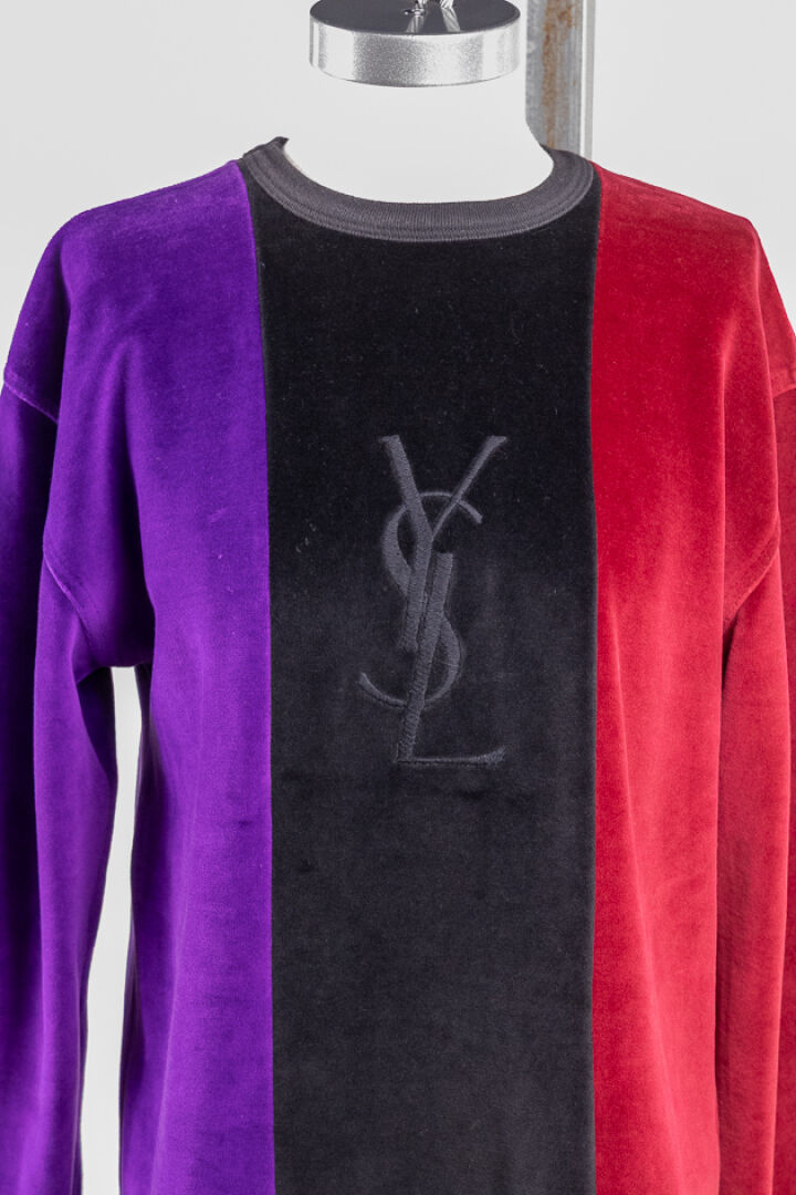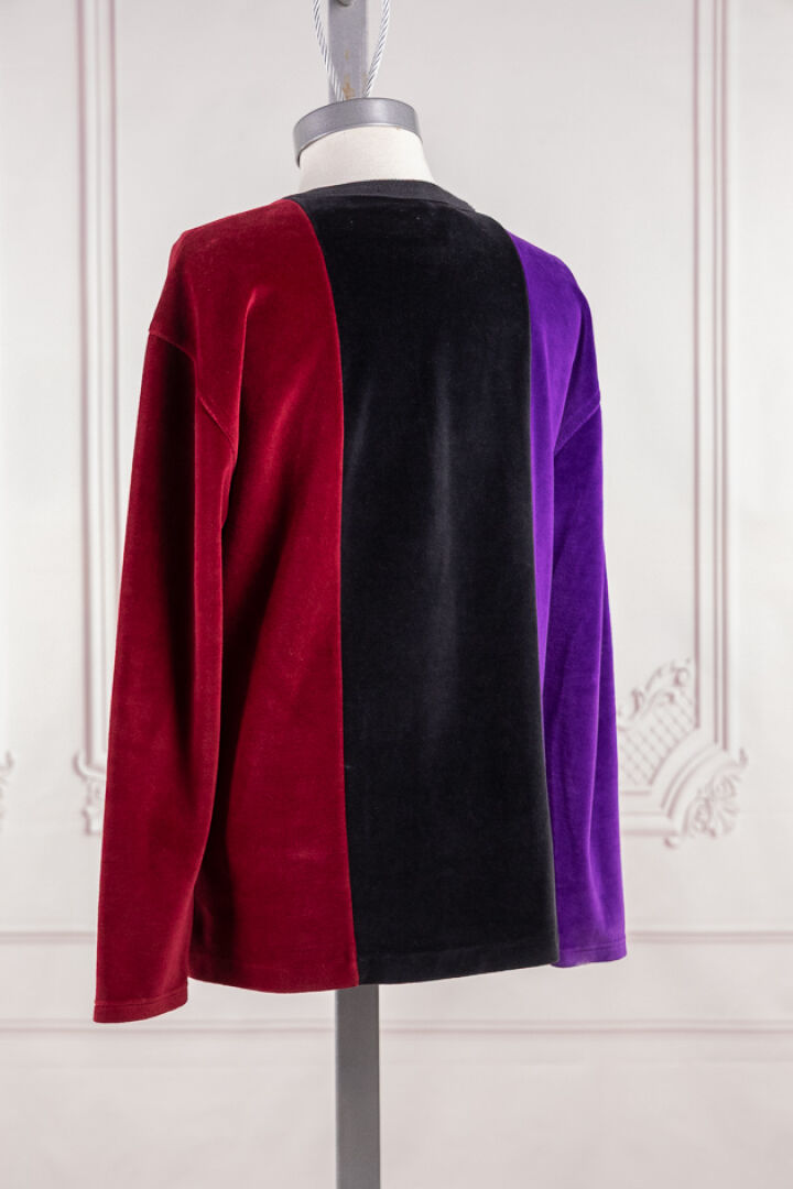 YVES SAINT LAURENT Variation - Pull en velours tricolore violet, noir et bordeaux, encolure ronde, manches longues. Taille indiquée M Déjà porté, très bon état