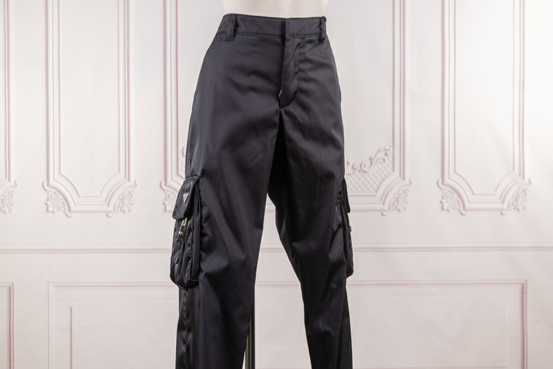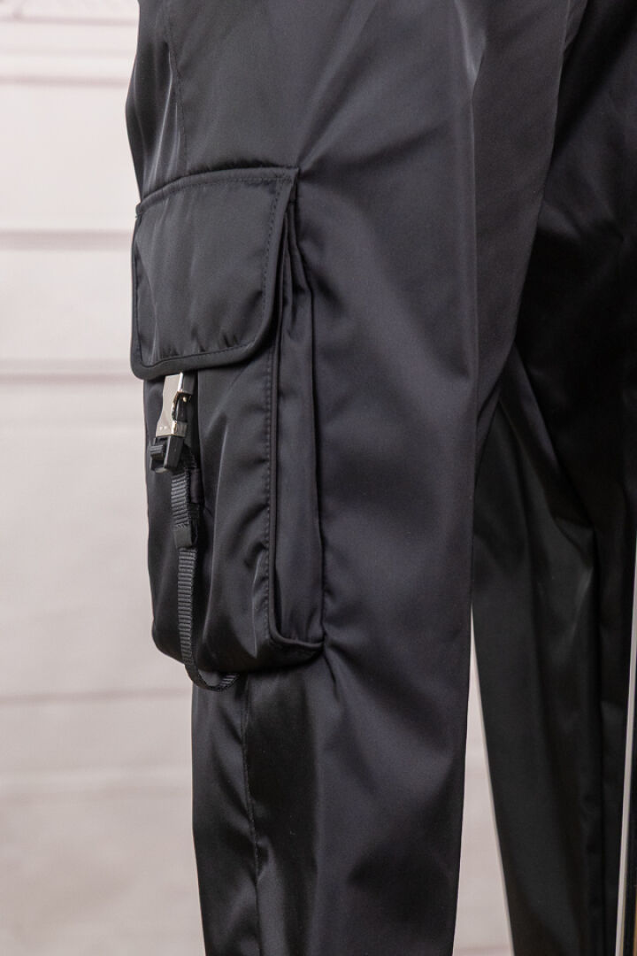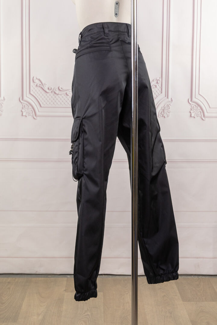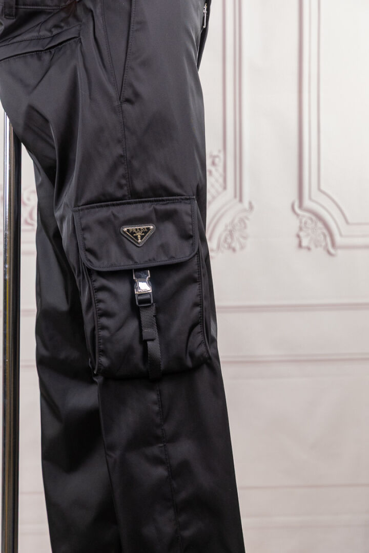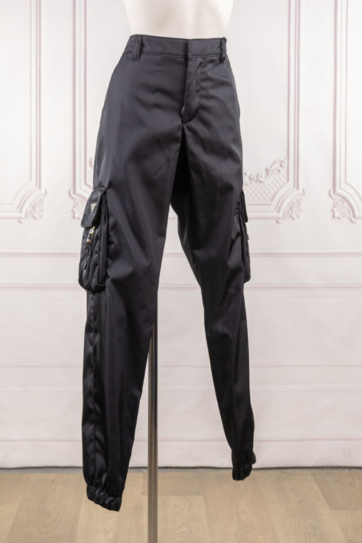 PRADA - Pantalon en re nylon noir, deux larges poches plaquées sous sangles et bas élastique. Taille indiquée 48 Non porté - Etiquette d'origine