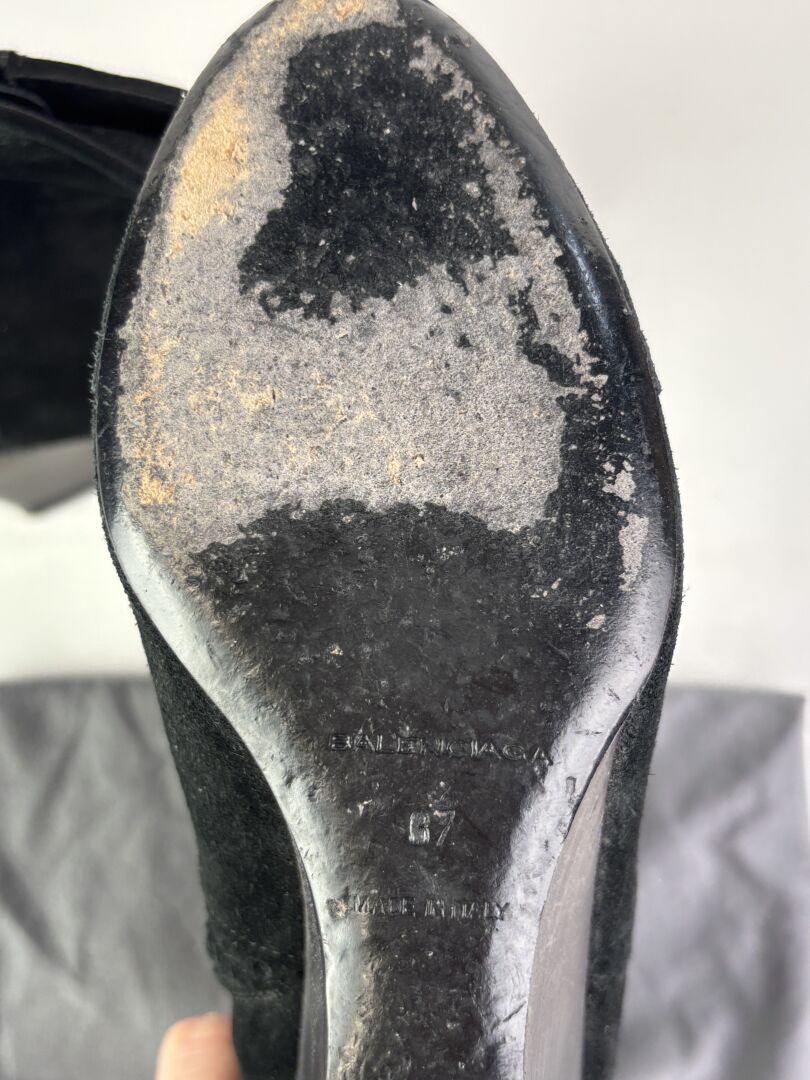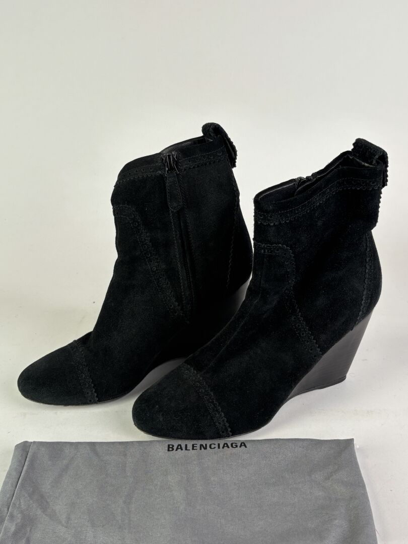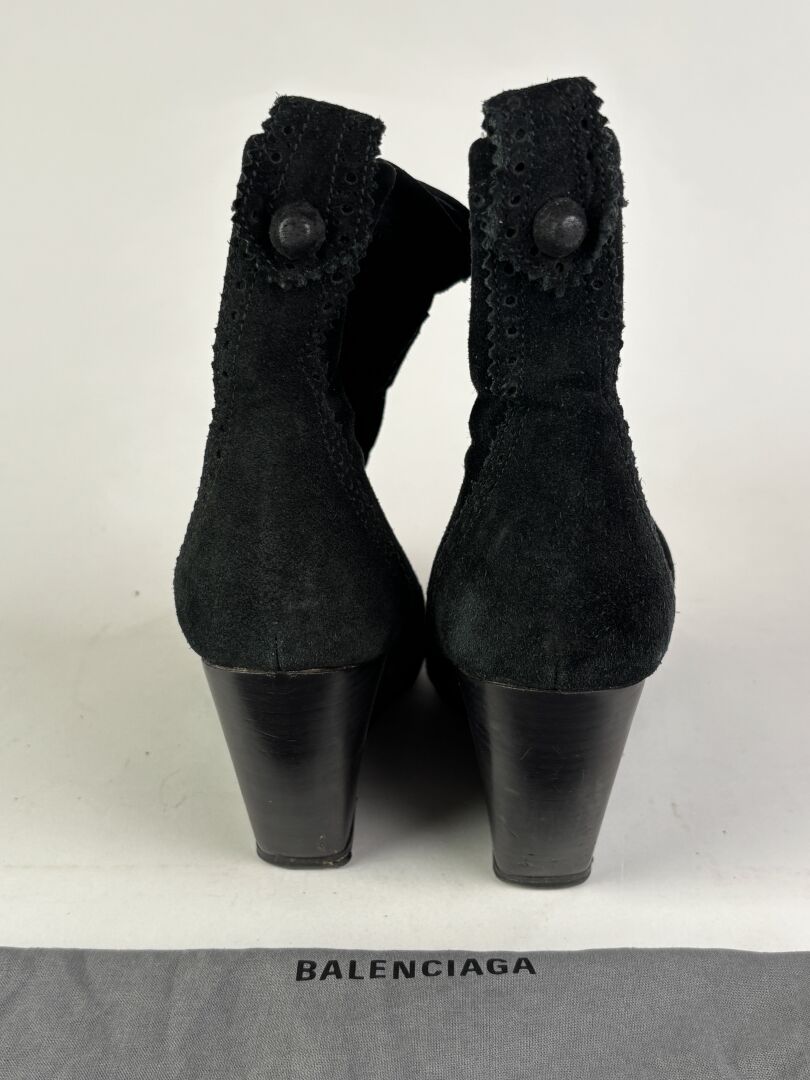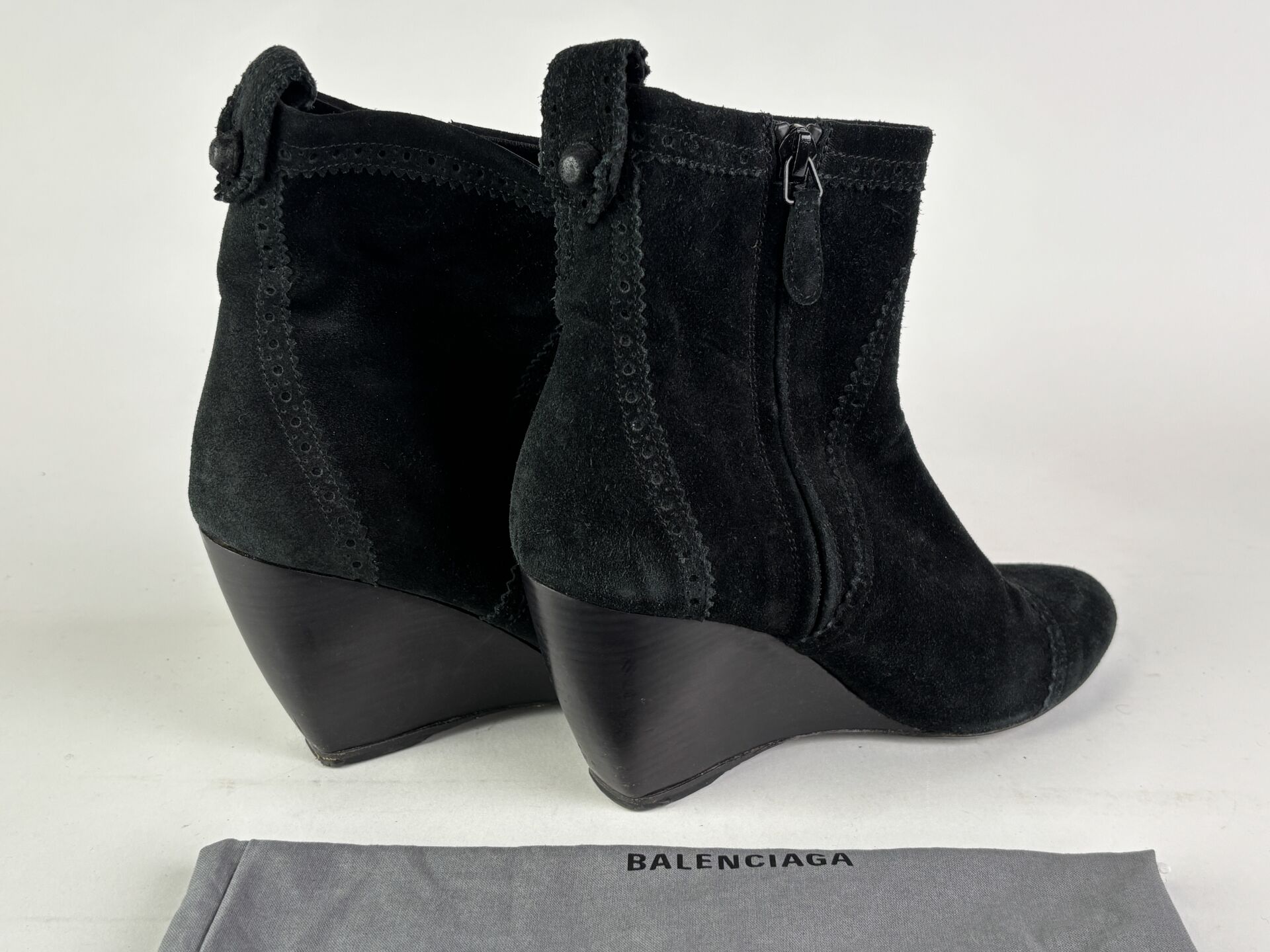BALENCIAGA - Paire de bottines montantes en daim noir, talons compensés, fermeture latérale. Pointure 37 - Haut. du talon : 7,5 cm Bon état général