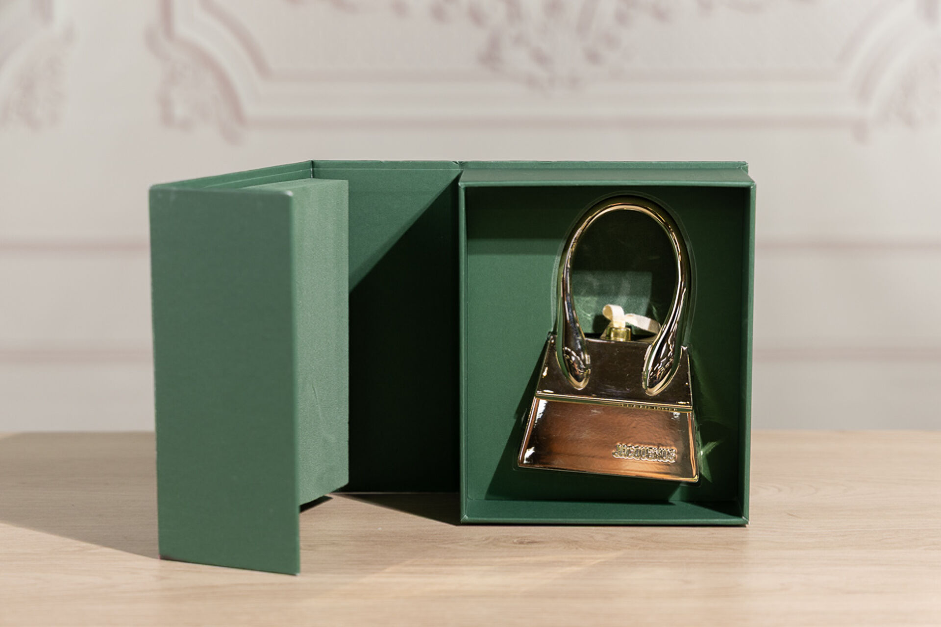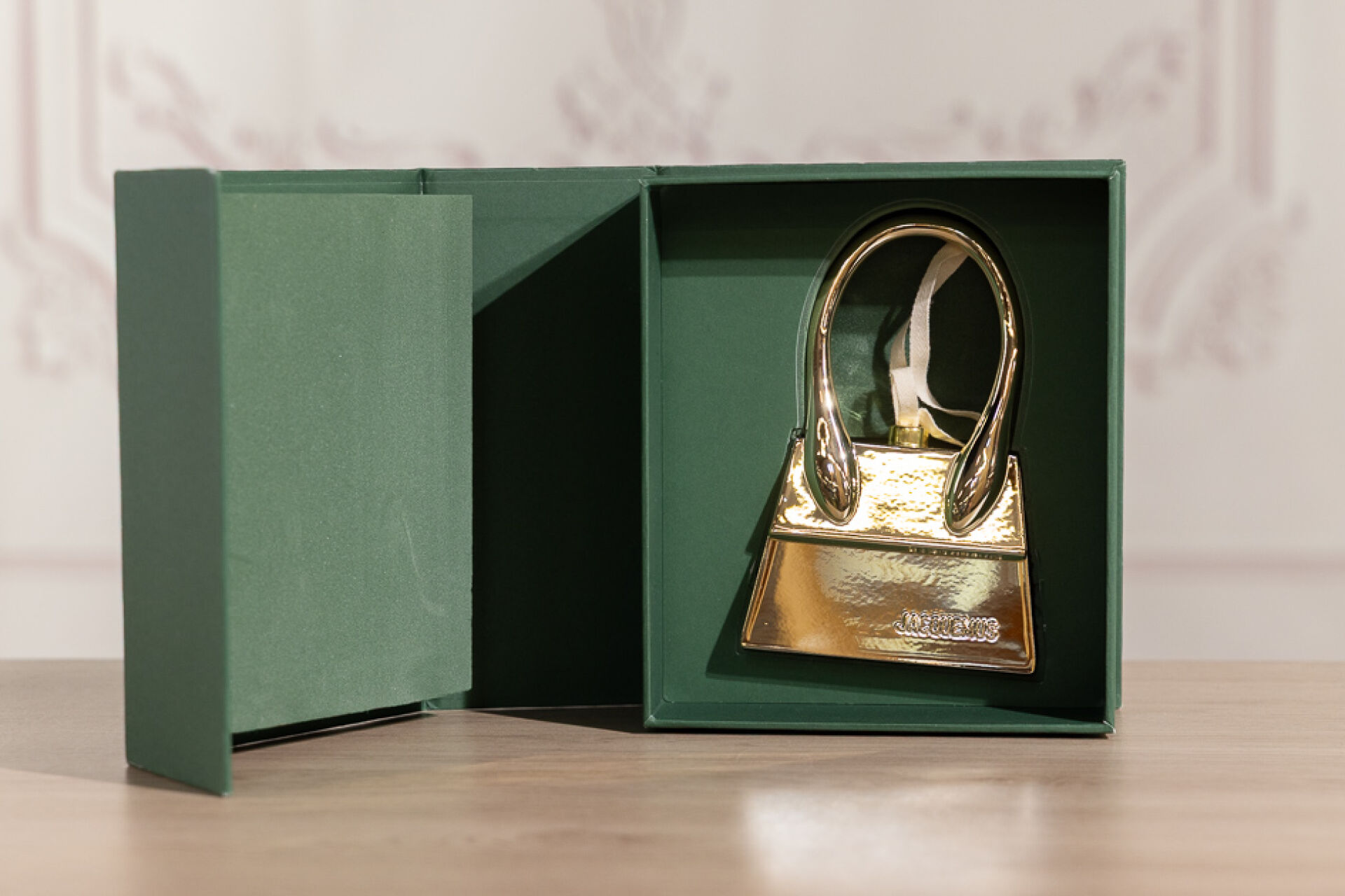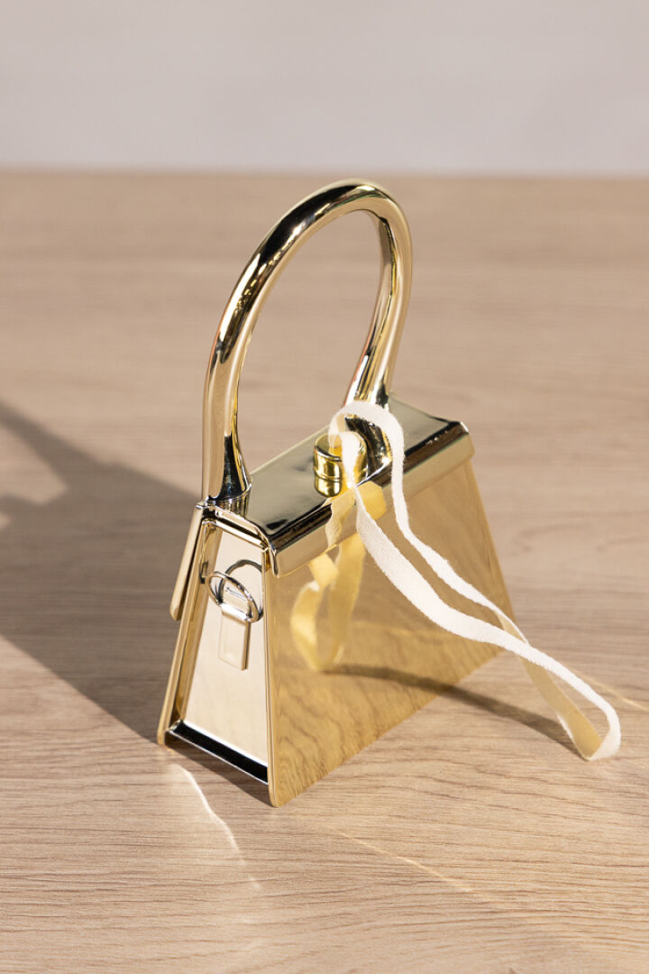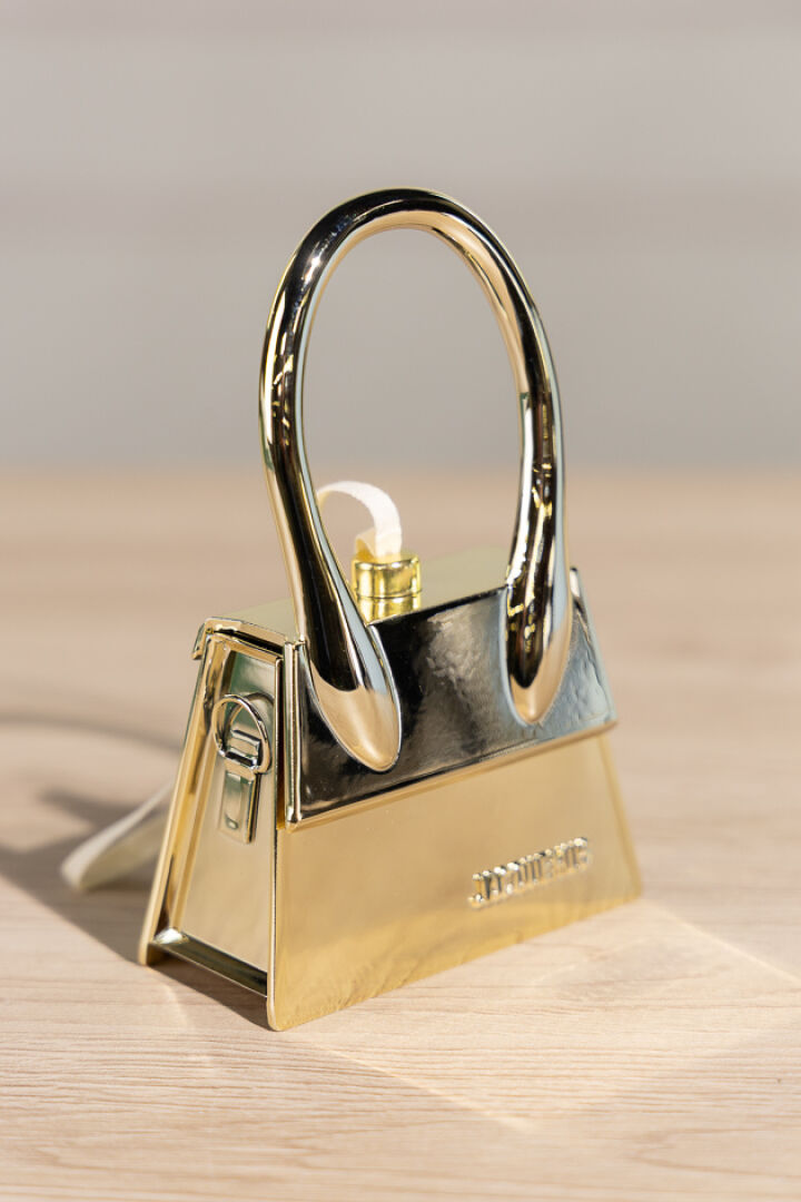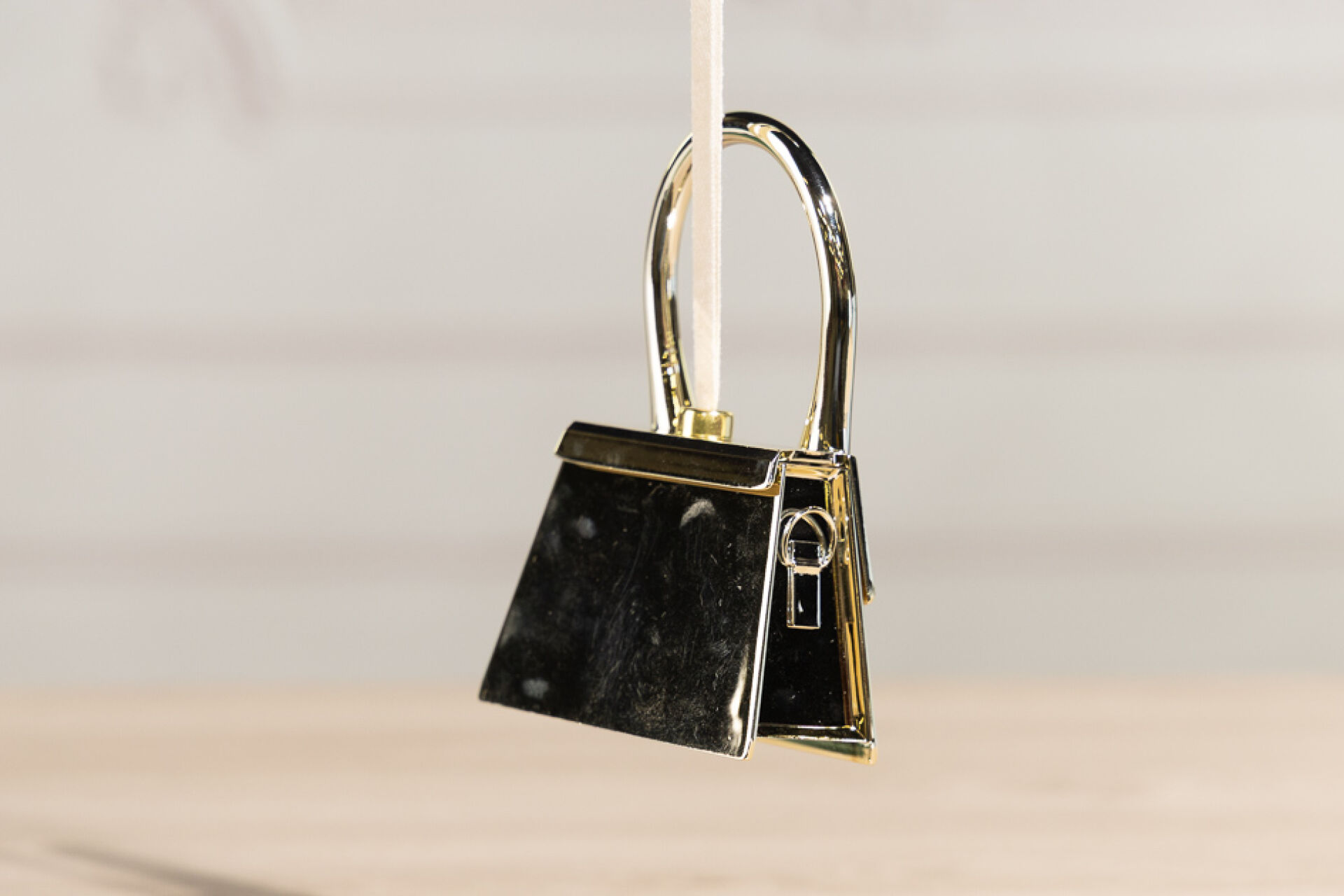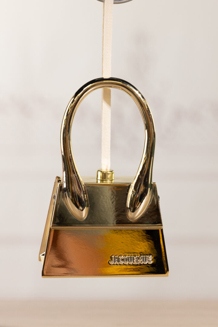 JACQUEMUS - Décoration de noël en plastique doré figurant le sac "Chiquito", petite anse en coton beige pour la suspendre. Dans sa boite. Haut. : 12,5 cm