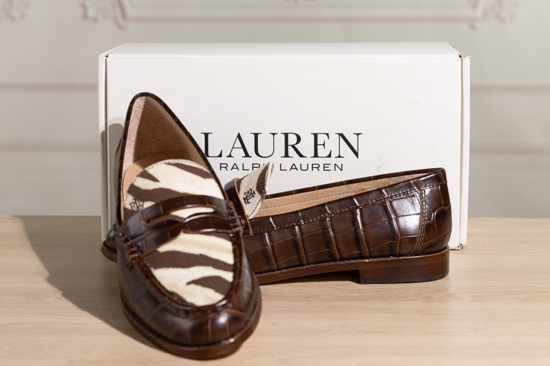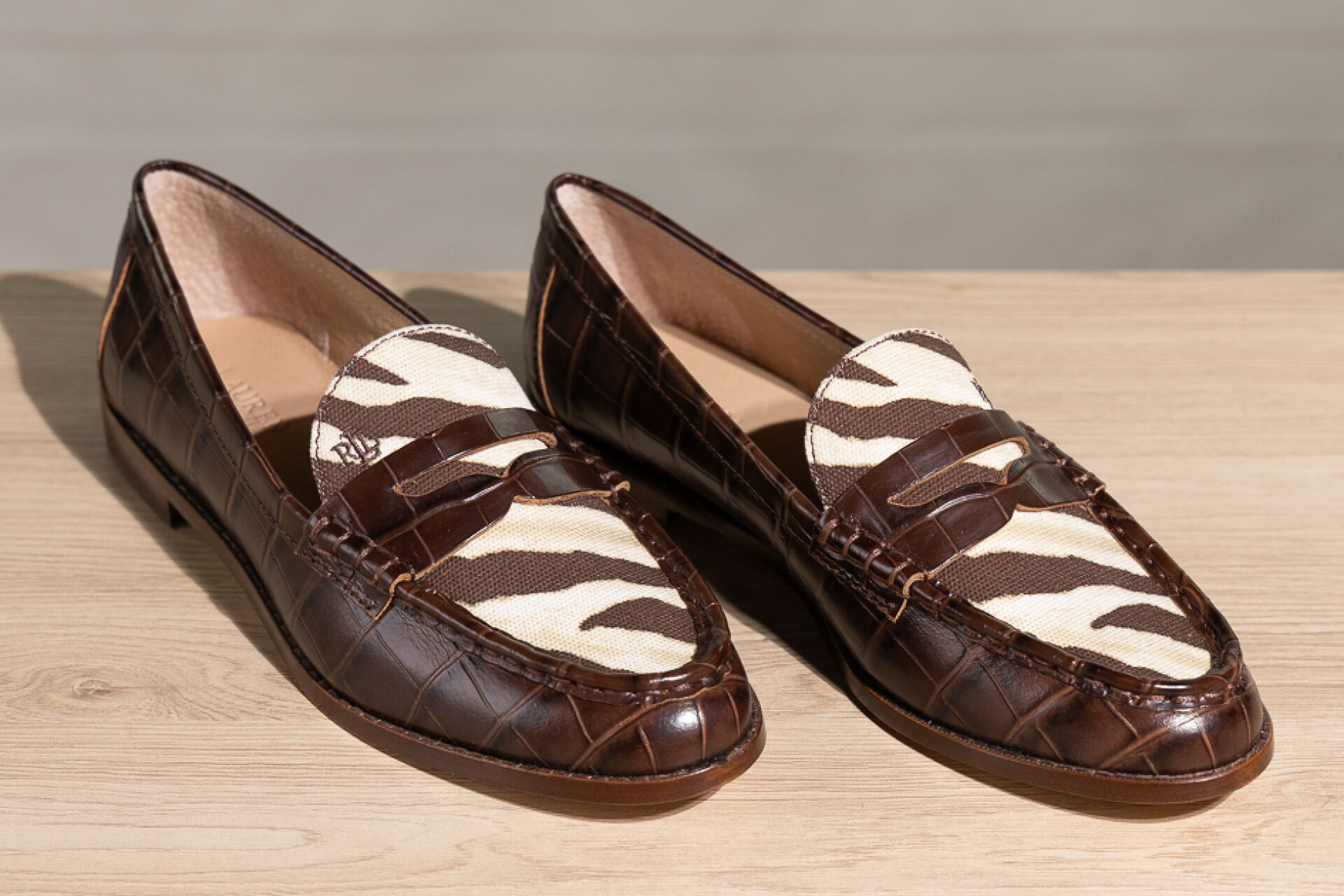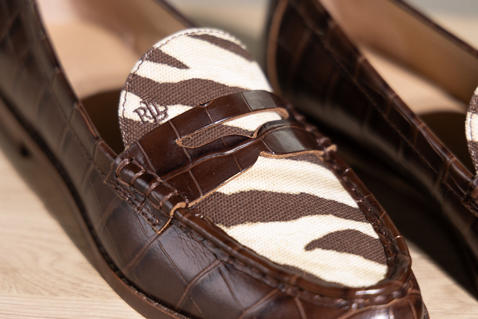 RALPH LAUREN - Paire de mocassins en cuir marron façon crocodile et toile zébrée. Boite. Pointure 38,5 Non portées