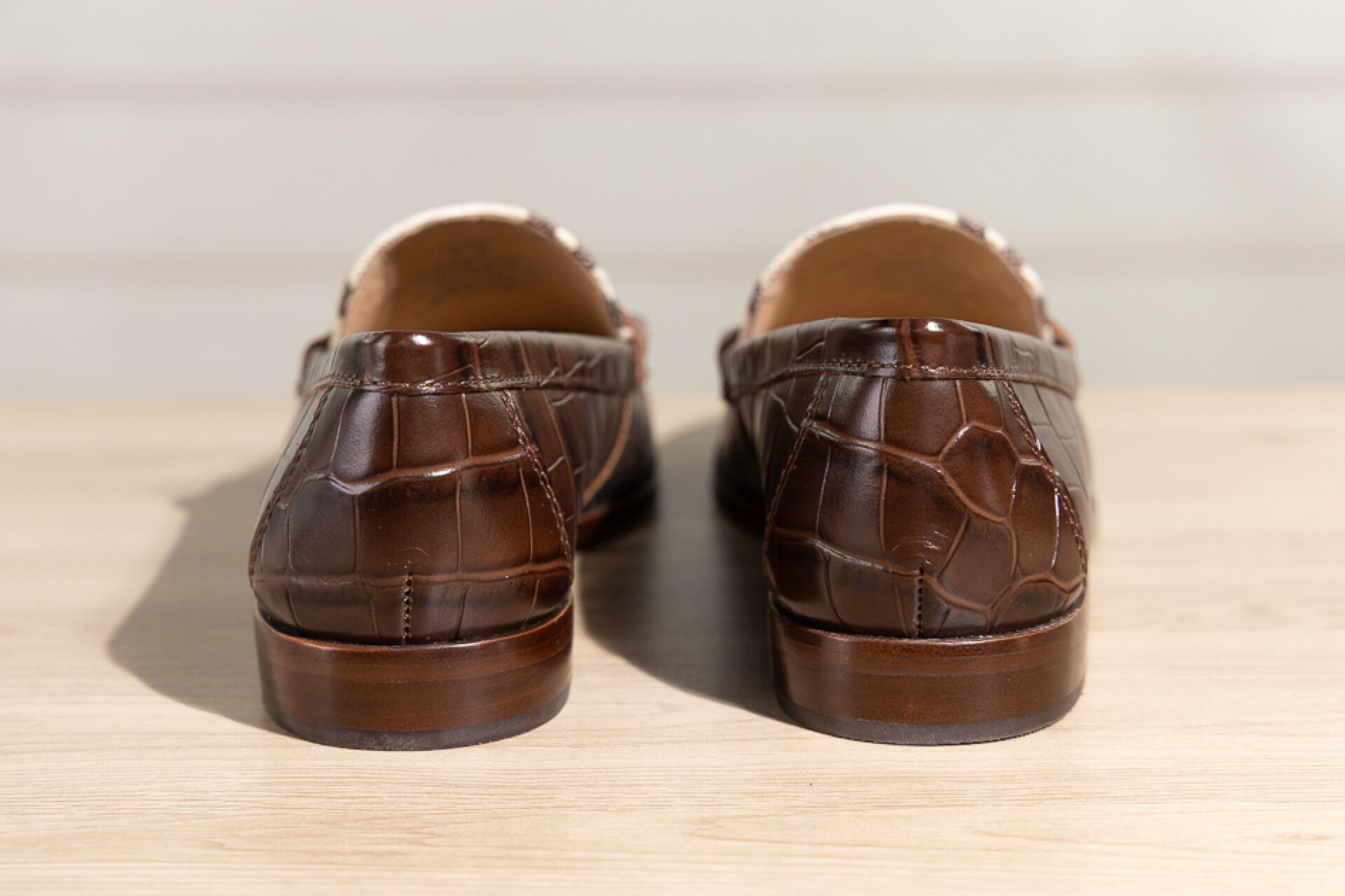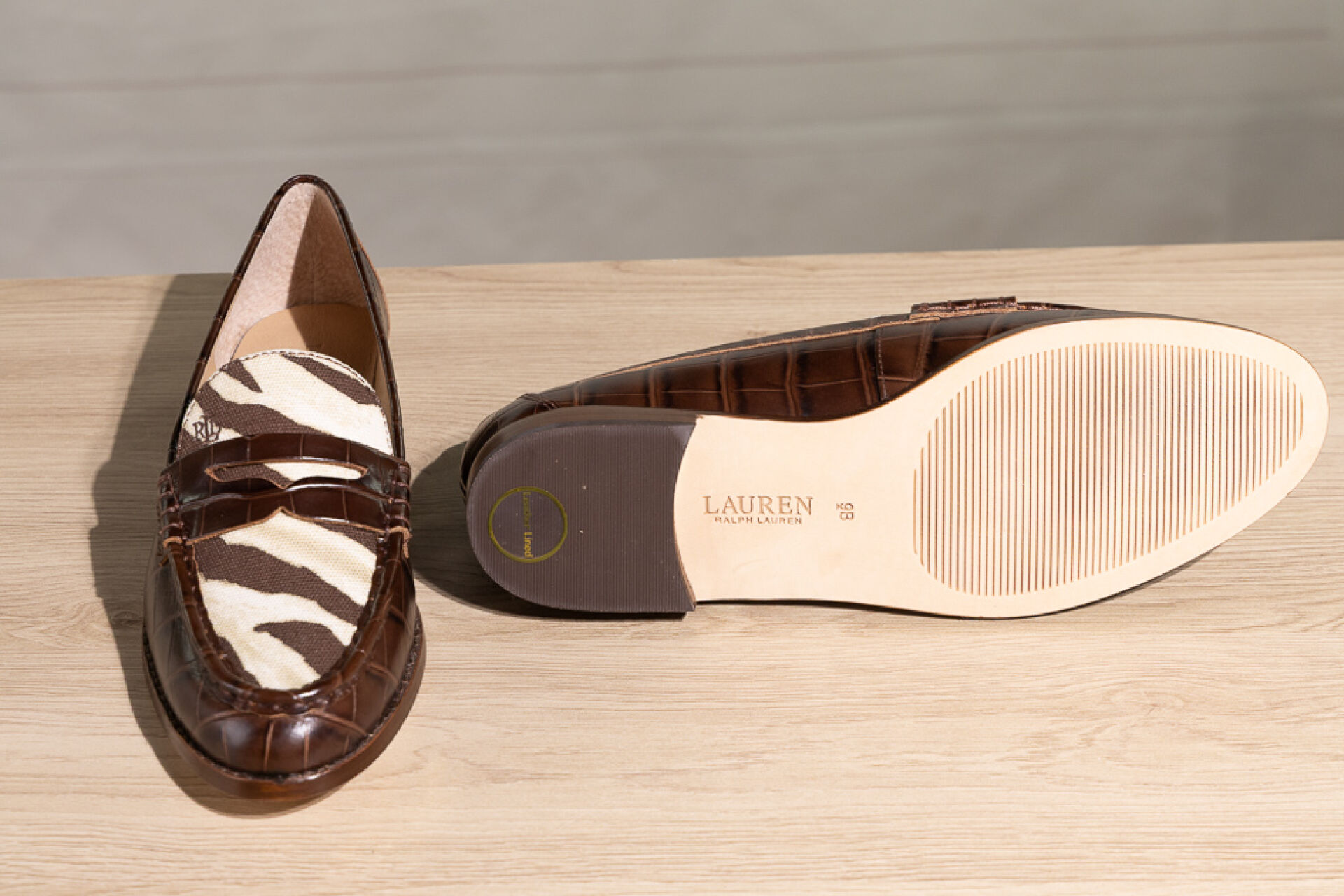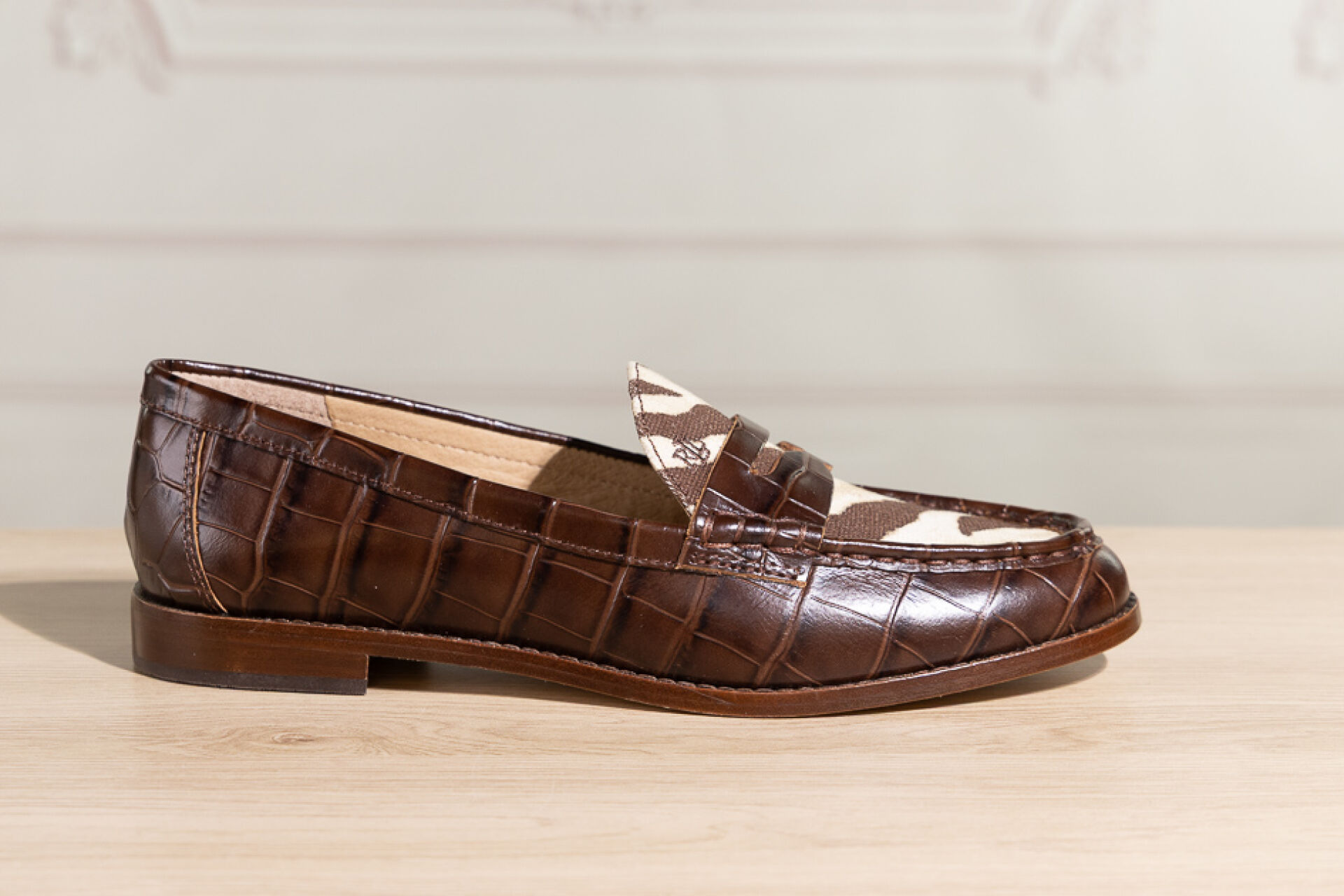 RALPH LAUREN - Paire de mocassins en cuir marron façon crocodile et toile zébrée. Boite. Pointure 38,5 Non portées