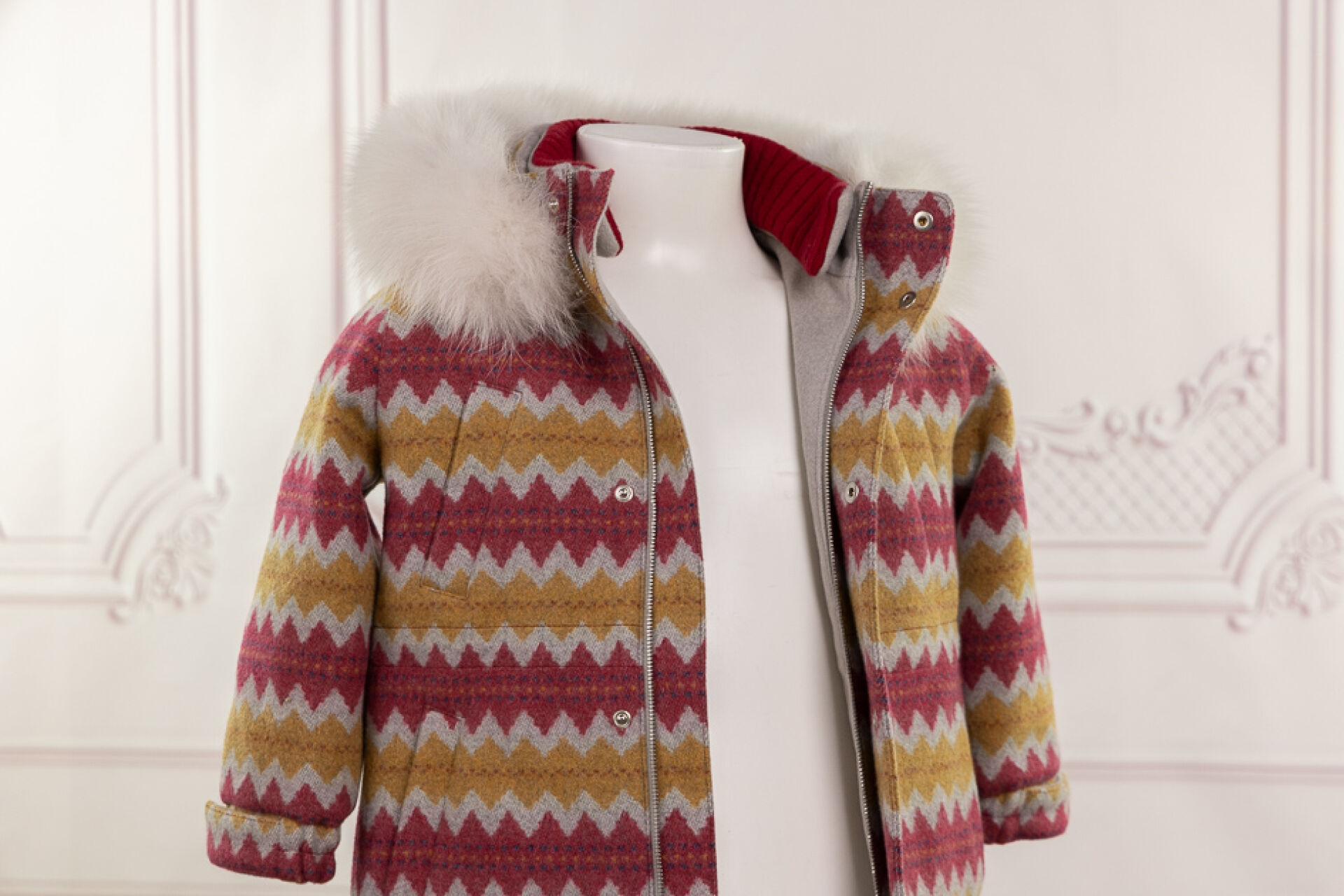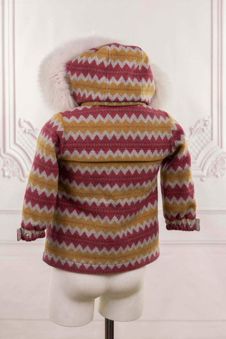 LORO PIANA - Manteau enfant en cachemire gris à frises framboise ou jaune, capuche amovible gansée de fourrure, fermeture à glissère sous patte, pression, quatre poches. Taille 2 ans Jamais porté