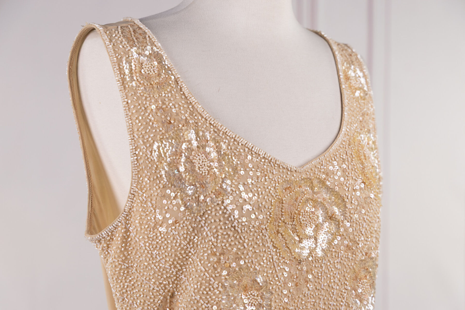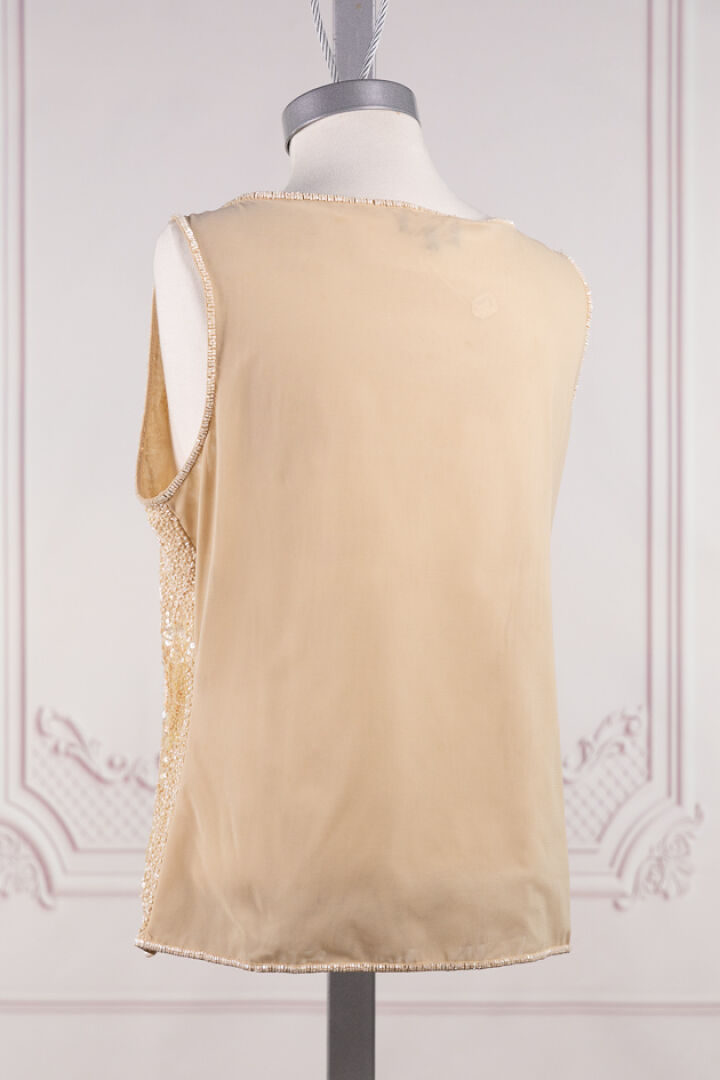 LUISA SPAGNIOLI - Haut sans manche, ivoire brodé de sequins formant des motifs de fleurs. Taille indiquée L Petits fils tirés