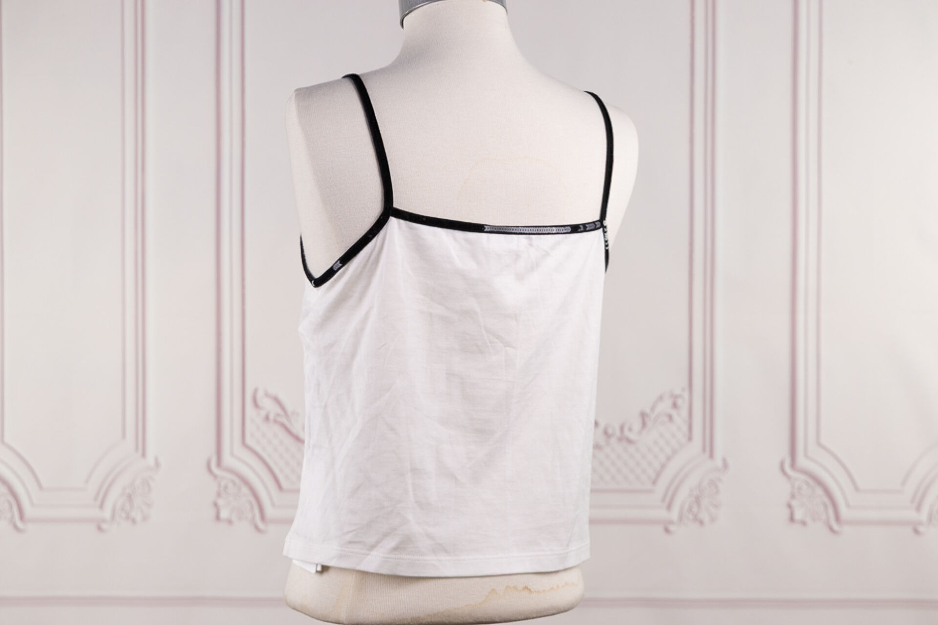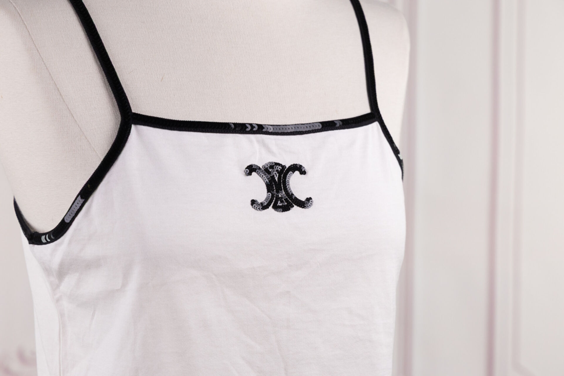 CELINE - Débardeur en jersey de coton blanc à fines bretelles rehaussées de sequins noir à l'identique du sigle devant. Taille indiquée M Non porté - Etiquette d'origine
