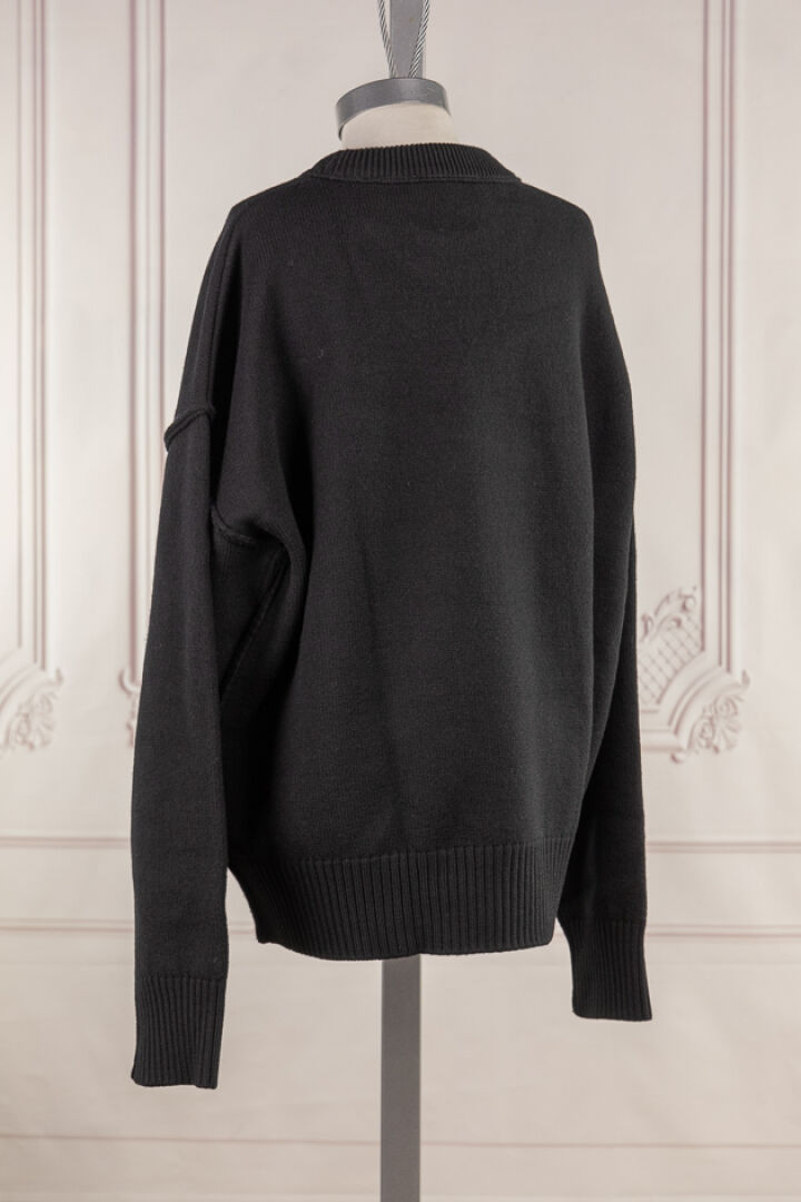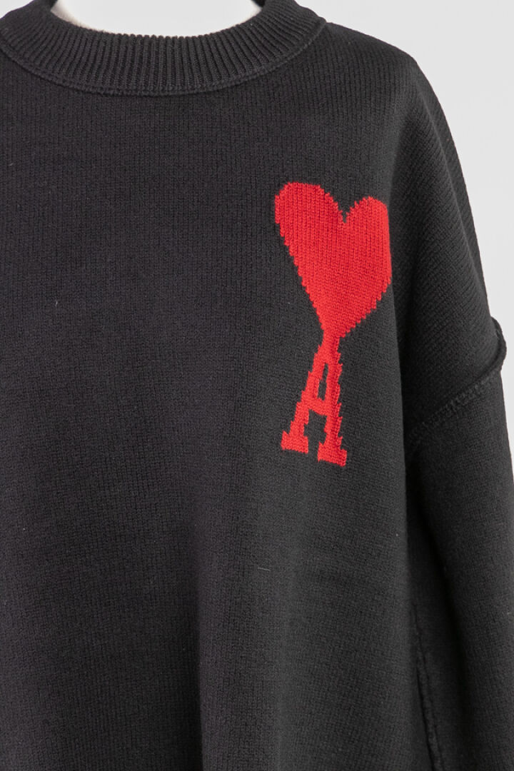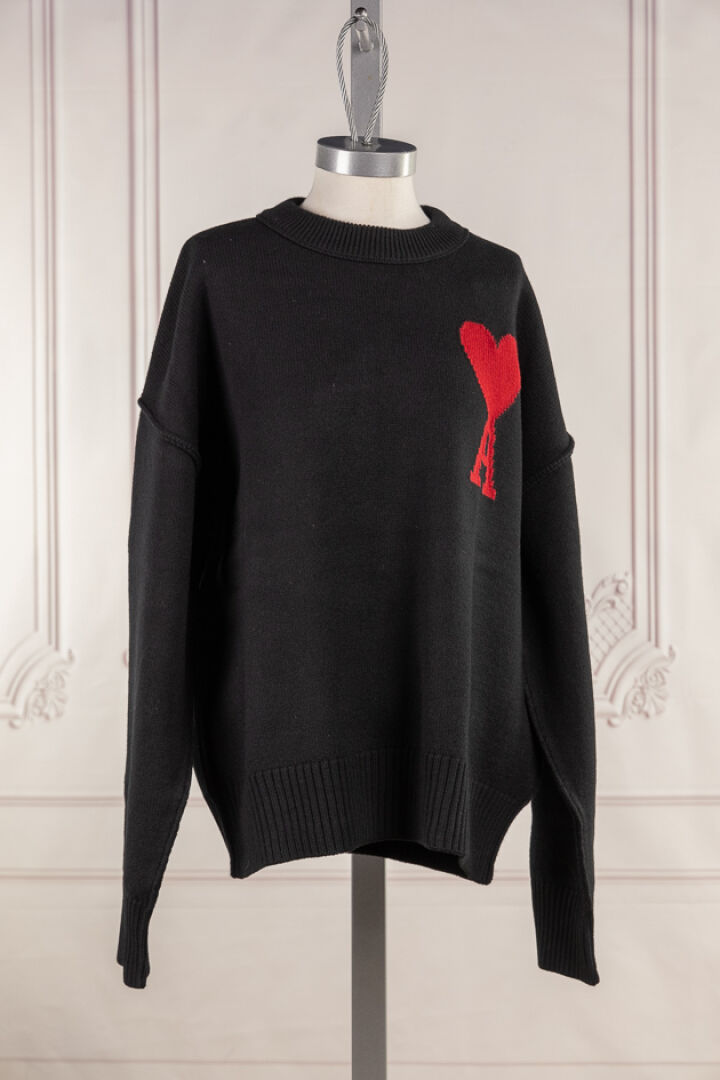 AMI par ALEXANDRE MATTIUSSI - Pull en laine vierge noire à coutures inversées, devant cœur rouge, encolure ronde, manches longues. Taille L Non porté, étiquette d'origine