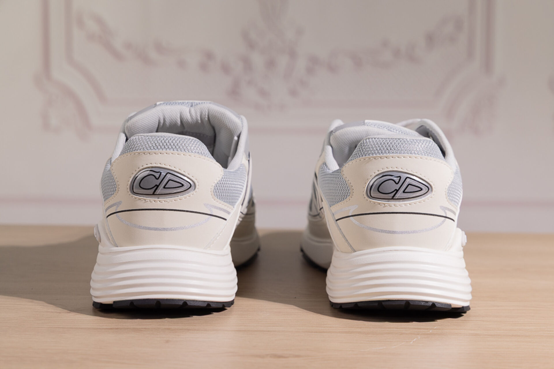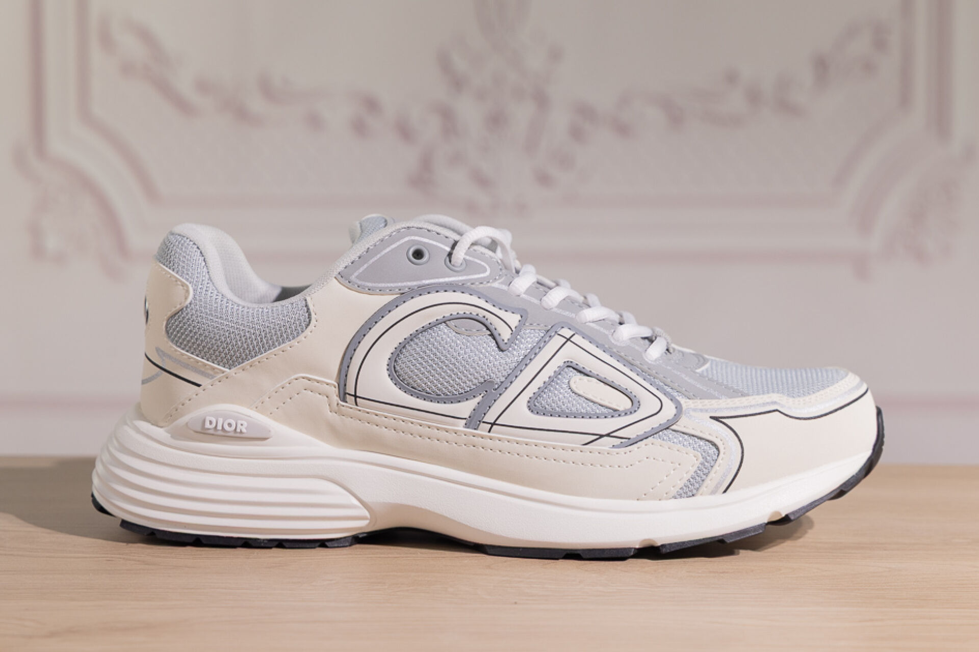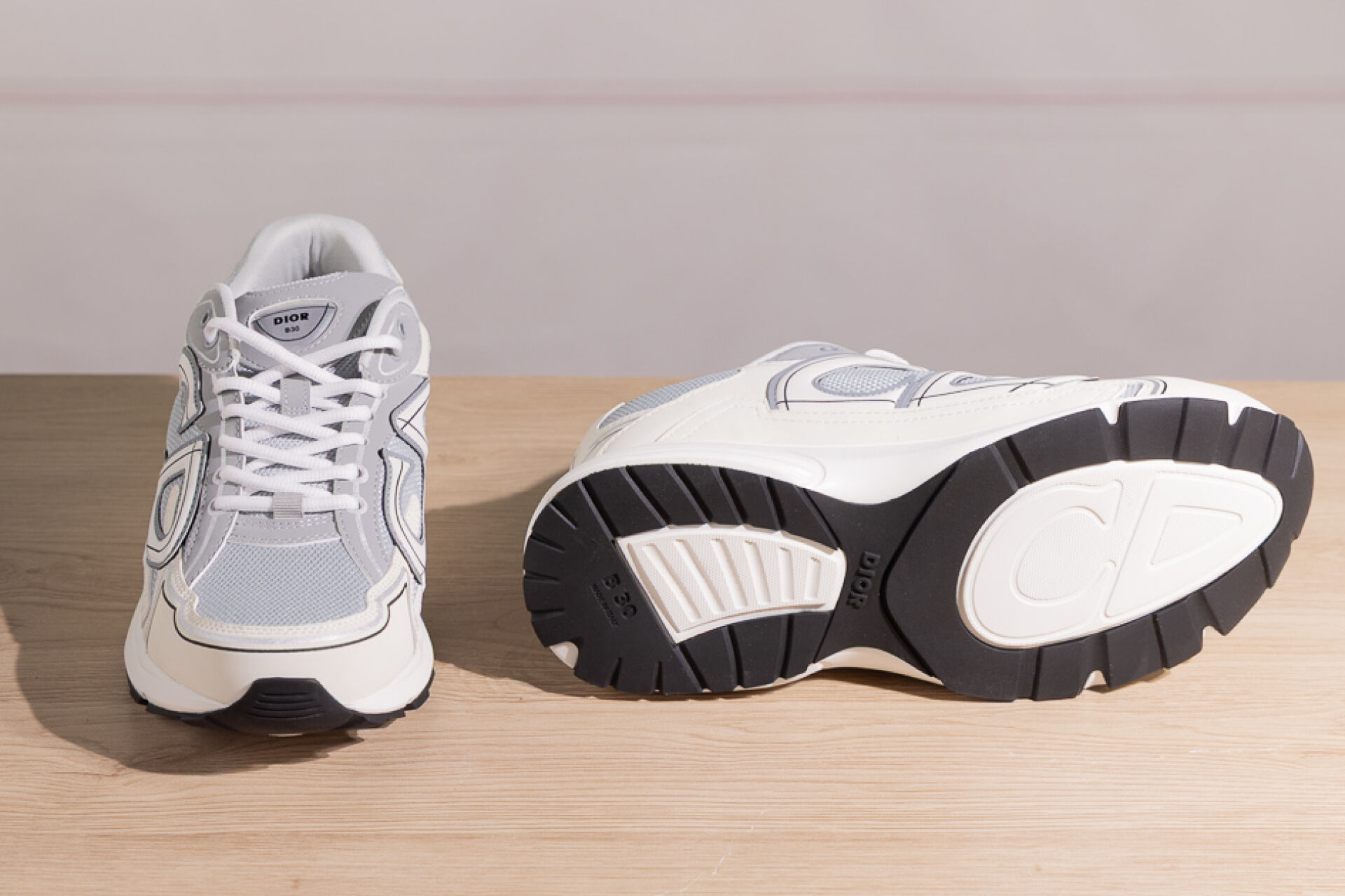 DIOR. Paire de baskets B30 en filet argenté et empiècements de cuir découpé notamment au sigle beige, gris, lacets. Pointure 42. Non portée.