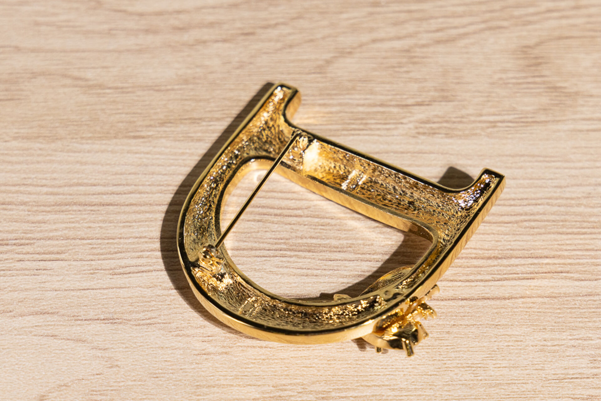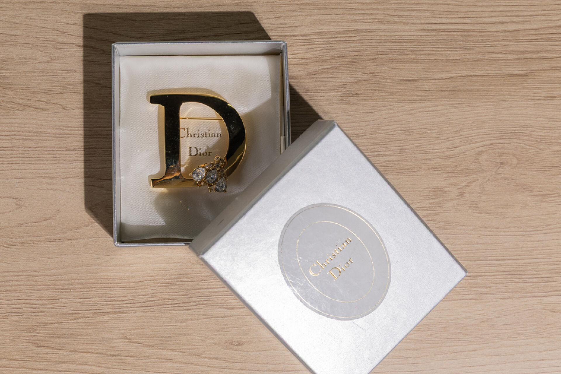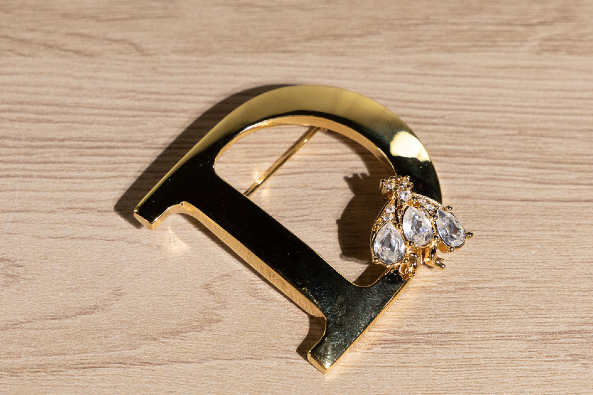 CHRISTIAN DIOR - Broche en métal doré figurant un D et une abeille décoré de strass. Haut. : 5 cm