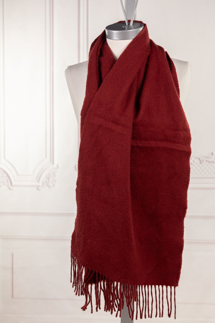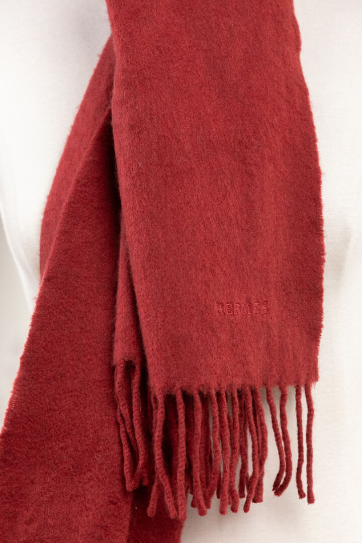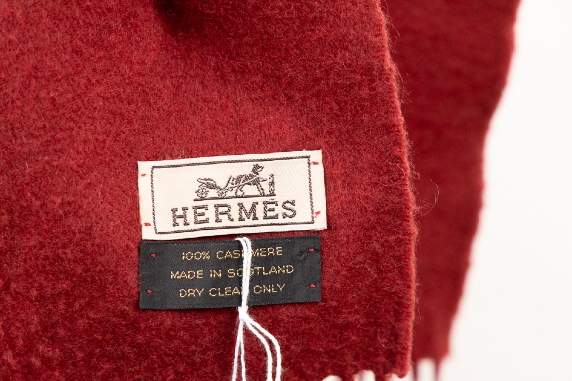 HERMES - Écharpe en cachemire bordeaux à bords frangés. Quelques bouloches, à nettoyer