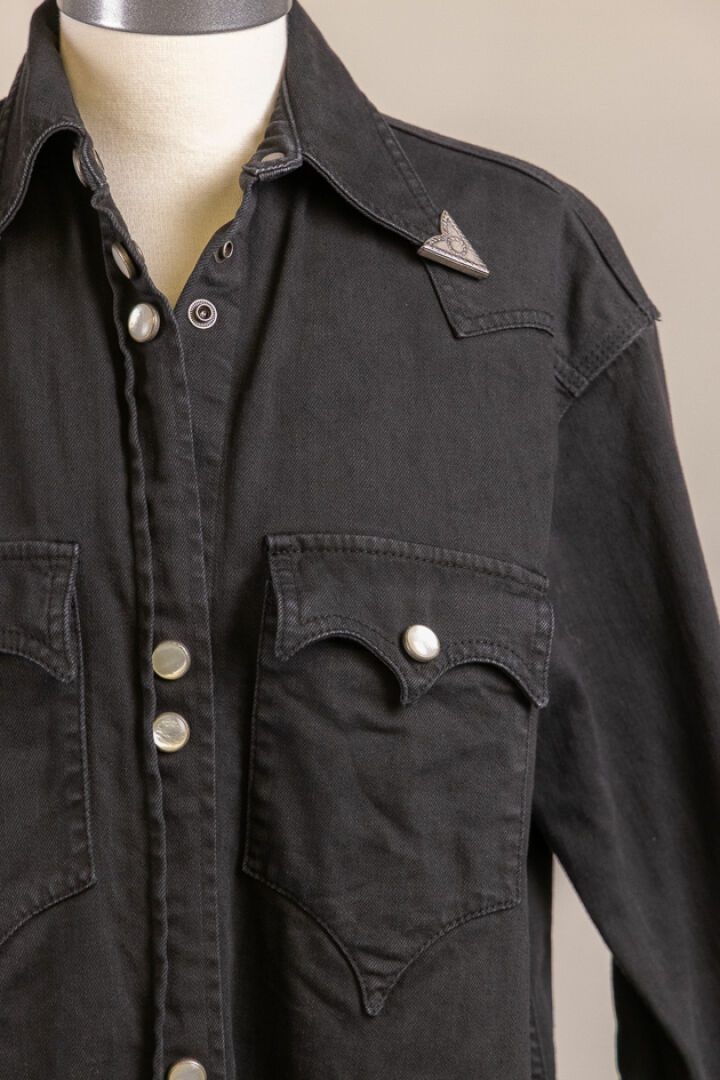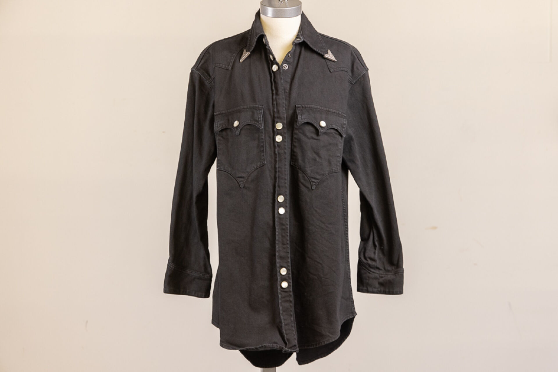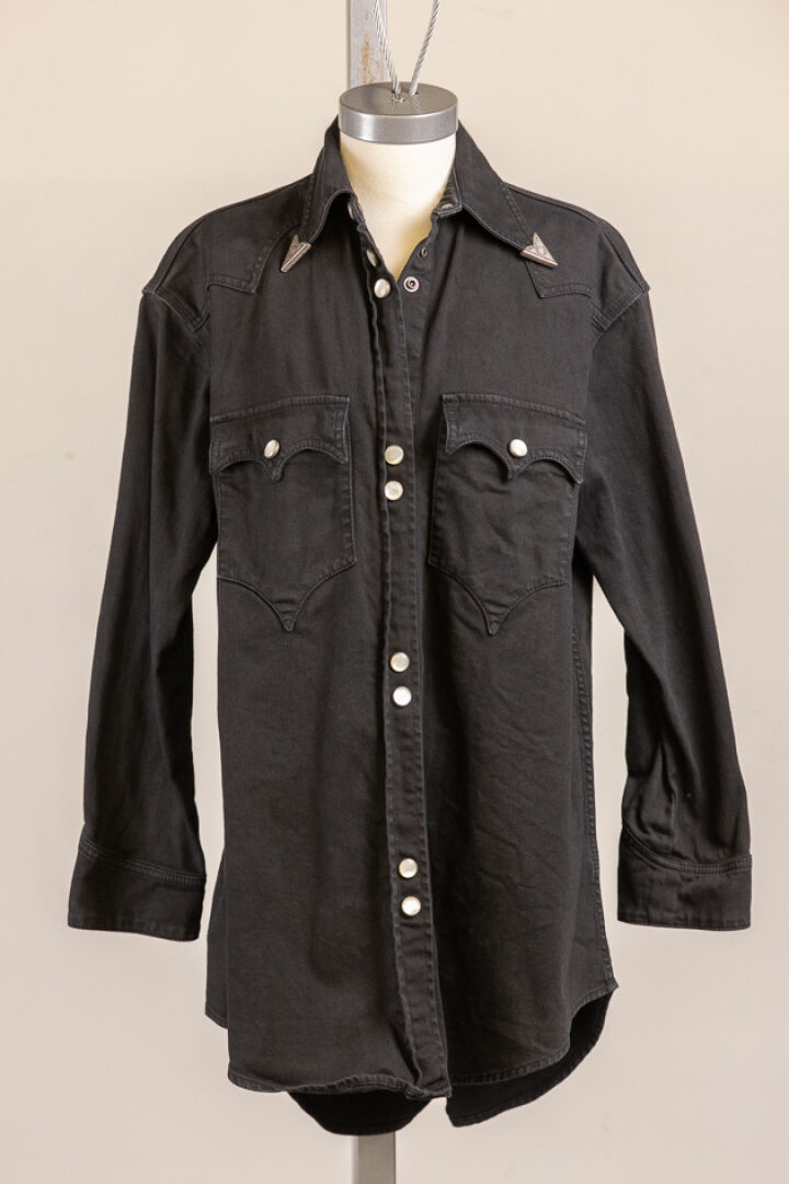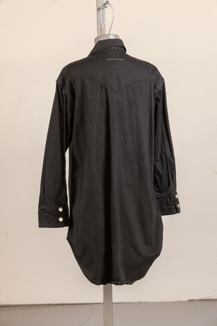 MAISON MARTIN MARGIELA Ligne 6 - Surchemise en denim noir d'esprit Western avec le col pointu ferré, simple boutonnage sous patte, deux importantes poches poitrine plaquées, manches longues. Taille indiquée 42 (taillant 38)