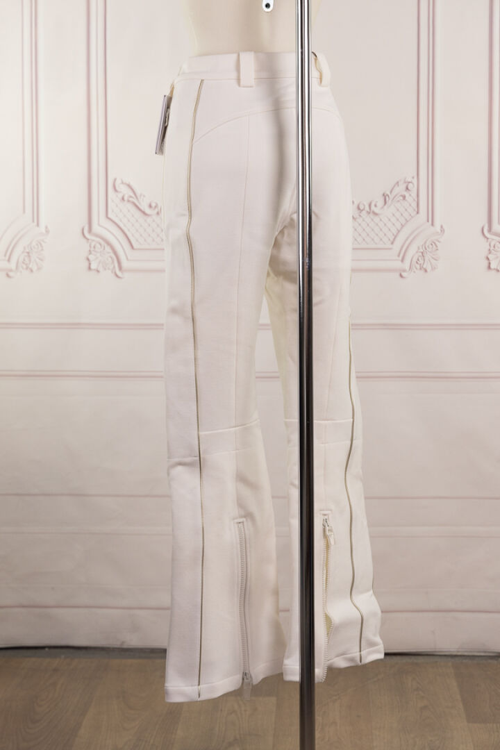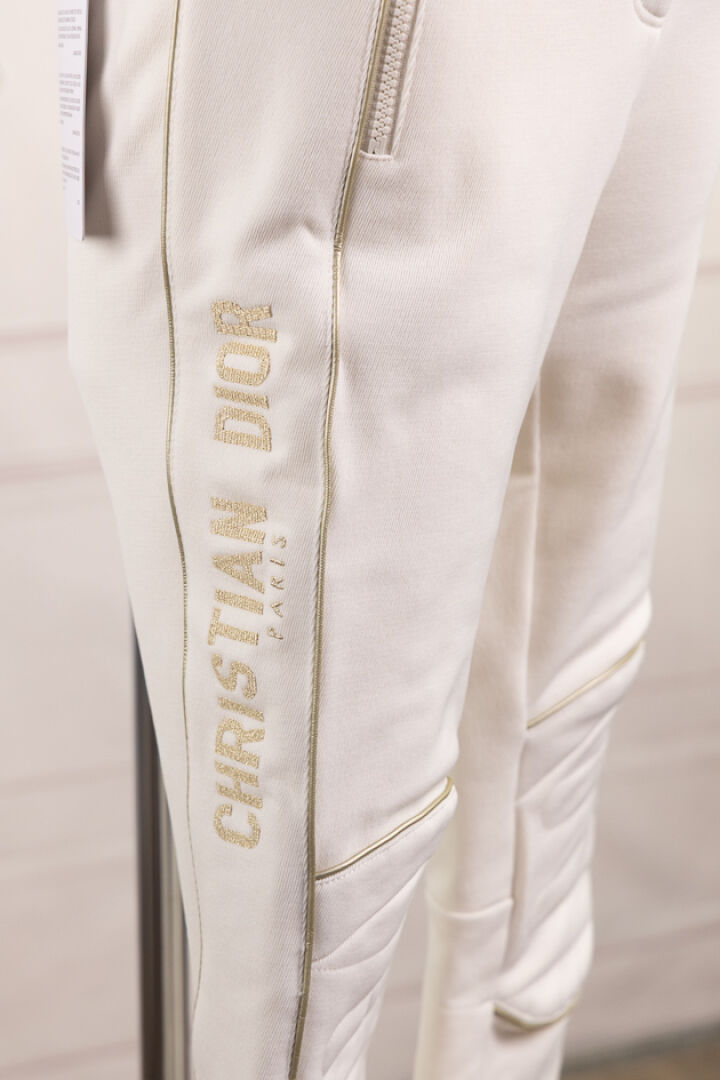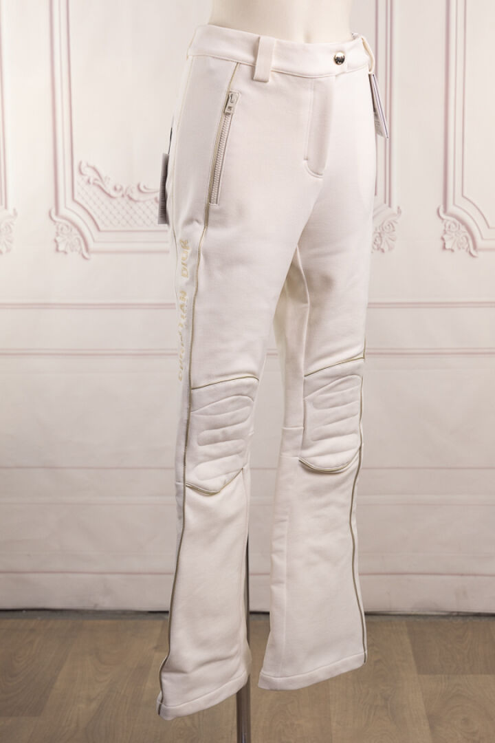 CHRISTIAN DIOR - Pantalon de ski ivoire à ganse irisée et un coté rebrodé des lettres dorées, passants à la taille, deux poches verticales zippées, renfort aux genoux, bas évasé zippé au dos. Boite. Taille indiquée 38. Non porté, étiquette d'origine