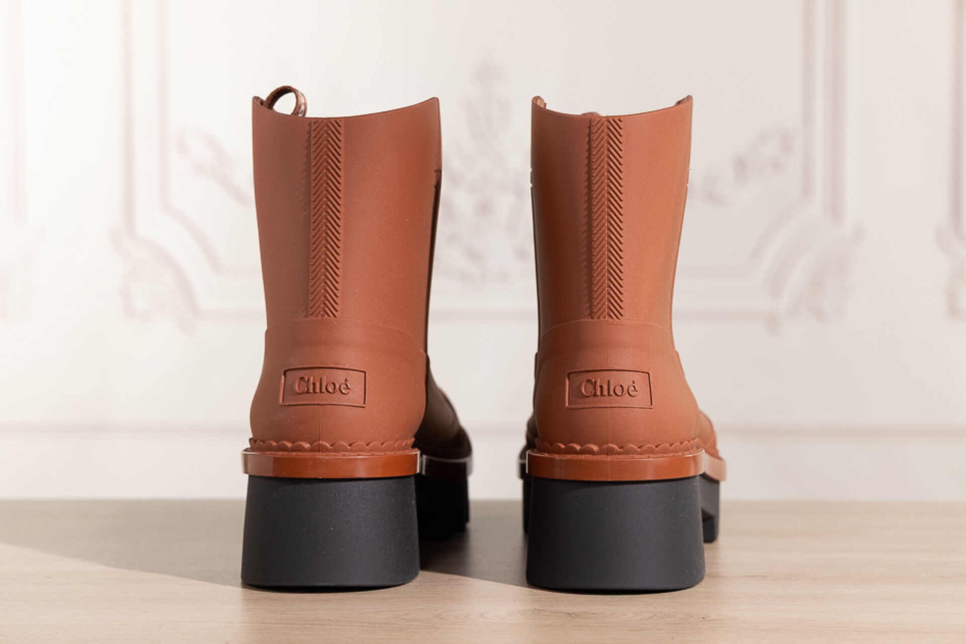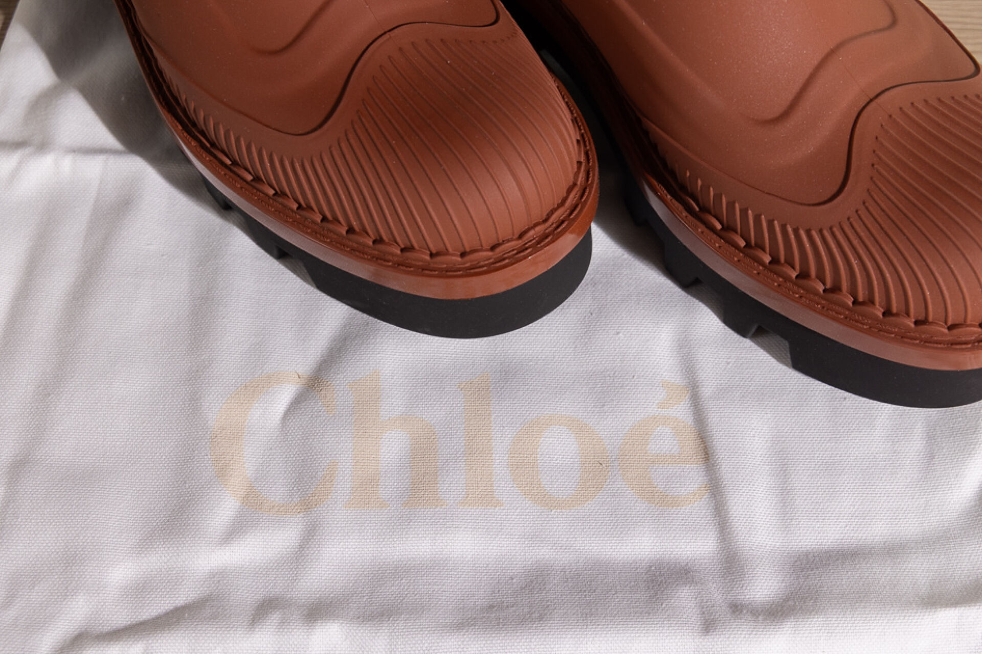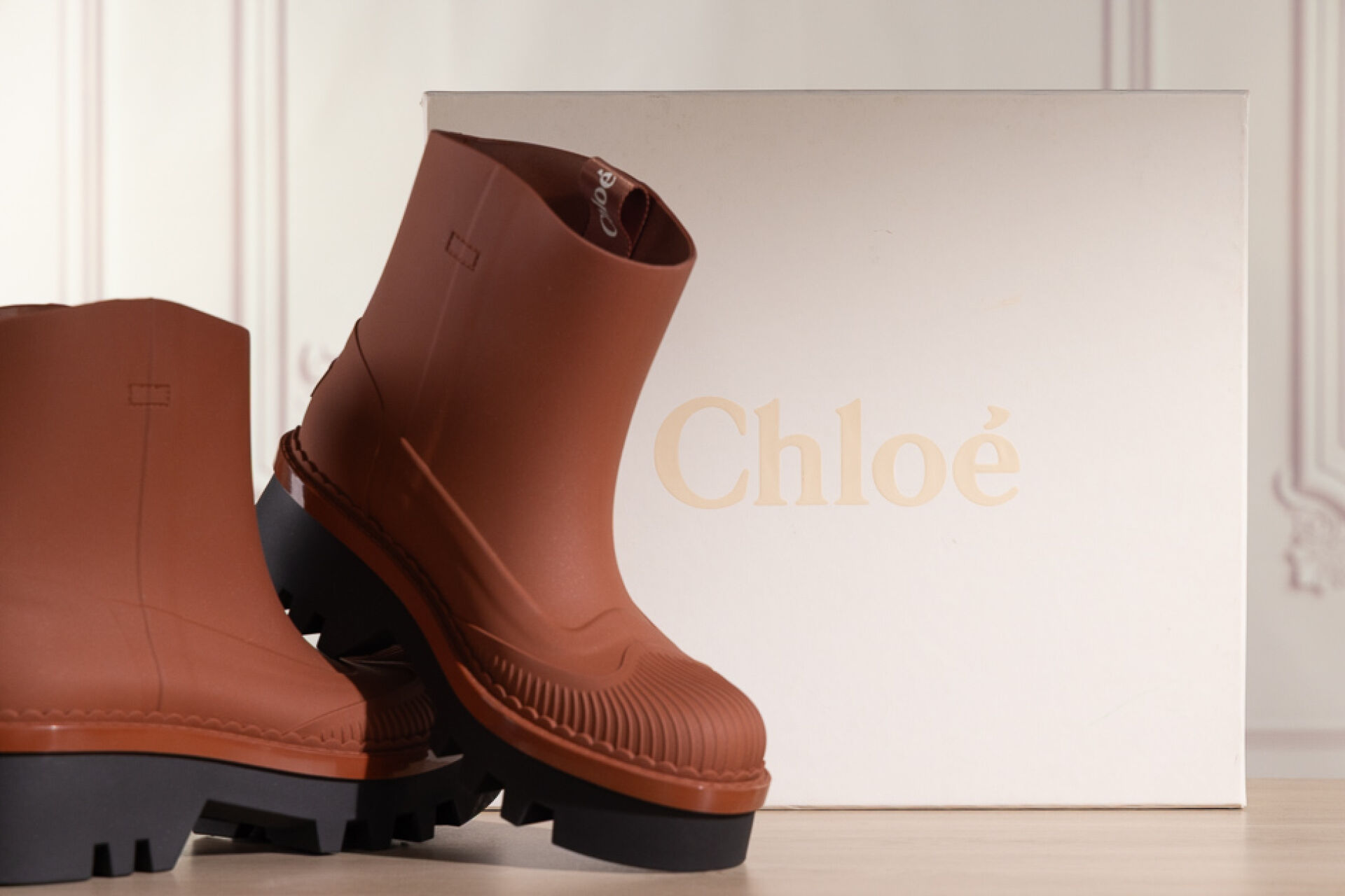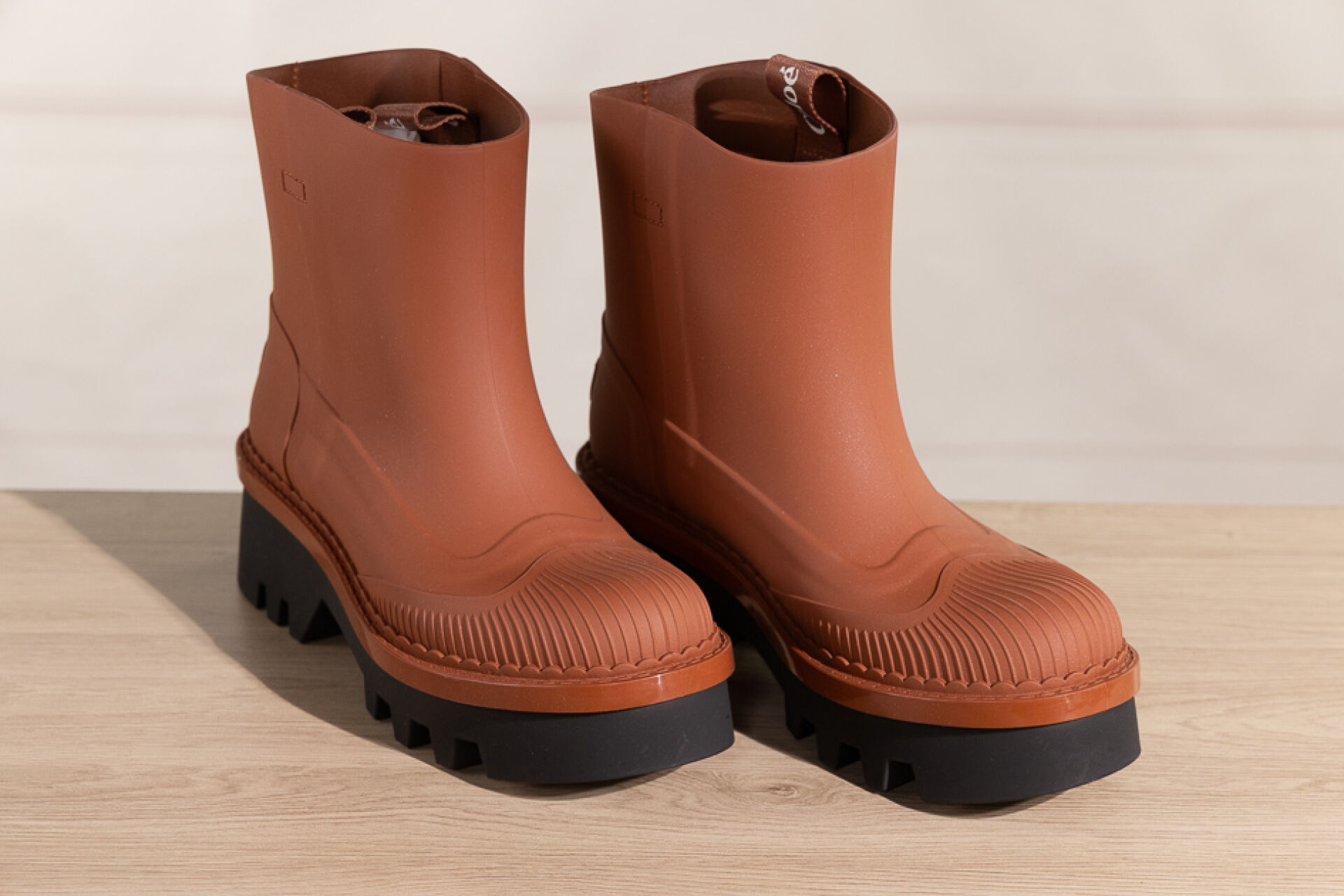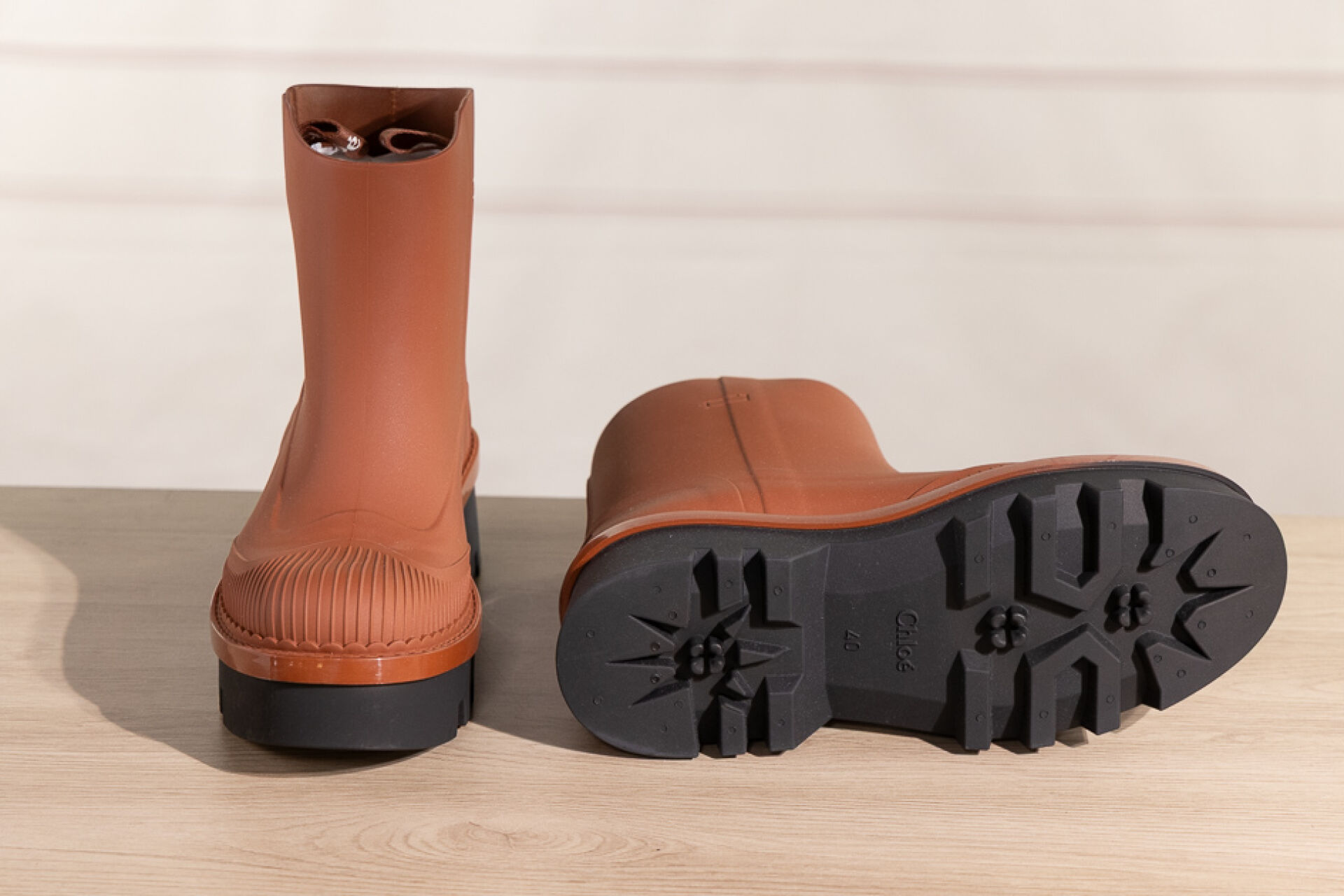 CHLOE - Paire de bottines en caoutchouc camel mat sur semelle crantée noire. Boite. Pointure 40 Non portée
