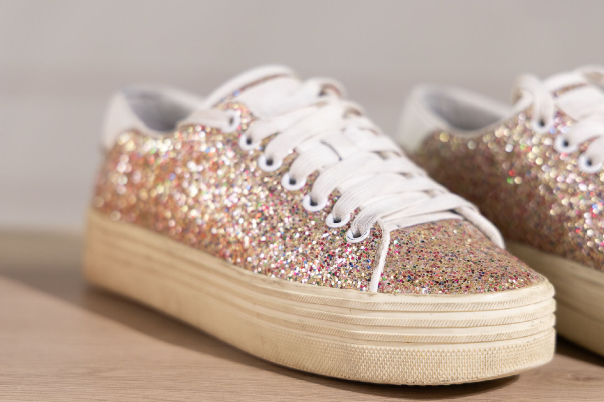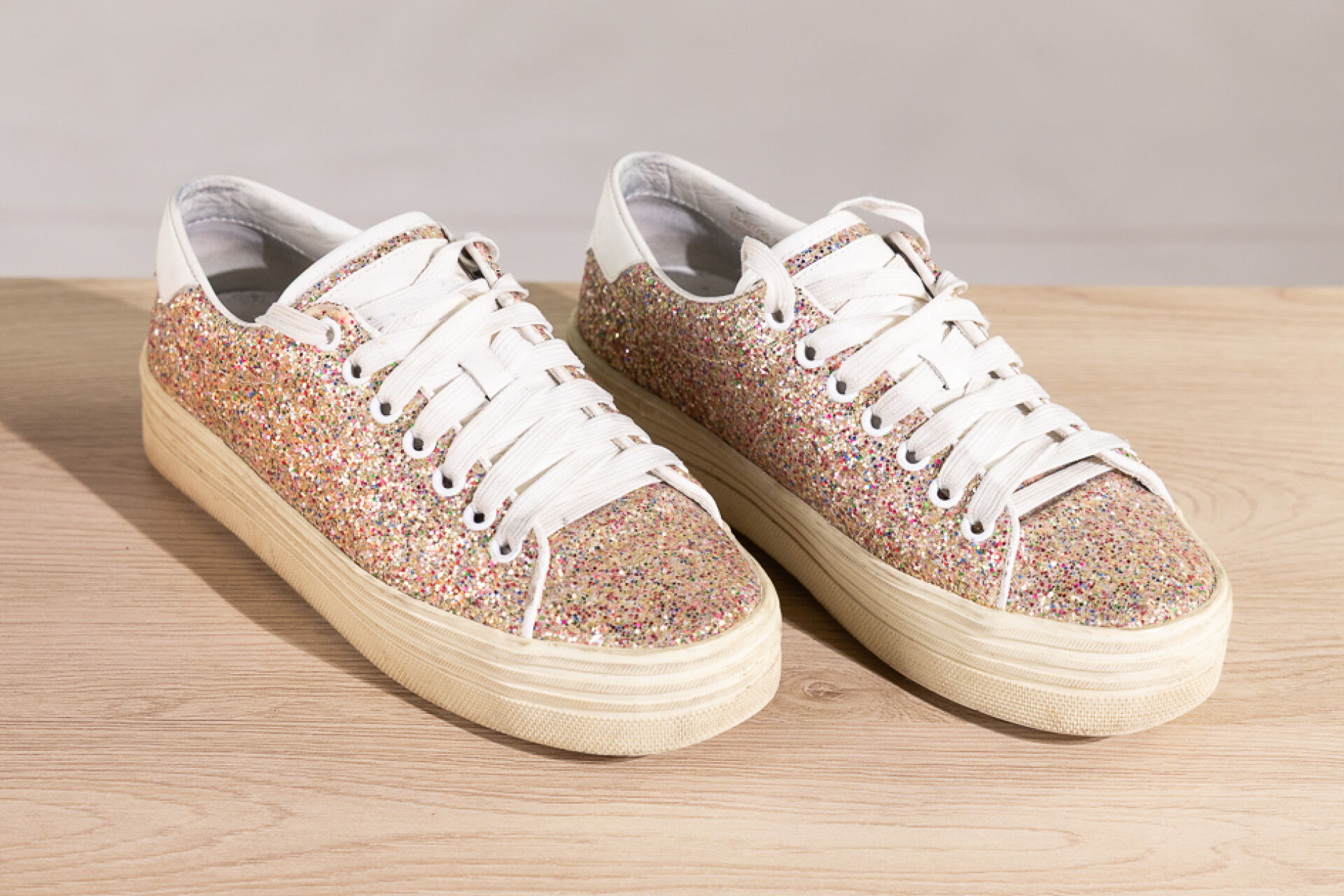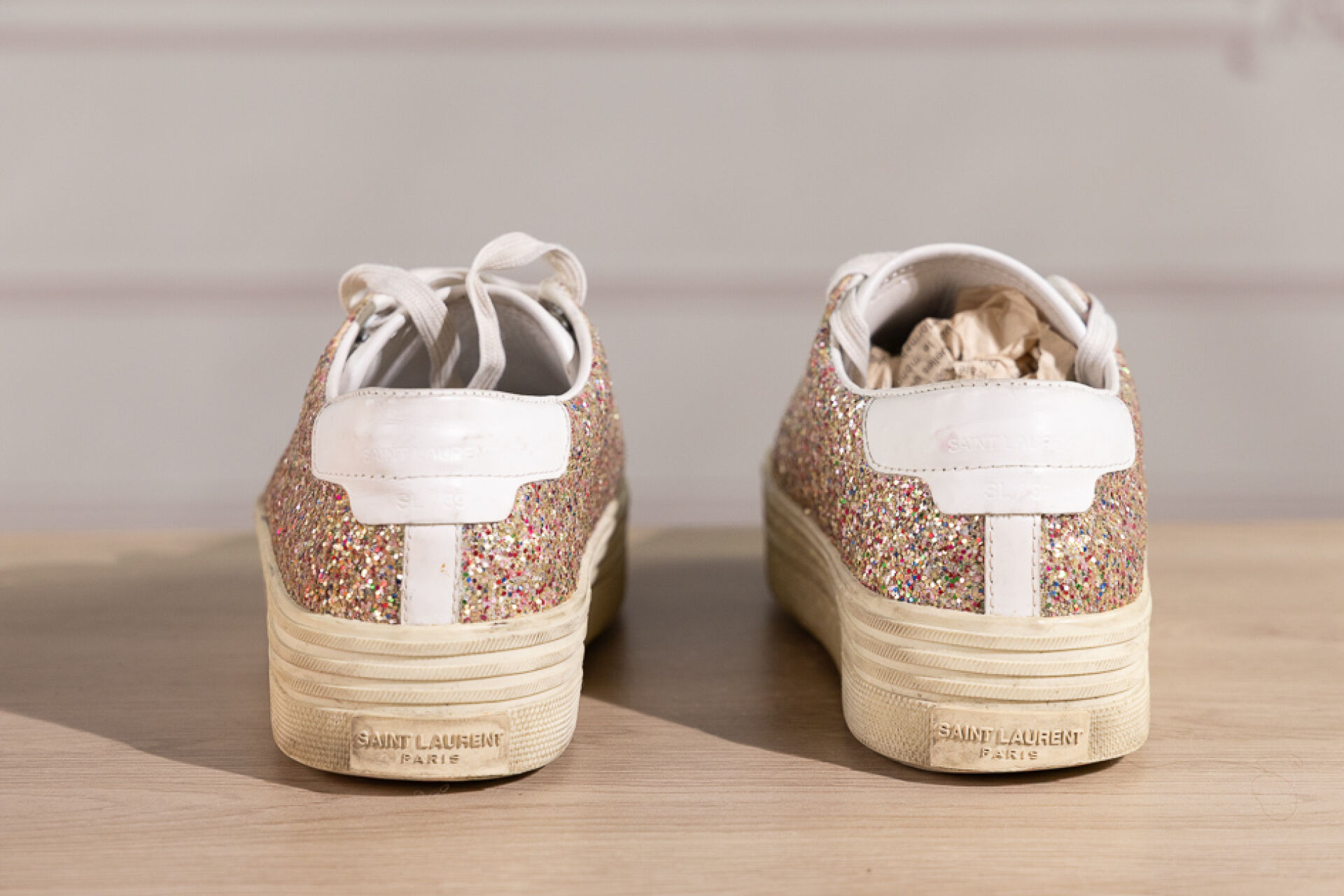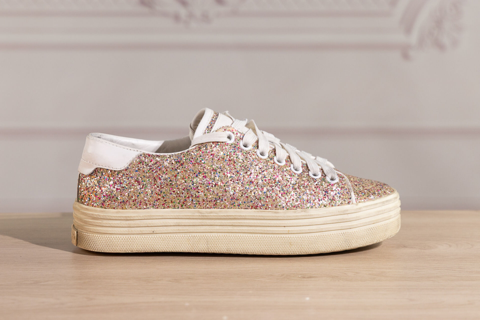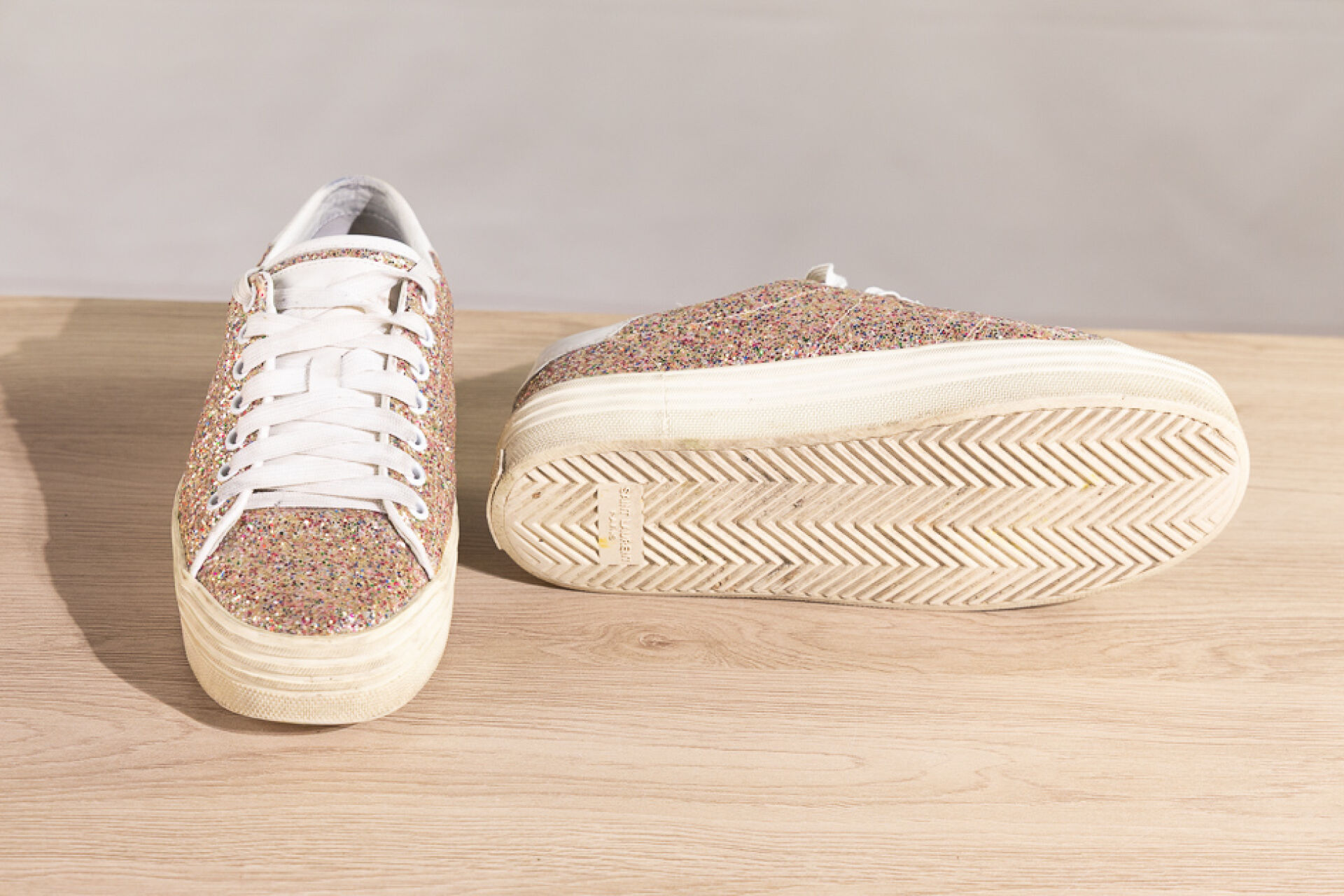 SAINT LAURENT - Paire de sneakers à paillettes multicolores, semelle blanche, lacets. Pointure indiquée 36 Usures d'usage