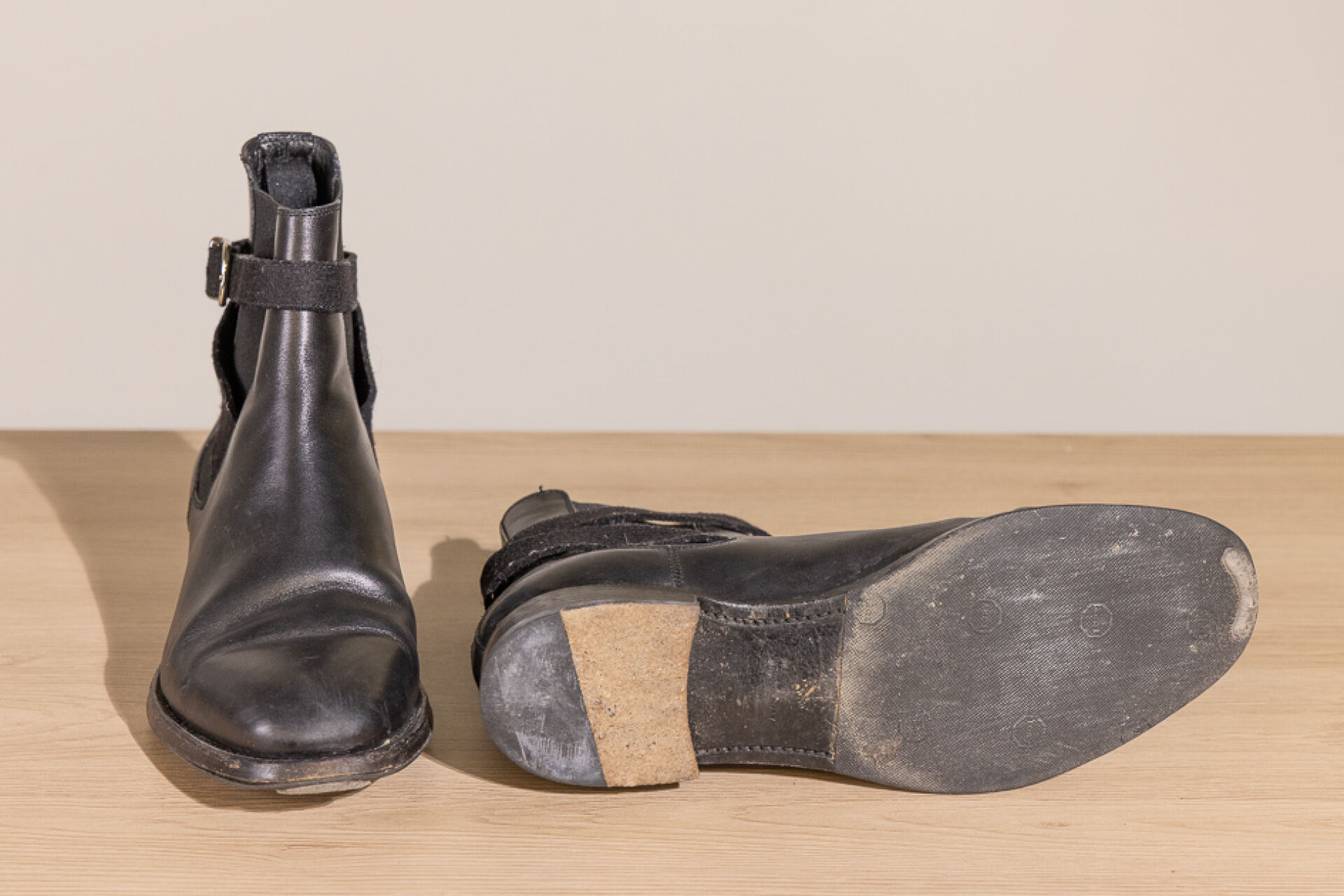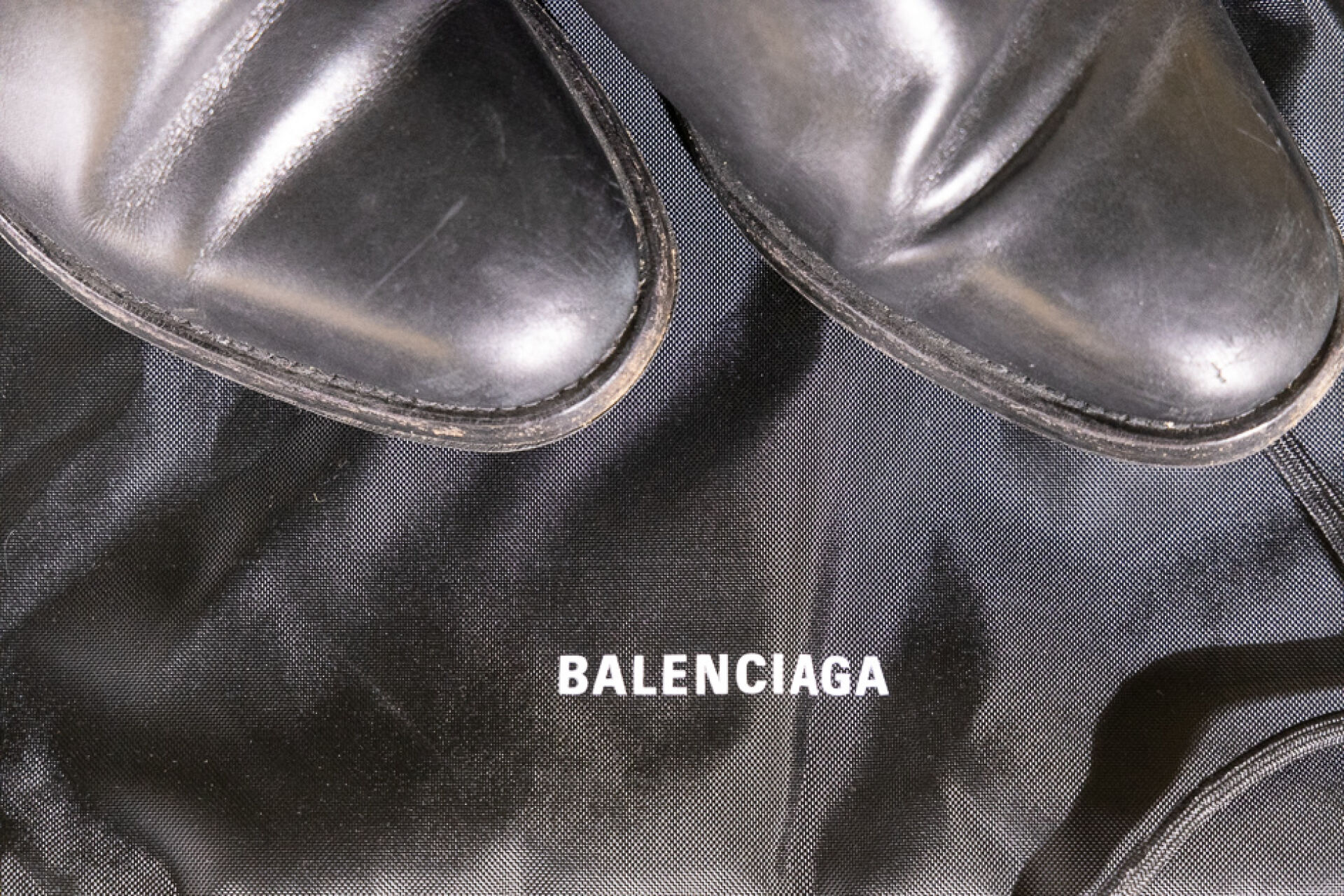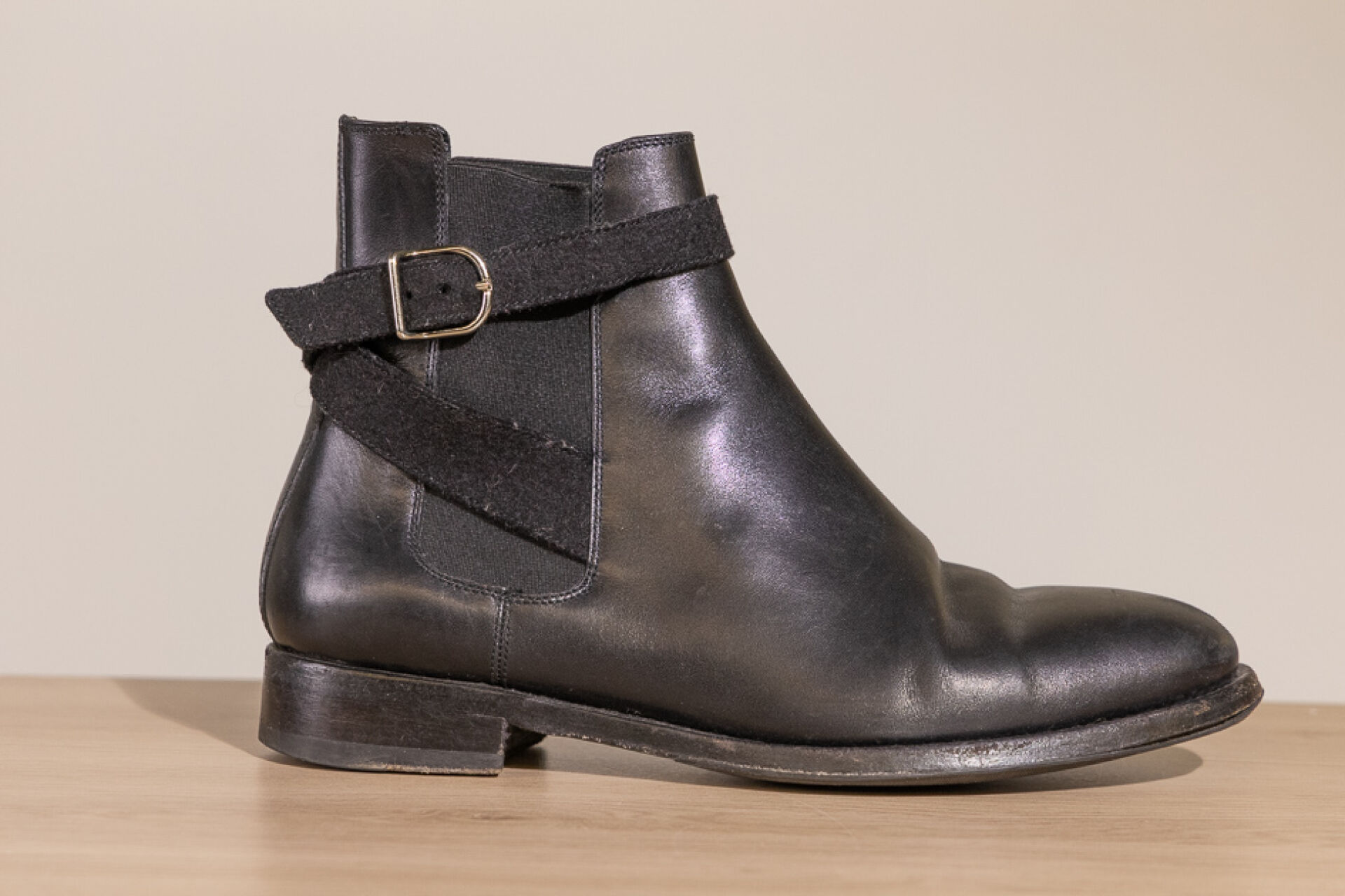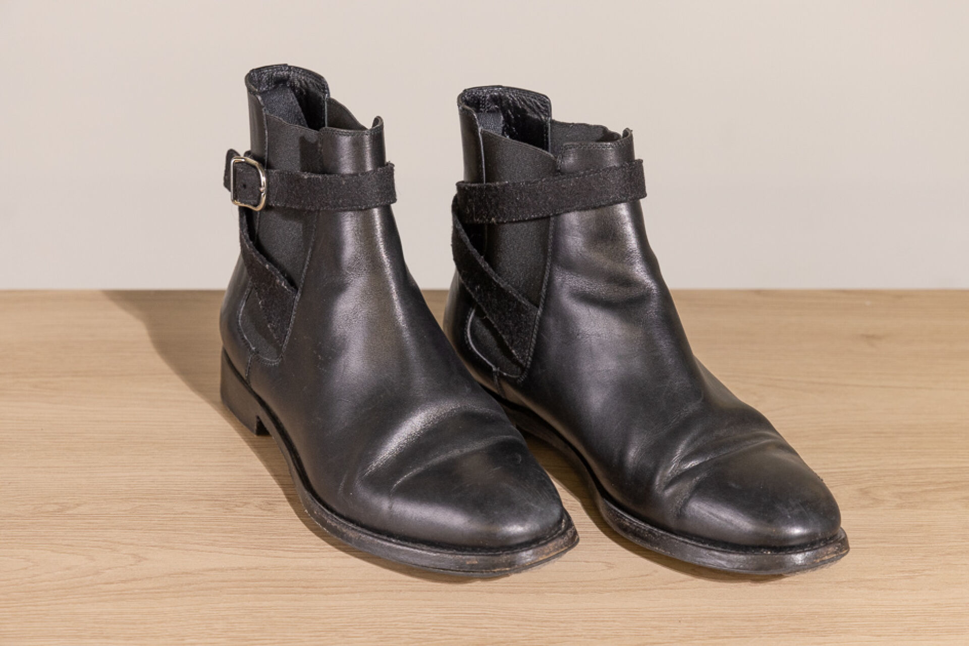 BALENCIAGA - Paire de boots en cuir noir, chevilles à deux bandes élastiques de part et d'autre sous double lien en feutrine à finition boucles. Ressemelées. Dustbag. Pointure 39 Déjà portés