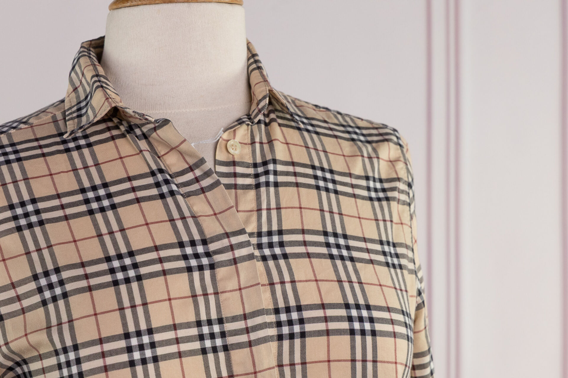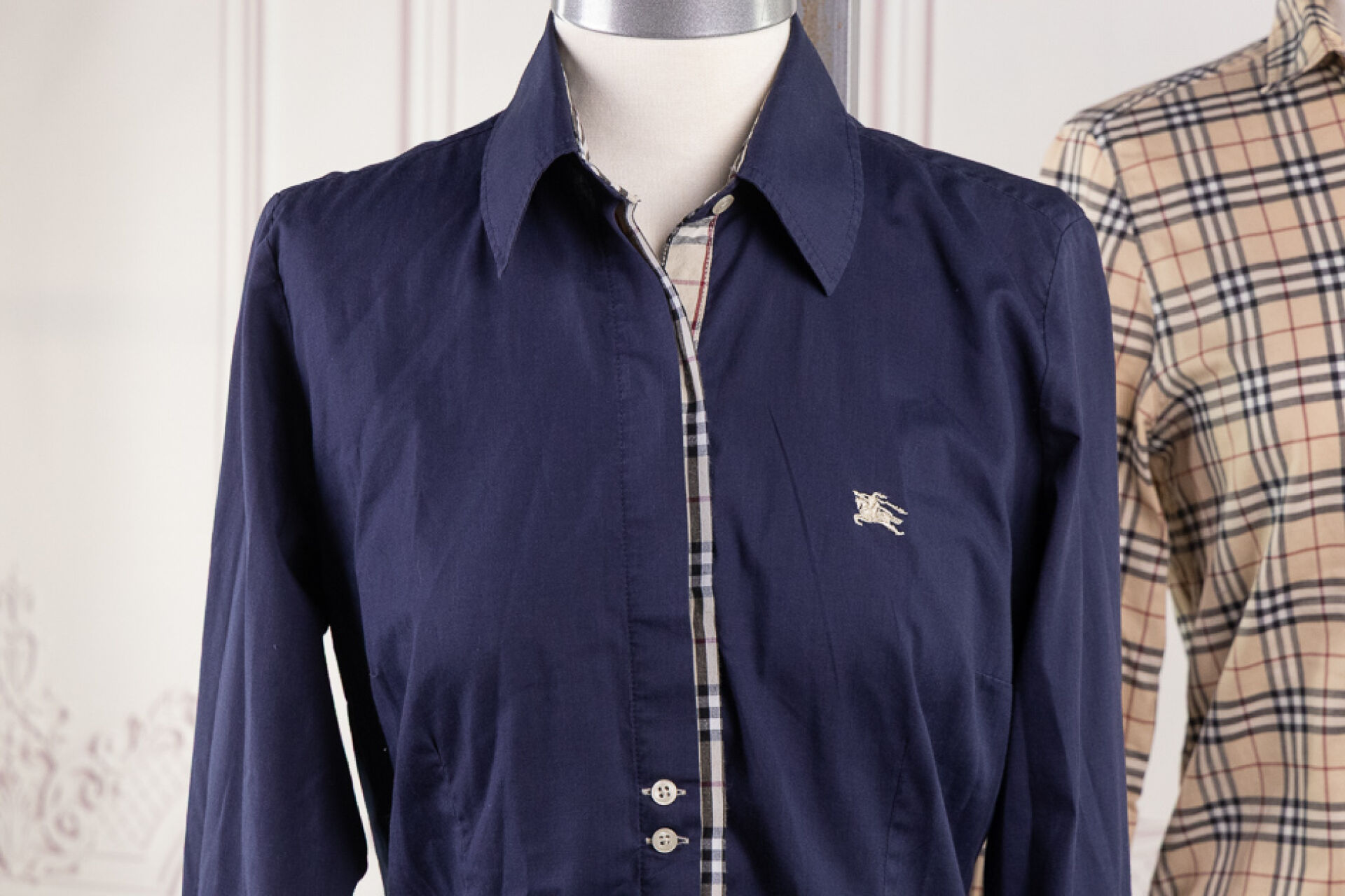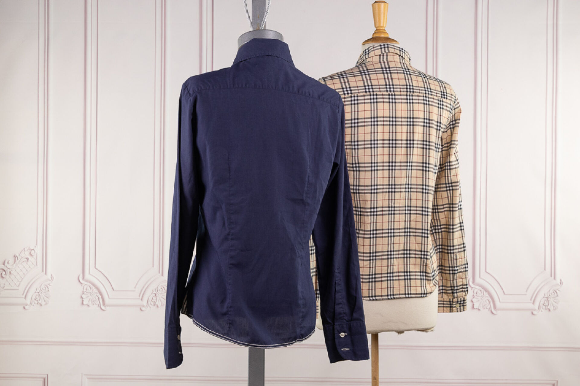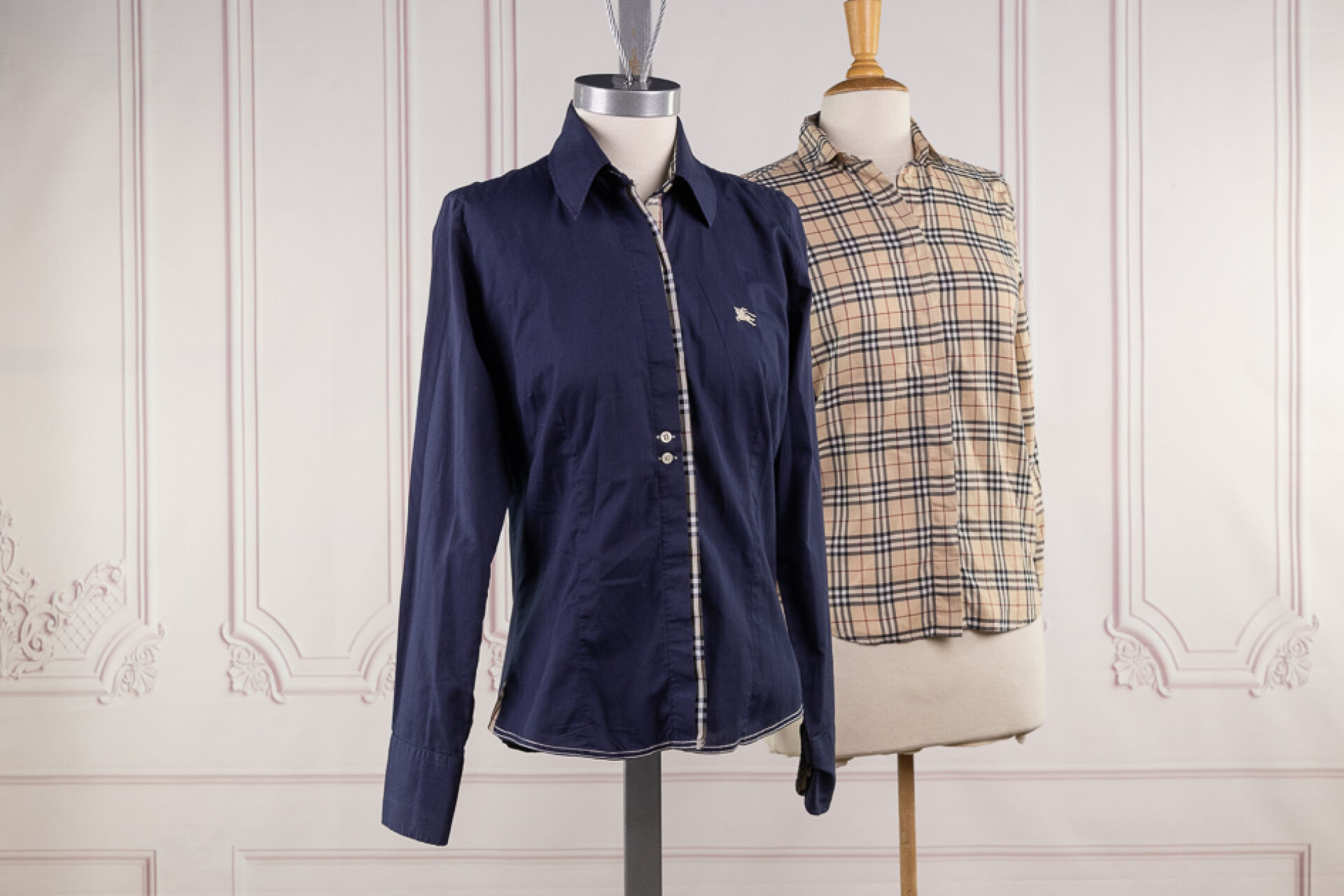 BURBERRY - Ensemble de deux chemisiers en coton, l'un marine, le second tartan beige et noir. Taille supposée 36 Déjà portés, bel état