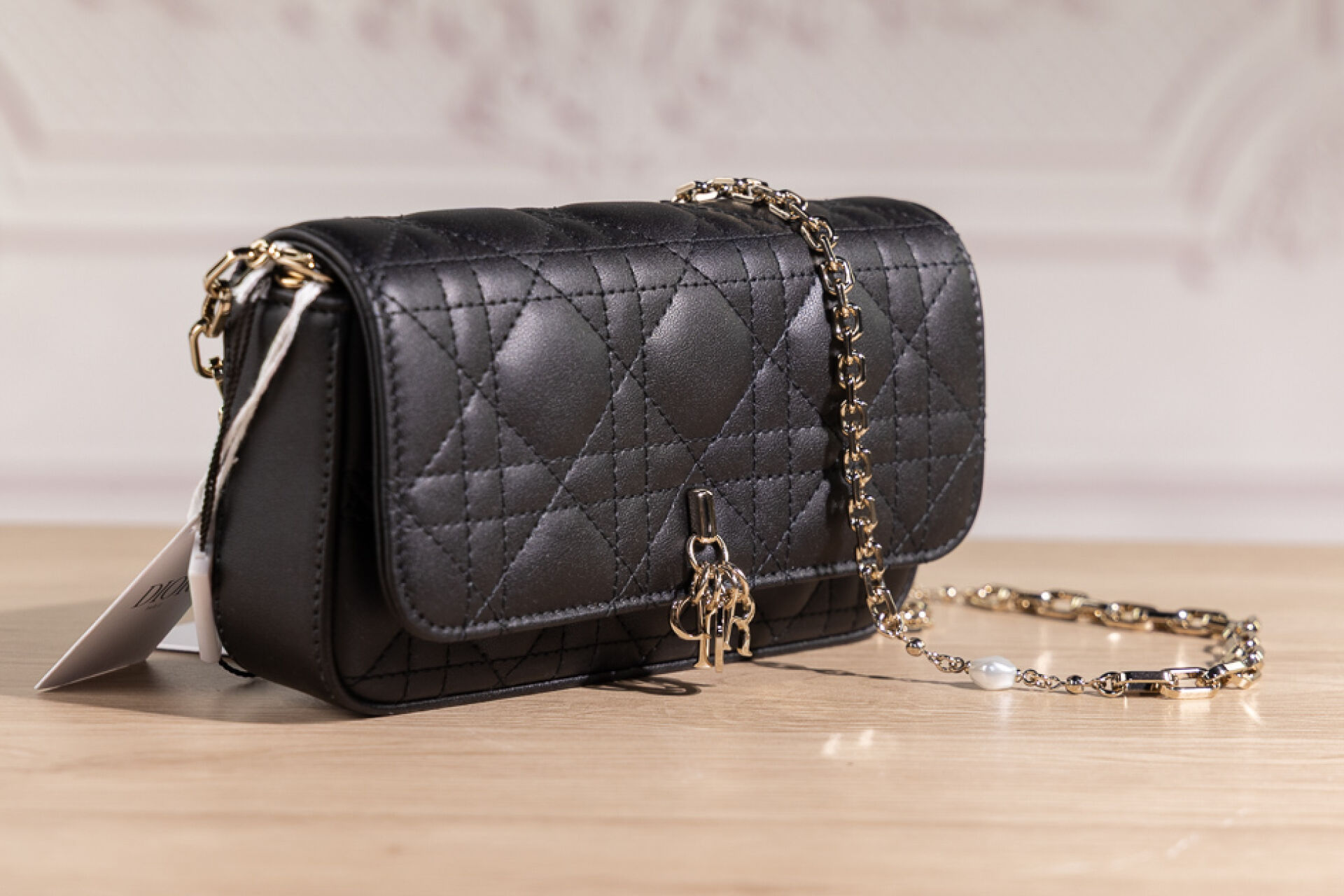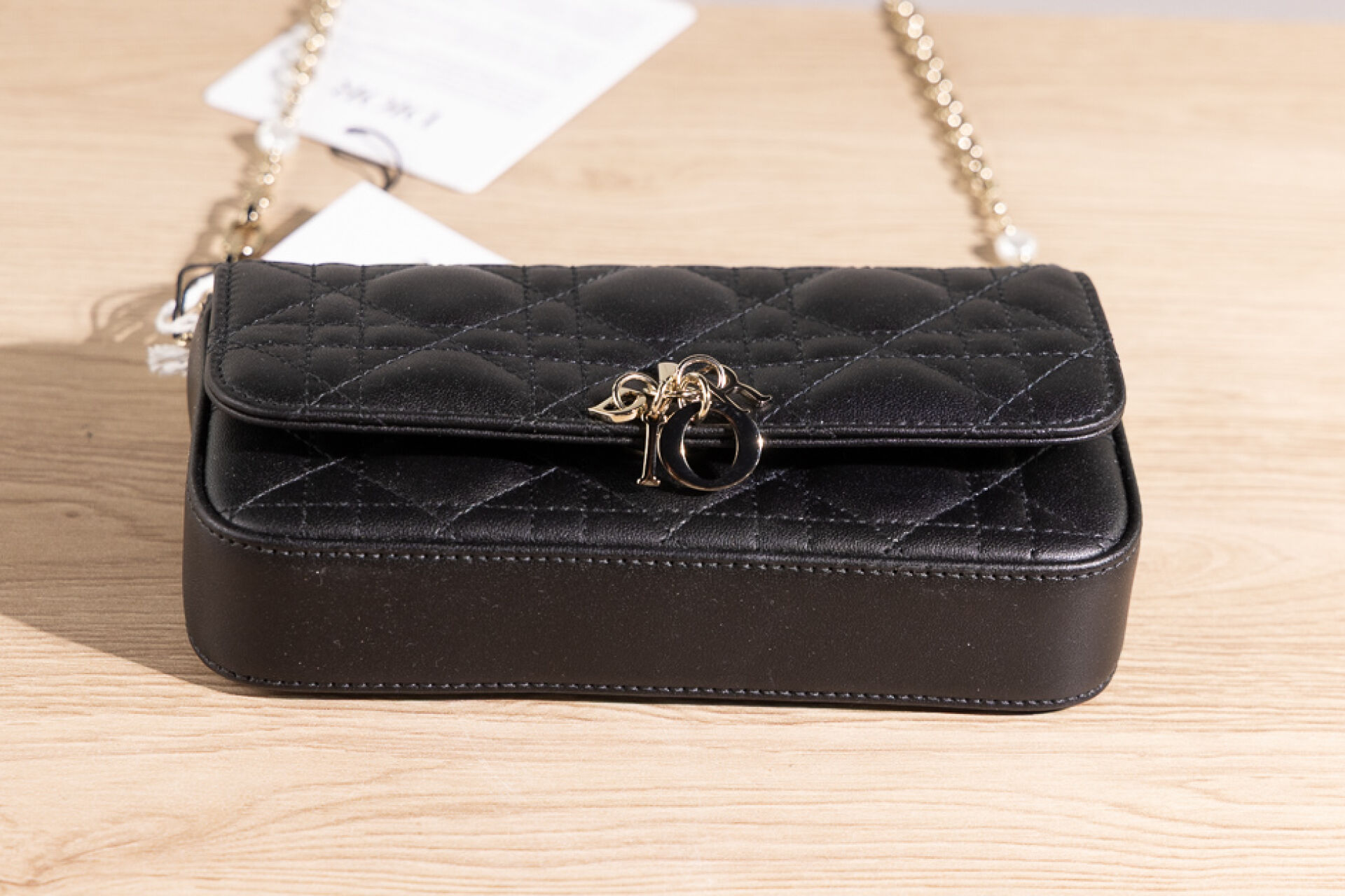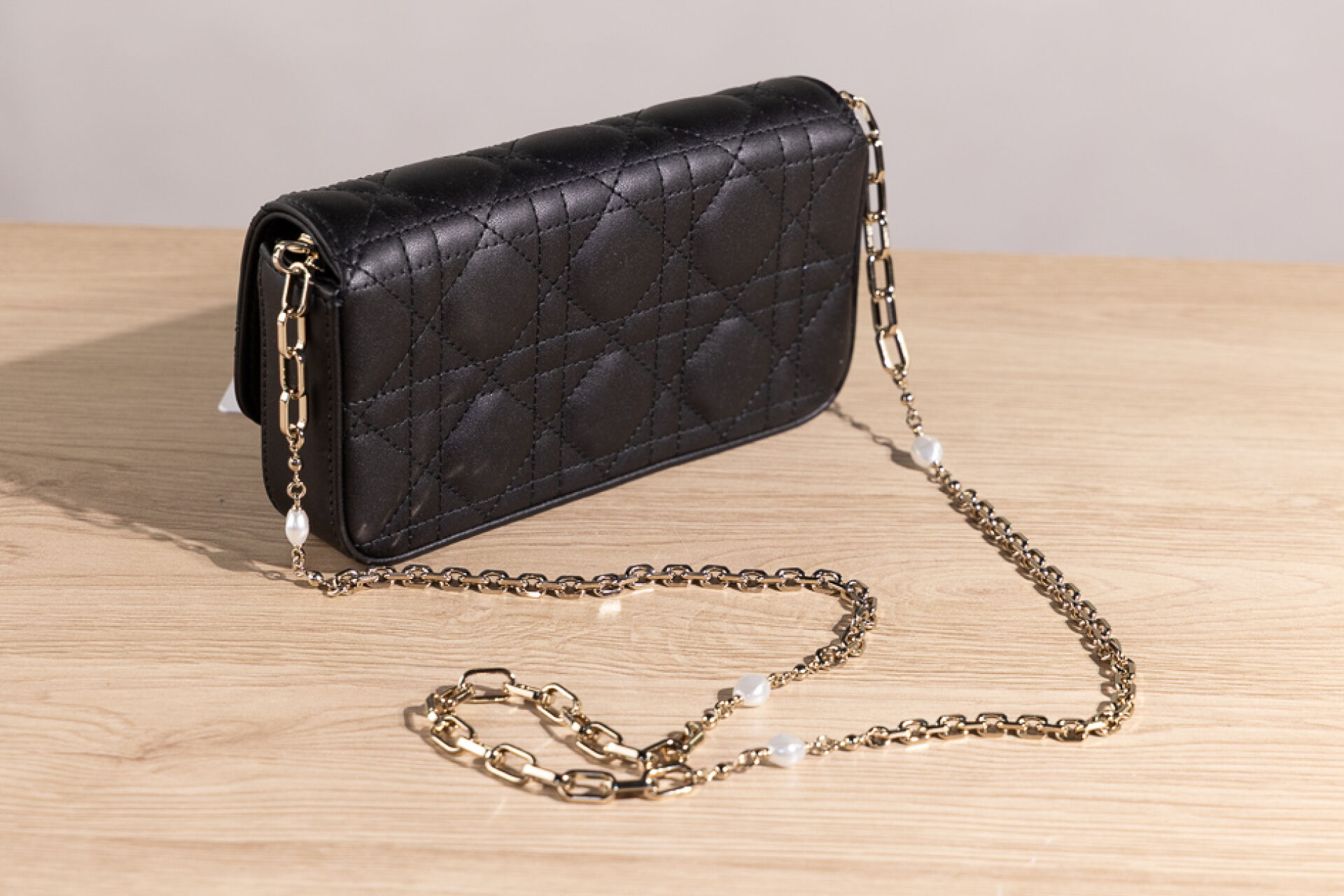 CHRISTIAN DIOR - Sac pochette en cuir noir matelassé cannage, fermoir aimanté sous rabat rehaussé des lettres dorées en pendeloque, anse chaine en métal doré et perles fantaisie amovible. Dust bag et boite. Haut. : 10 cm - Long. : 18 cm Non porté
