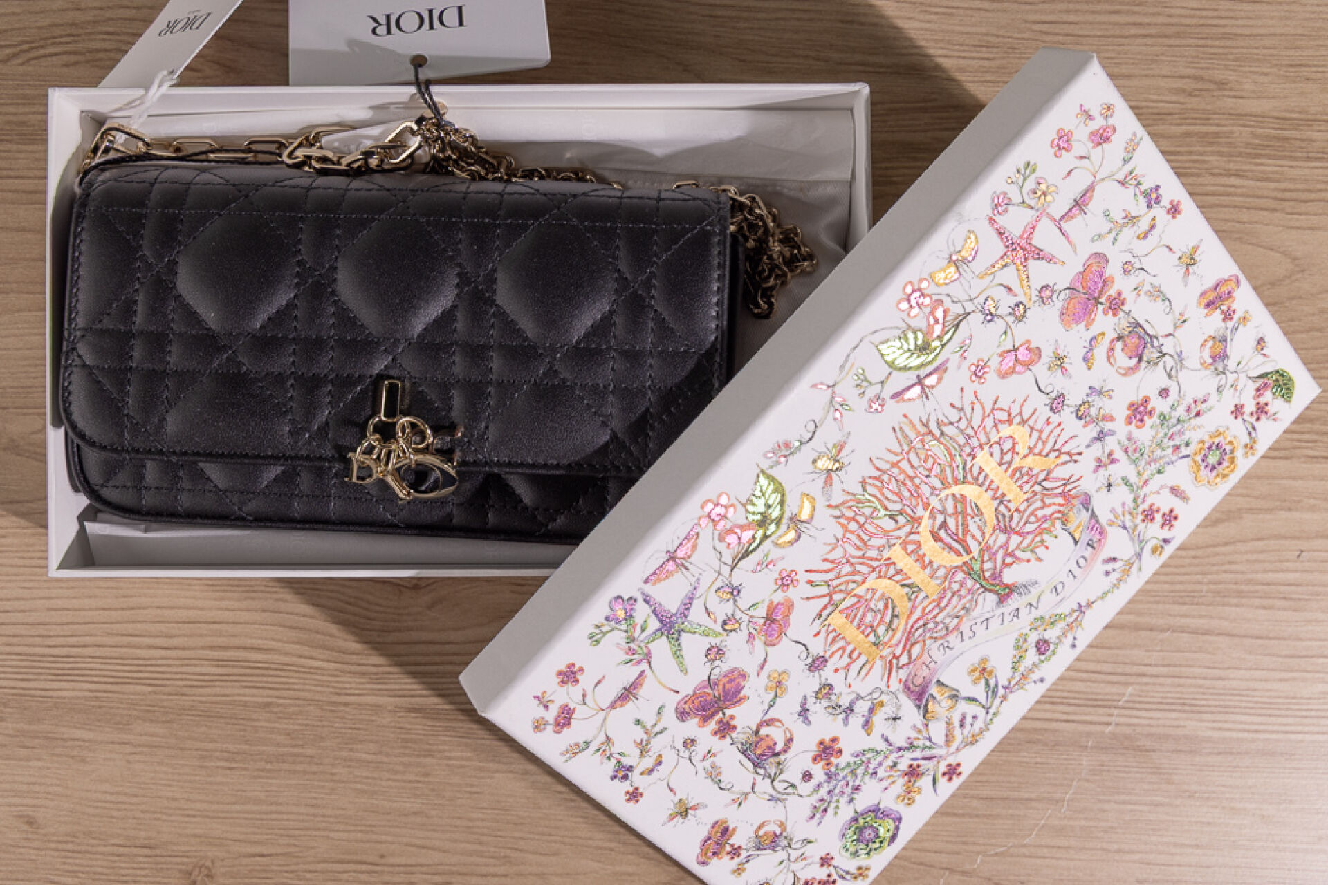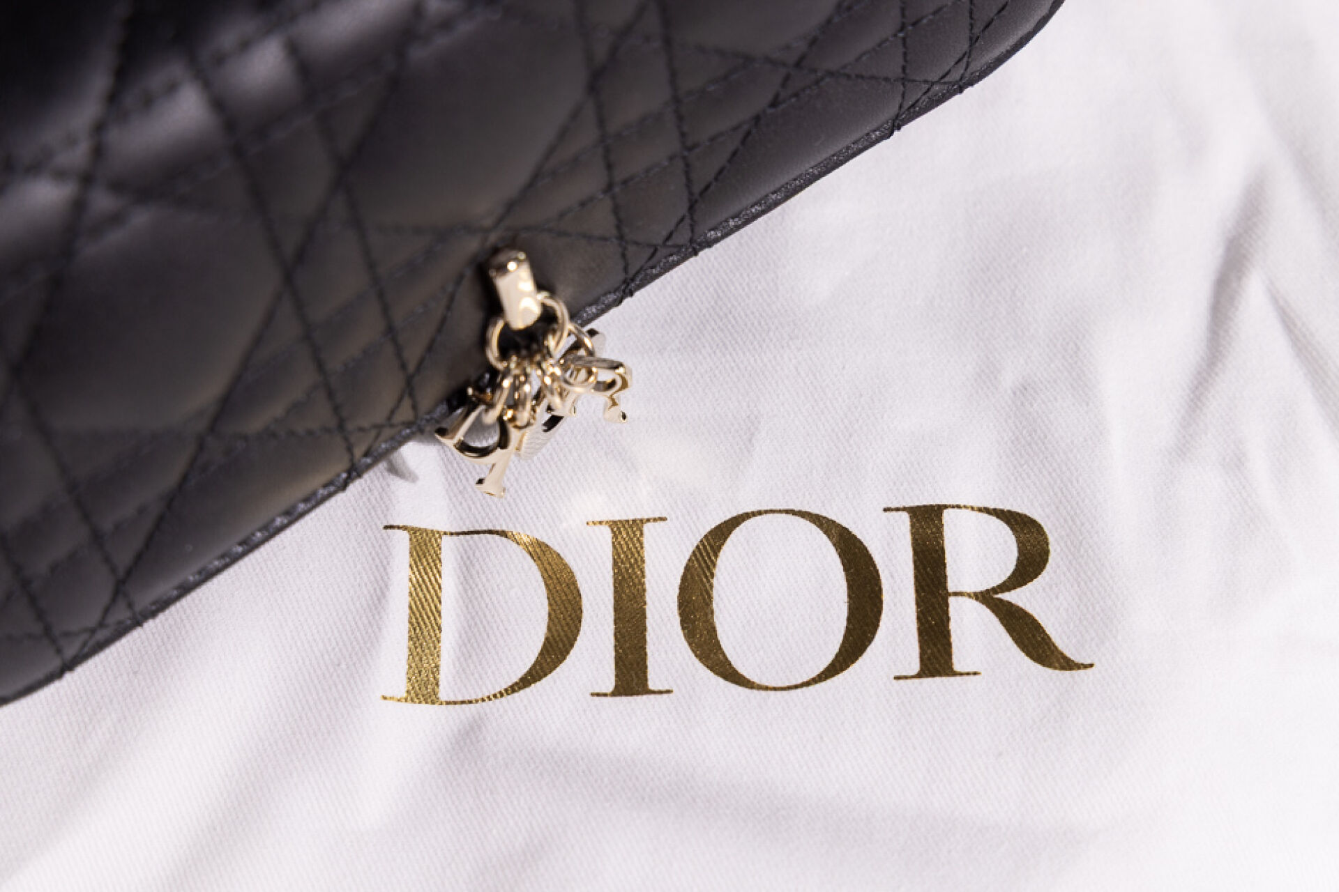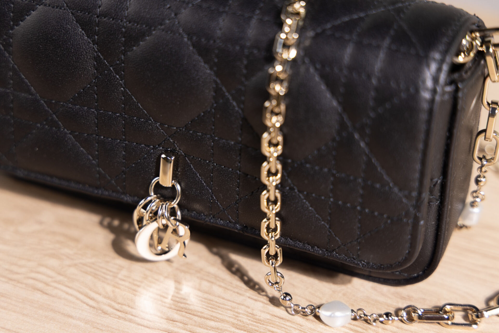 CHRISTIAN DIOR - Sac pochette en cuir noir matelassé cannage, fermoir aimanté sous rabat rehaussé des lettres dorées en pendeloque, anse chaine en métal doré et perles fantaisie amovible. Dust bag et boite. Haut. : 10 cm - Long. : 18 cm Non porté