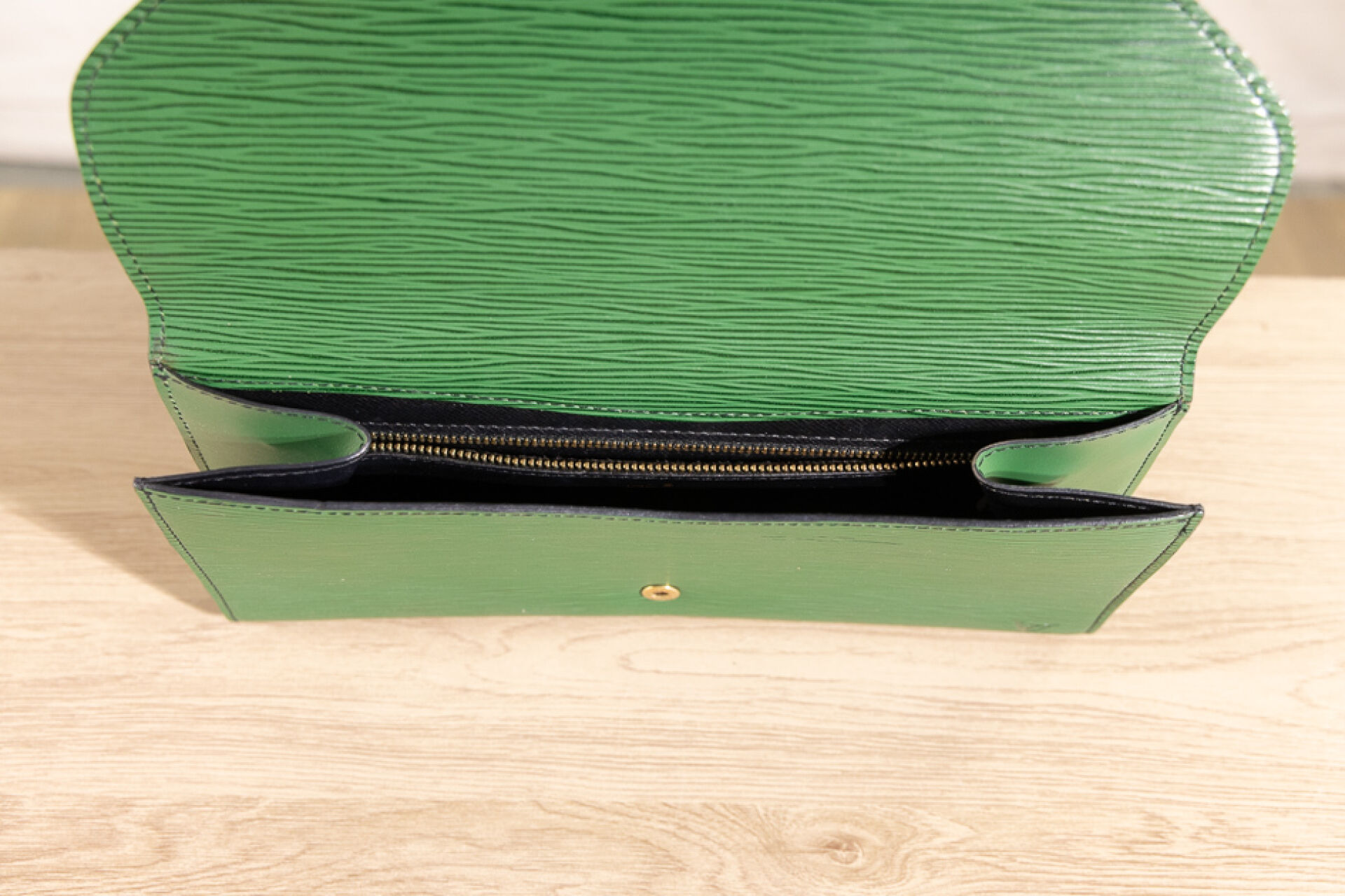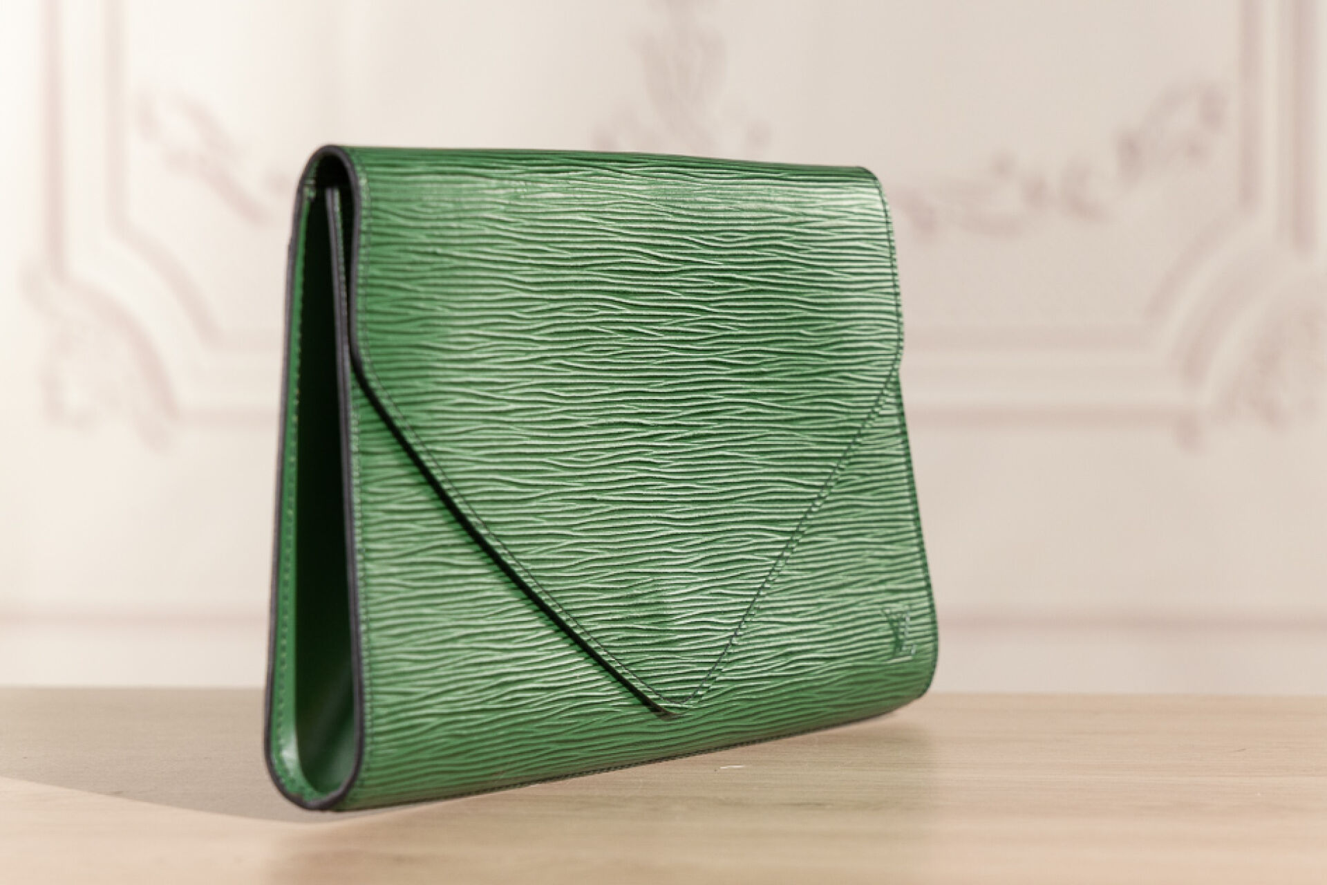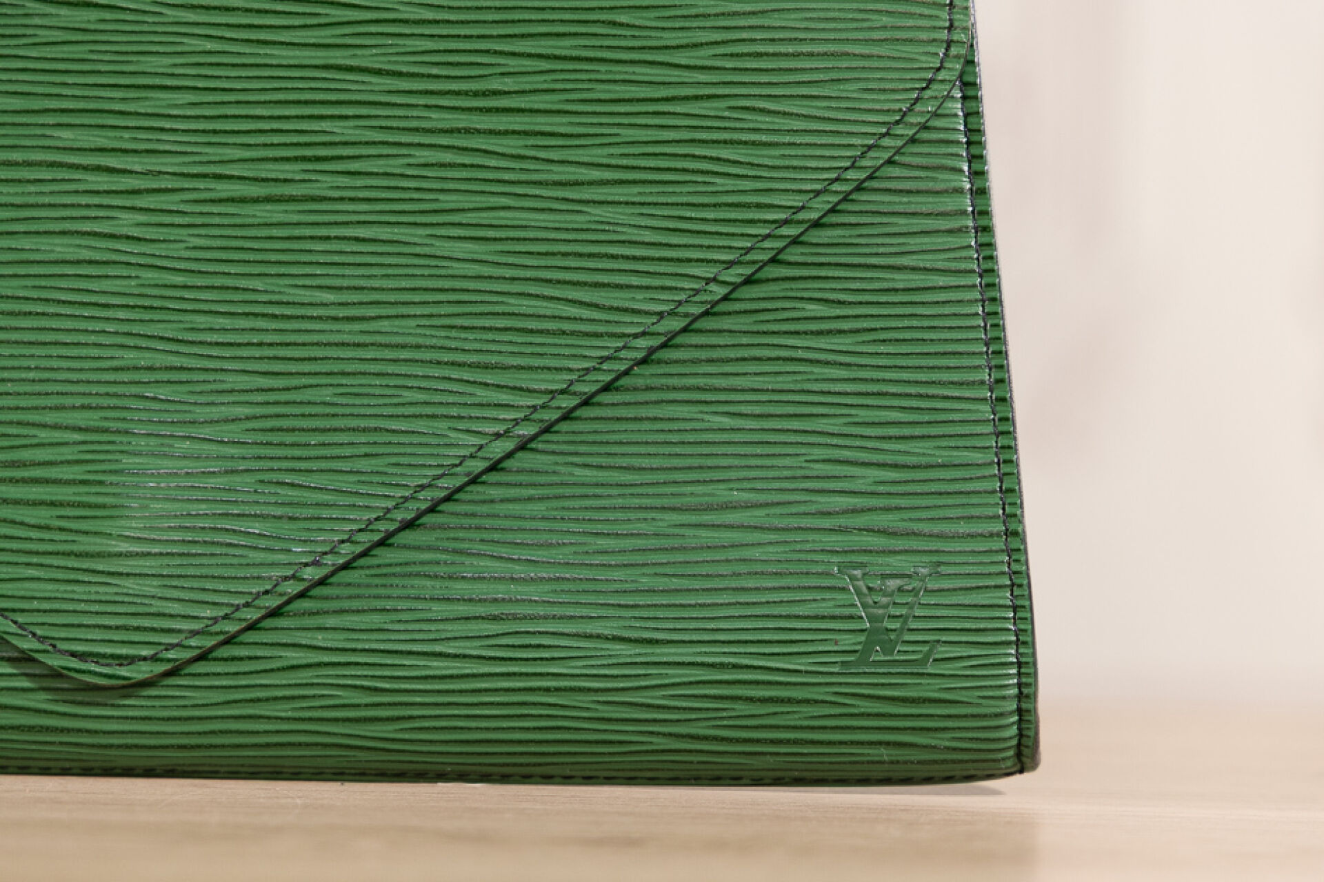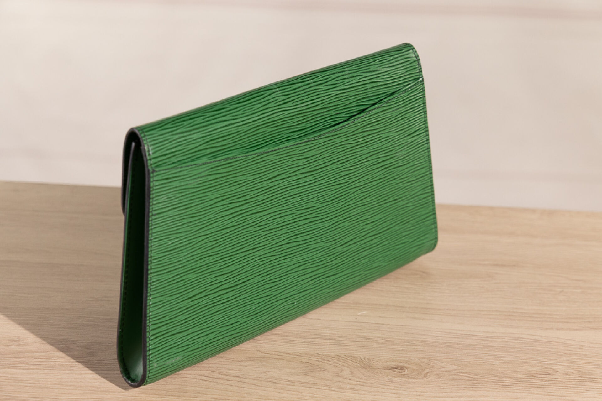 LOUIS-VUITTON - Pochette forme enveloppe en cuir épi vert, fermoir pression sous rabat, doublure en cuir taïga noir. Haut. : 17 cm - Long. : 27 cm Tampon Louis Vuitton Paris Made in France, numéroté VI0940 Bon état général, cependant quelques griffures et doublure collante