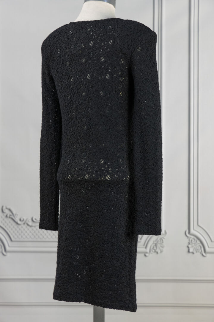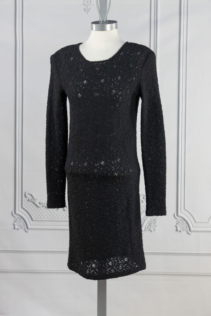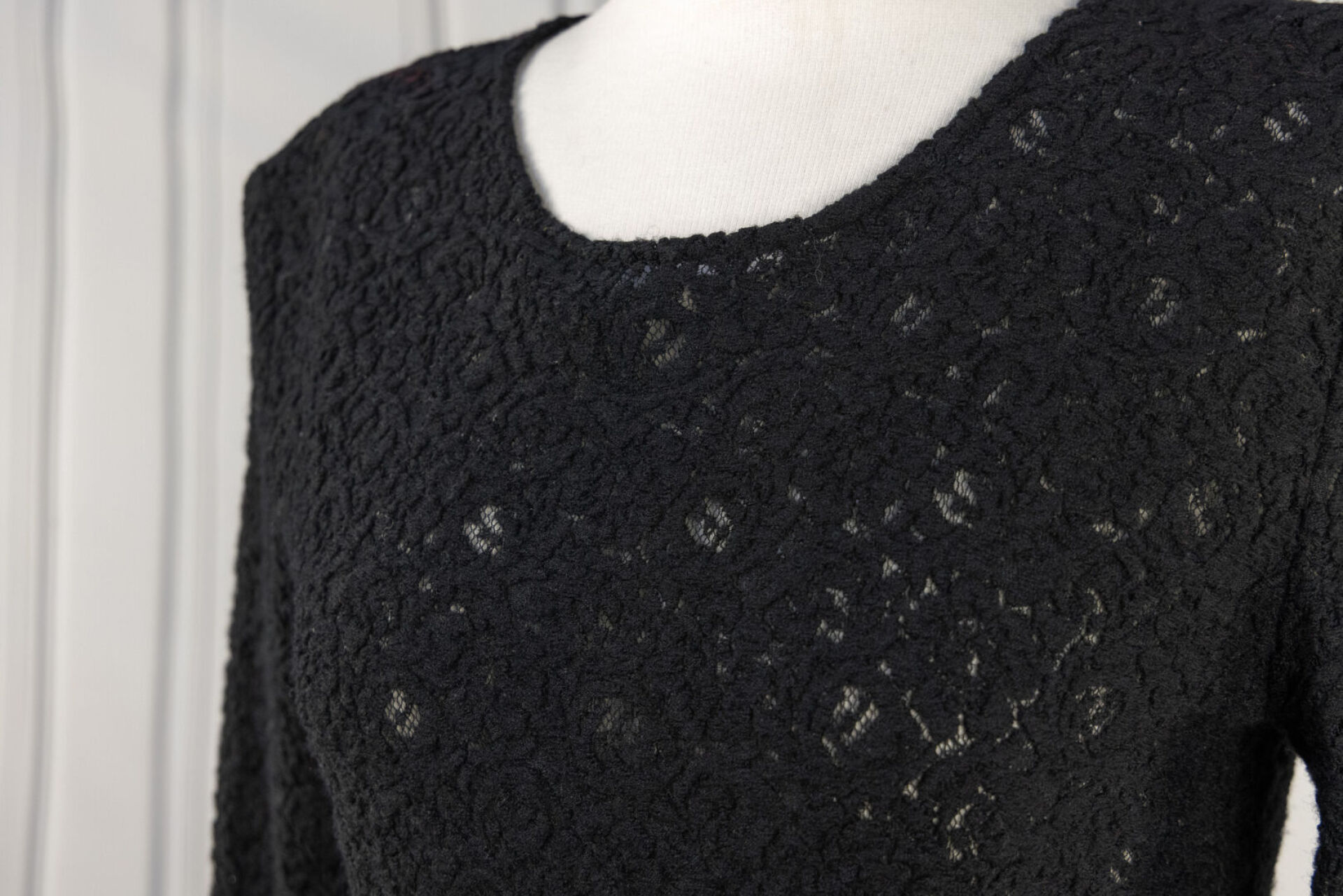 YOHJI YAMAMOTO - Robe droite en laine mélangée noire motif floral sur résille, encolure ronde, manches longues. Griffe noire, graphisme gris. Taille M Très bon état