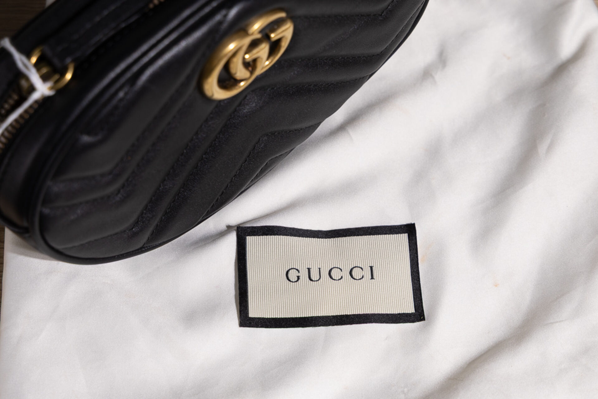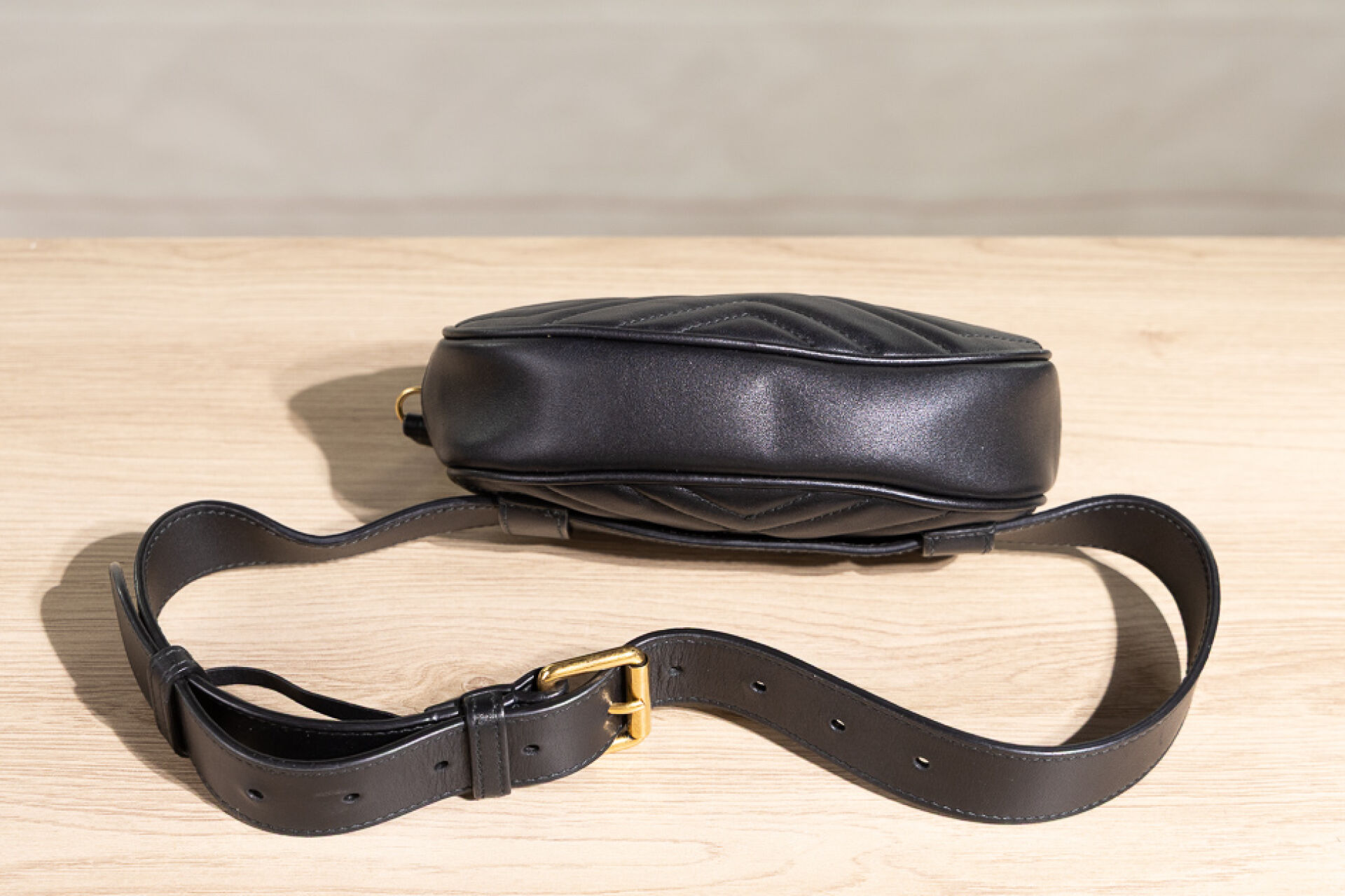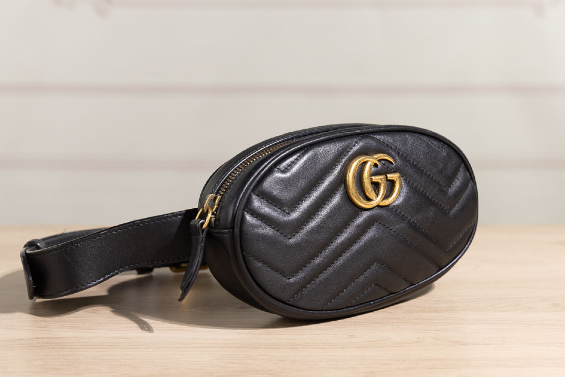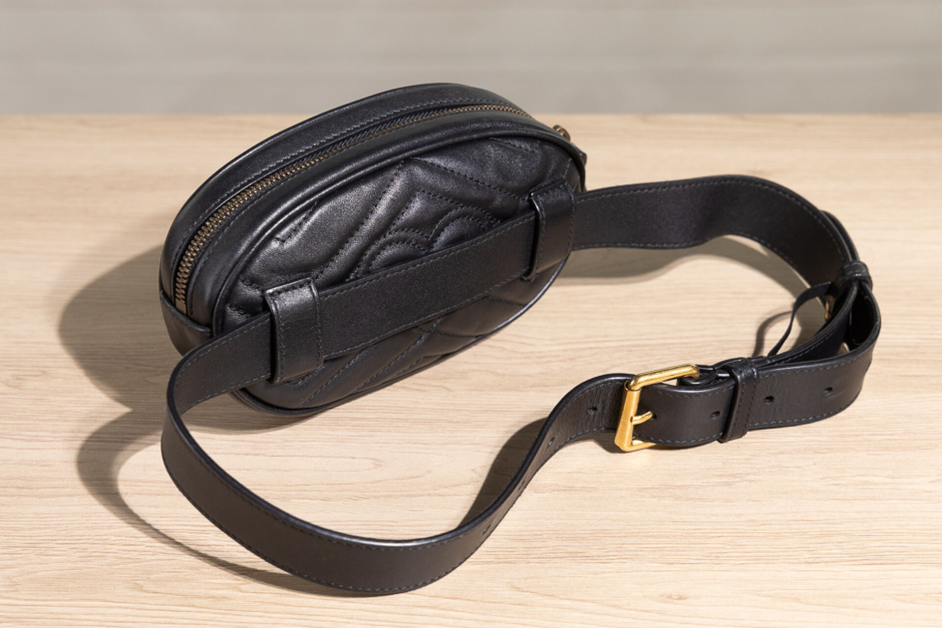 GUCCI - Pochette marmon en cuir surpiqué noir, fermeture à glissière se coulissant pour un porté banane ou sacoche sur ceinture. Dust bag. Taille indiquée 75 Haut. : 11 cm - Long. : 17 cm Bon état