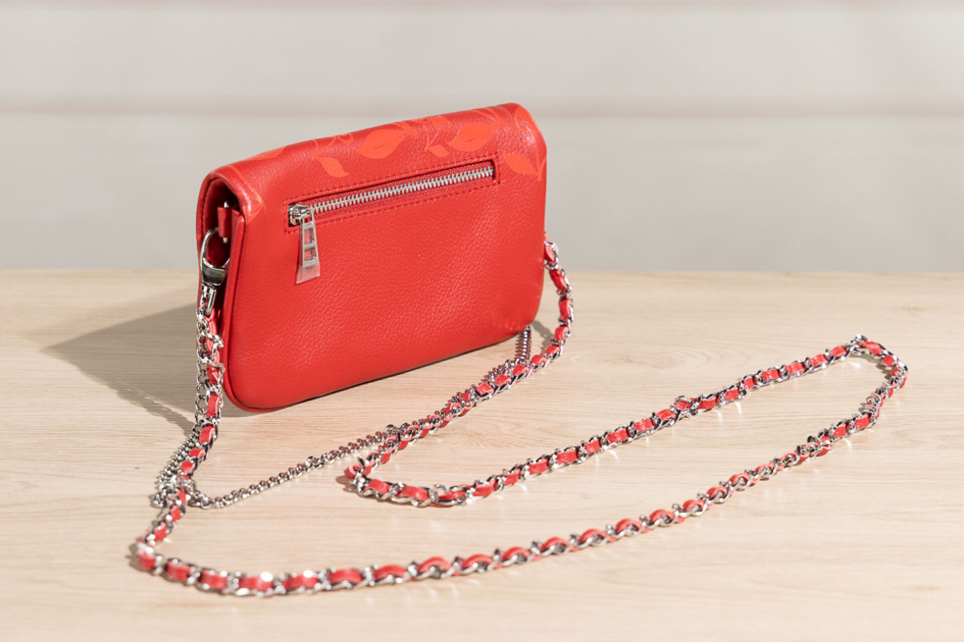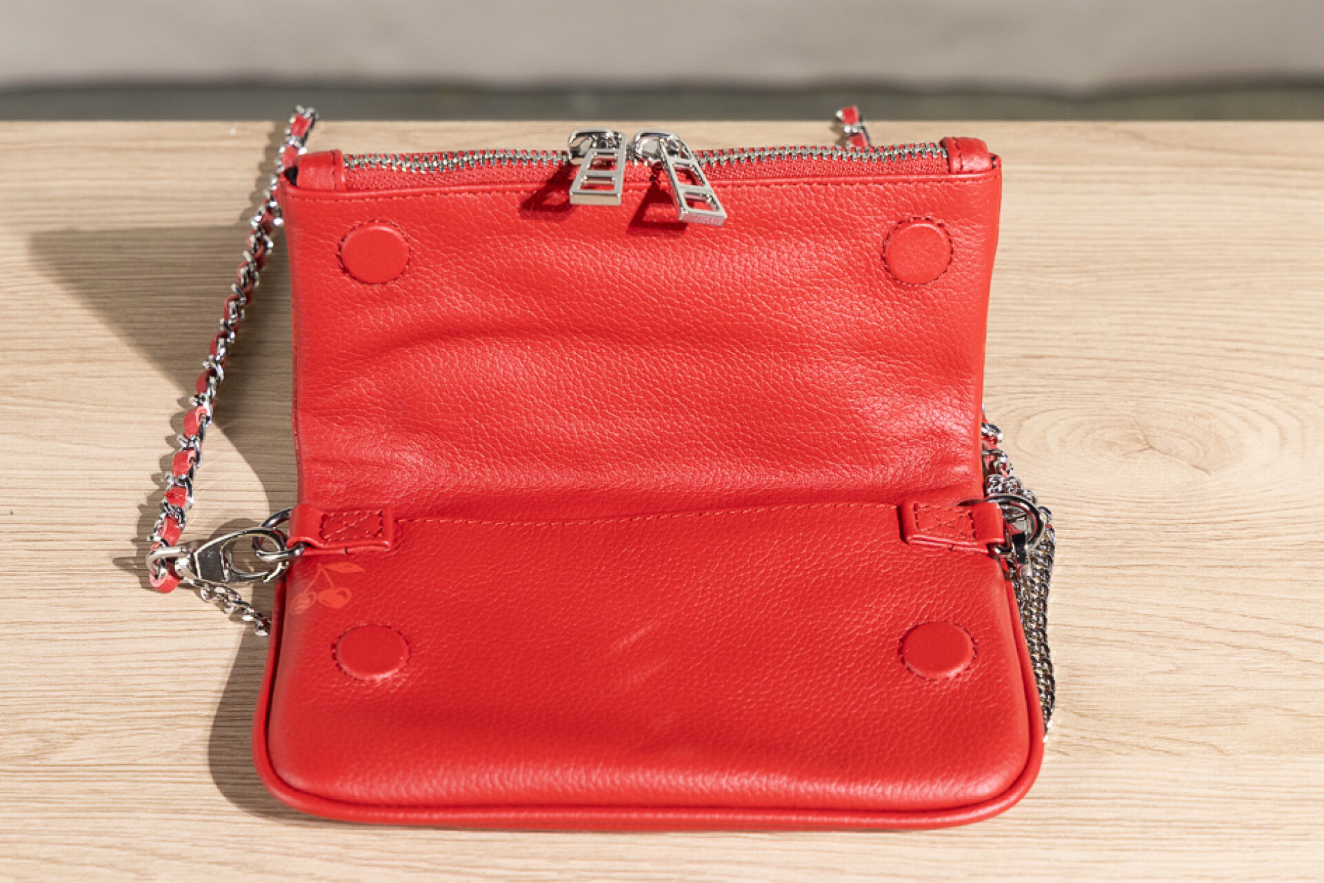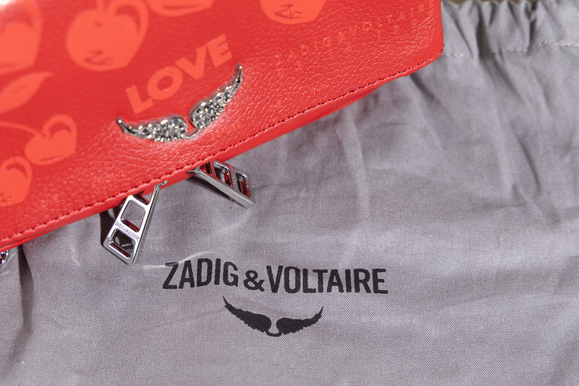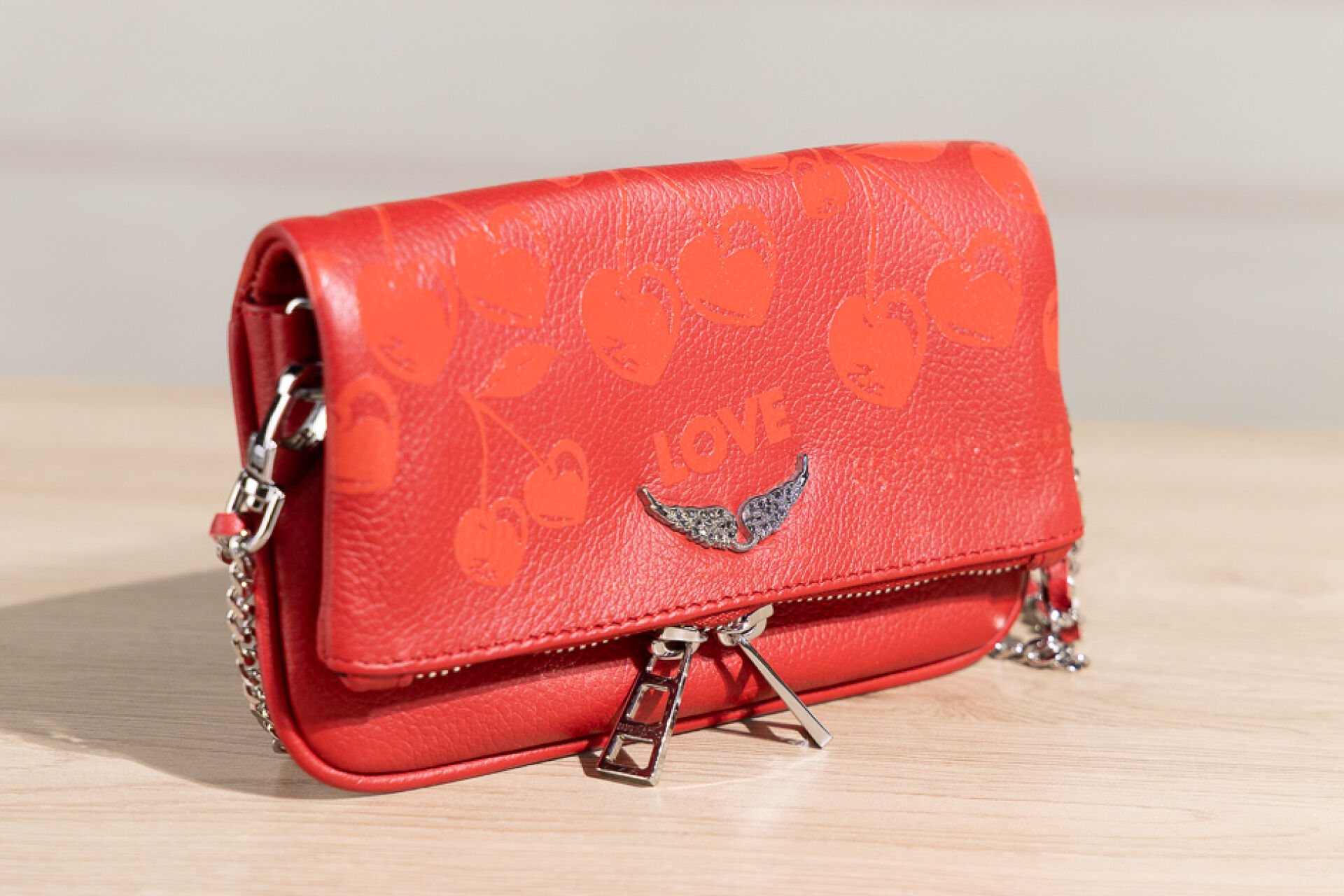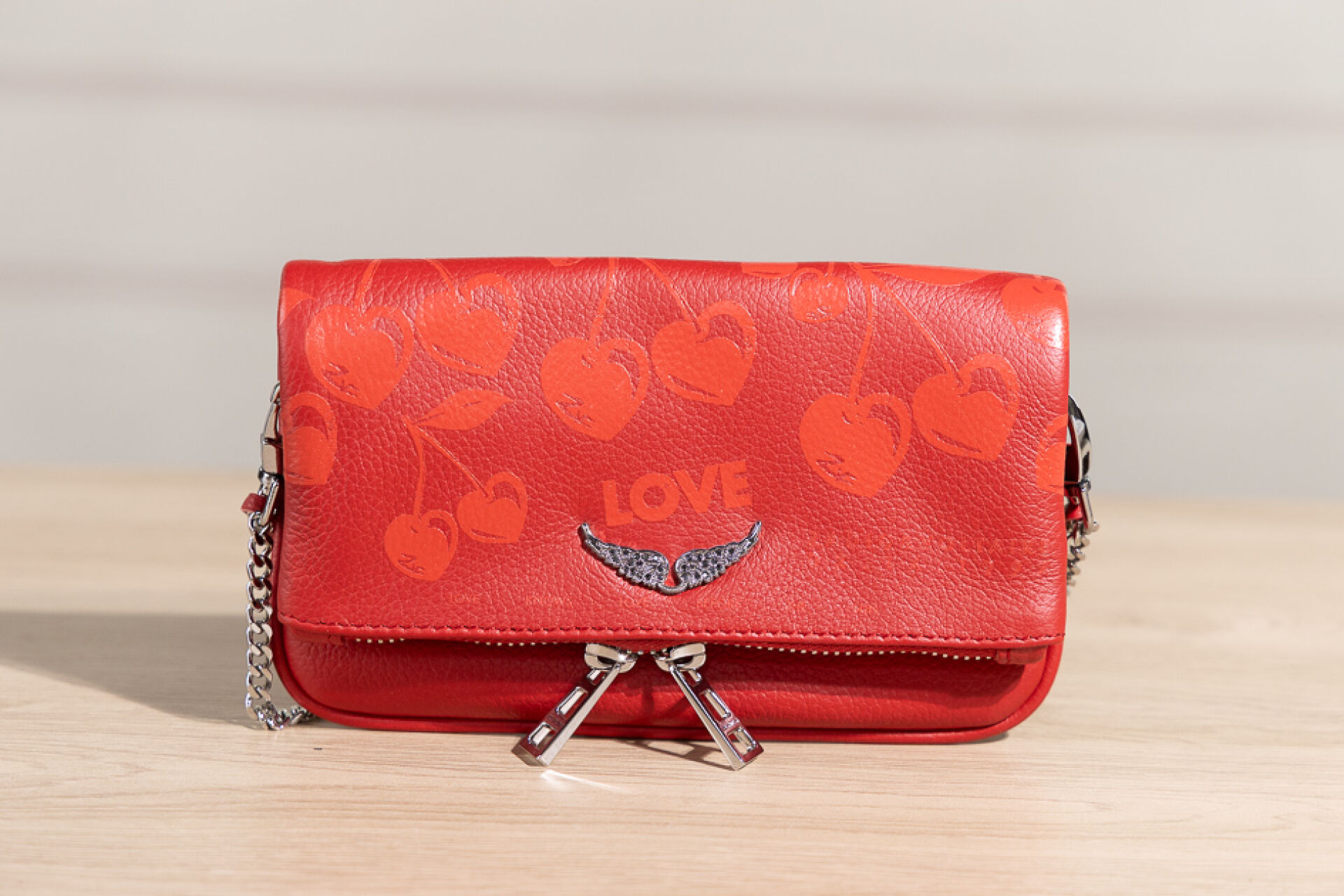 ZADIG & VOLTAIRE - Mini sac rock en cuir rouge rehaussé de cerises cœur, double fermoir aimanté sous rabat, poche zippée au dos, double anse chaine, l'une en cuir entrelacé. Dust bag Haut. : 10 cm - Long. : 17 cm Très bon état