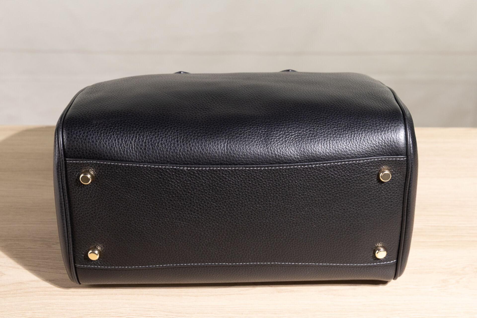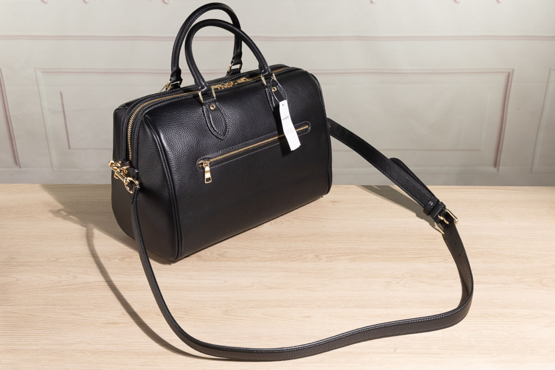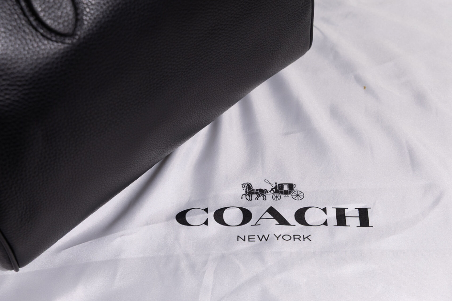 COACH - Sac polochon en cuir grainé noir, double poignée, fermeture à glissière, anse bandoulière amovible. Dust bag. Haut. : 22 cm - Long. : 30 cm État neuf