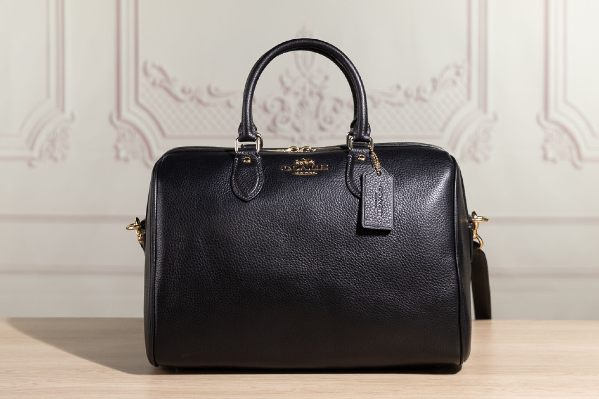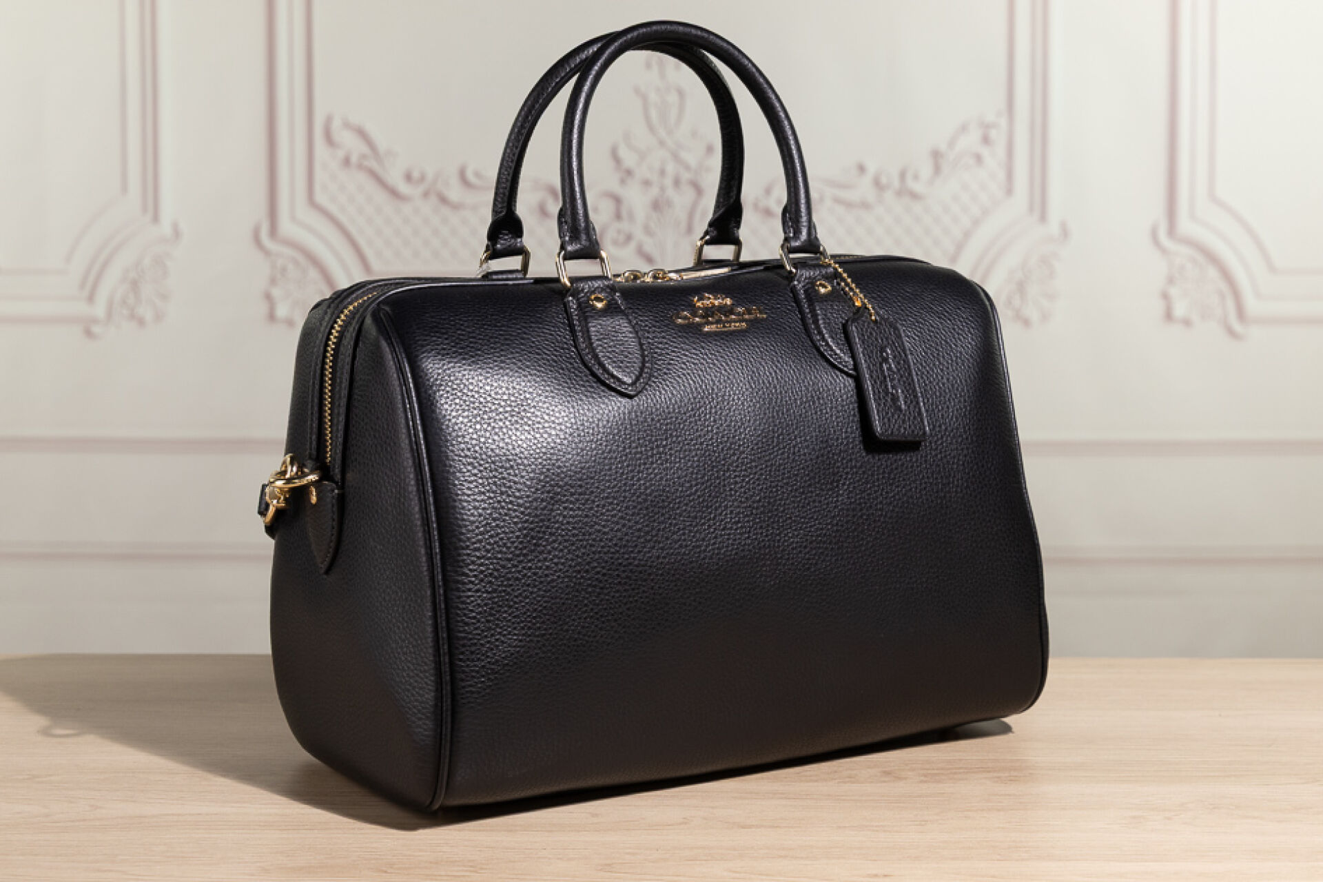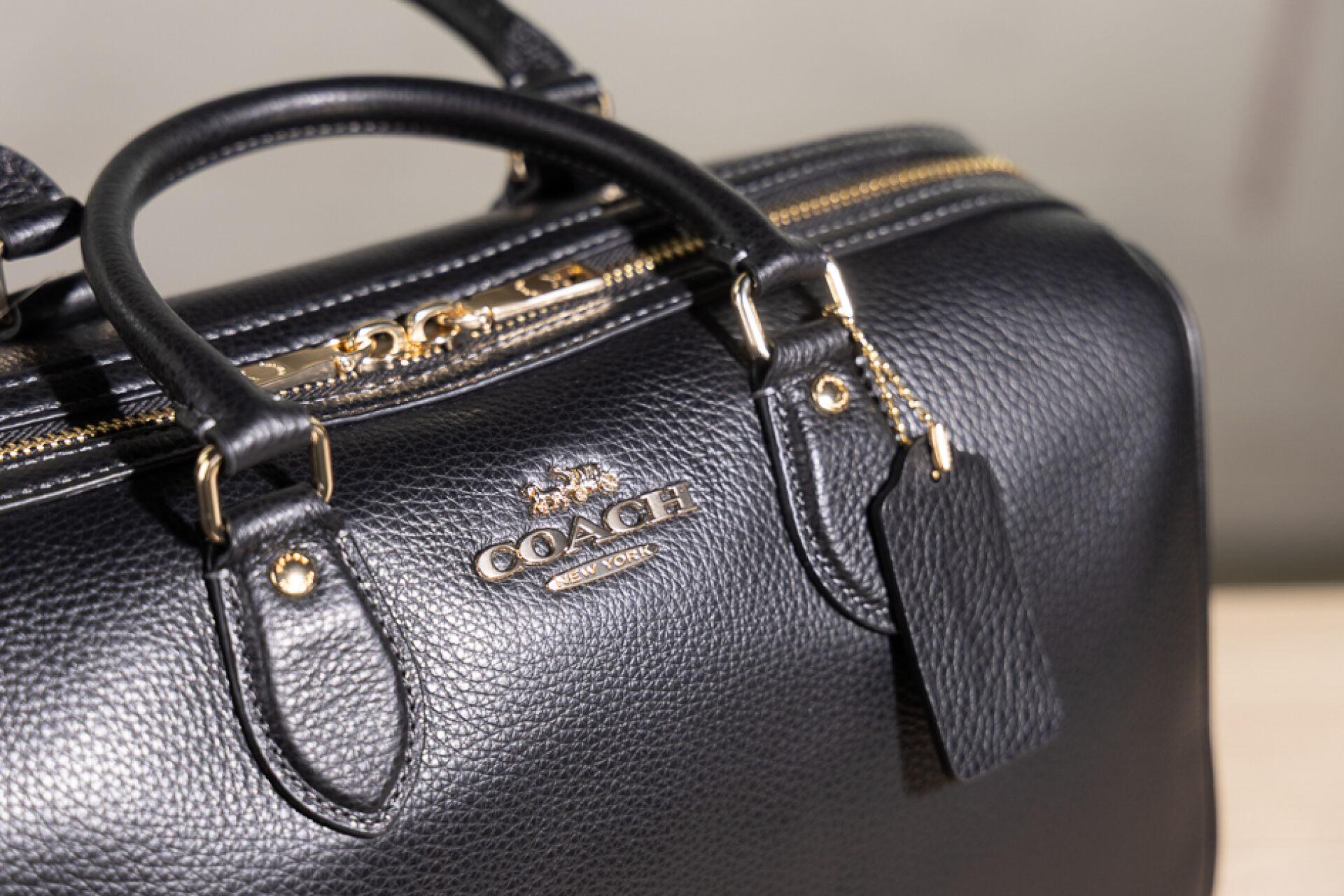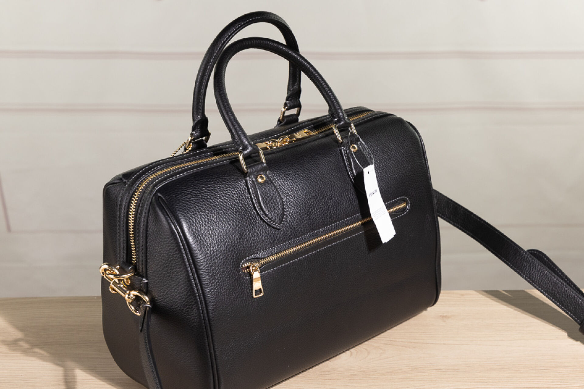 COACH - Sac polochon en cuir grainé noir, double poignée, fermeture à glissière, anse bandoulière amovible. Dust bag. Haut. : 22 cm - Long. : 30 cm État neuf