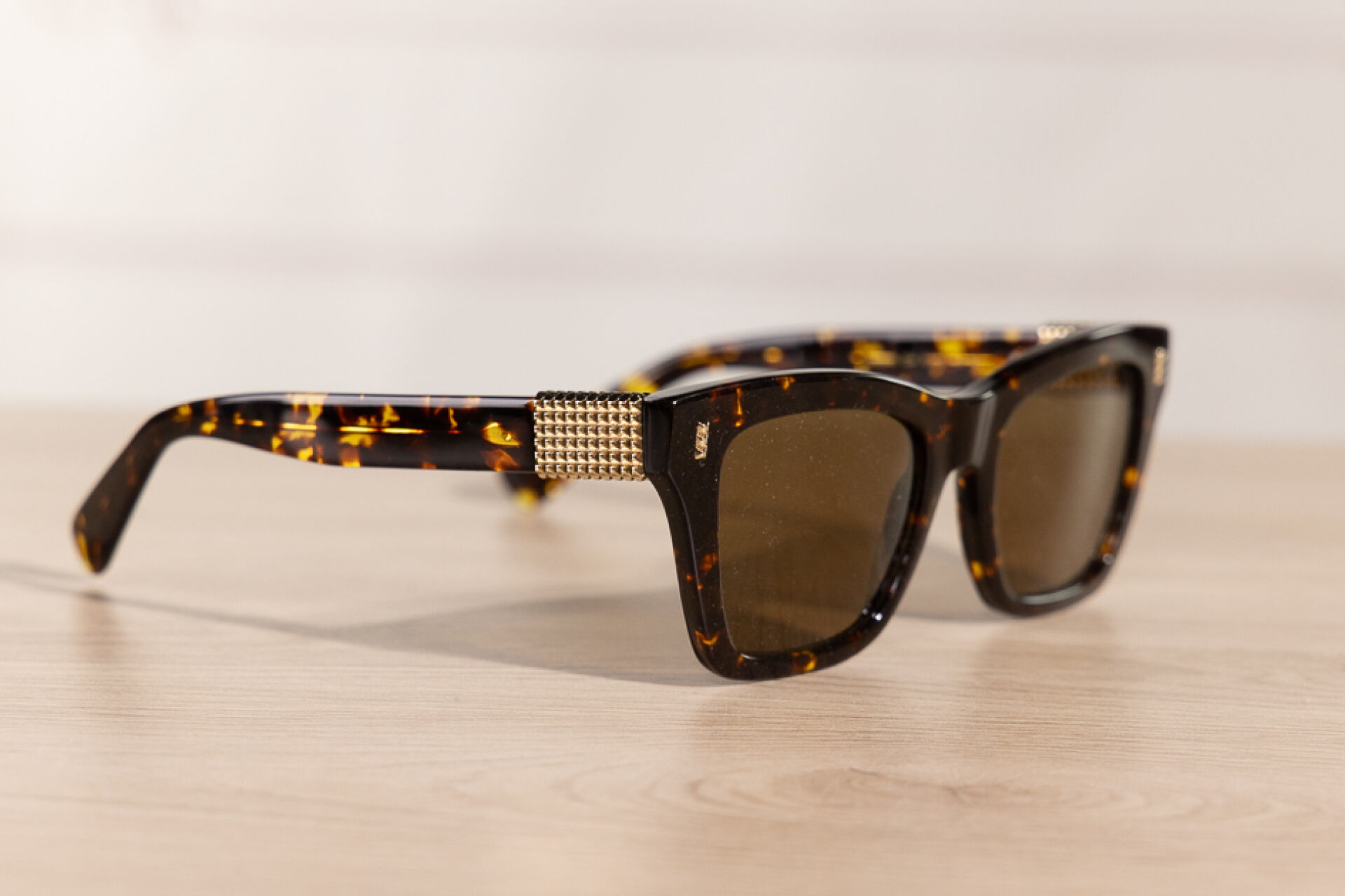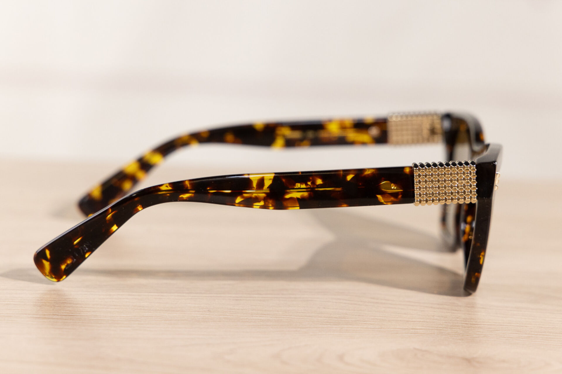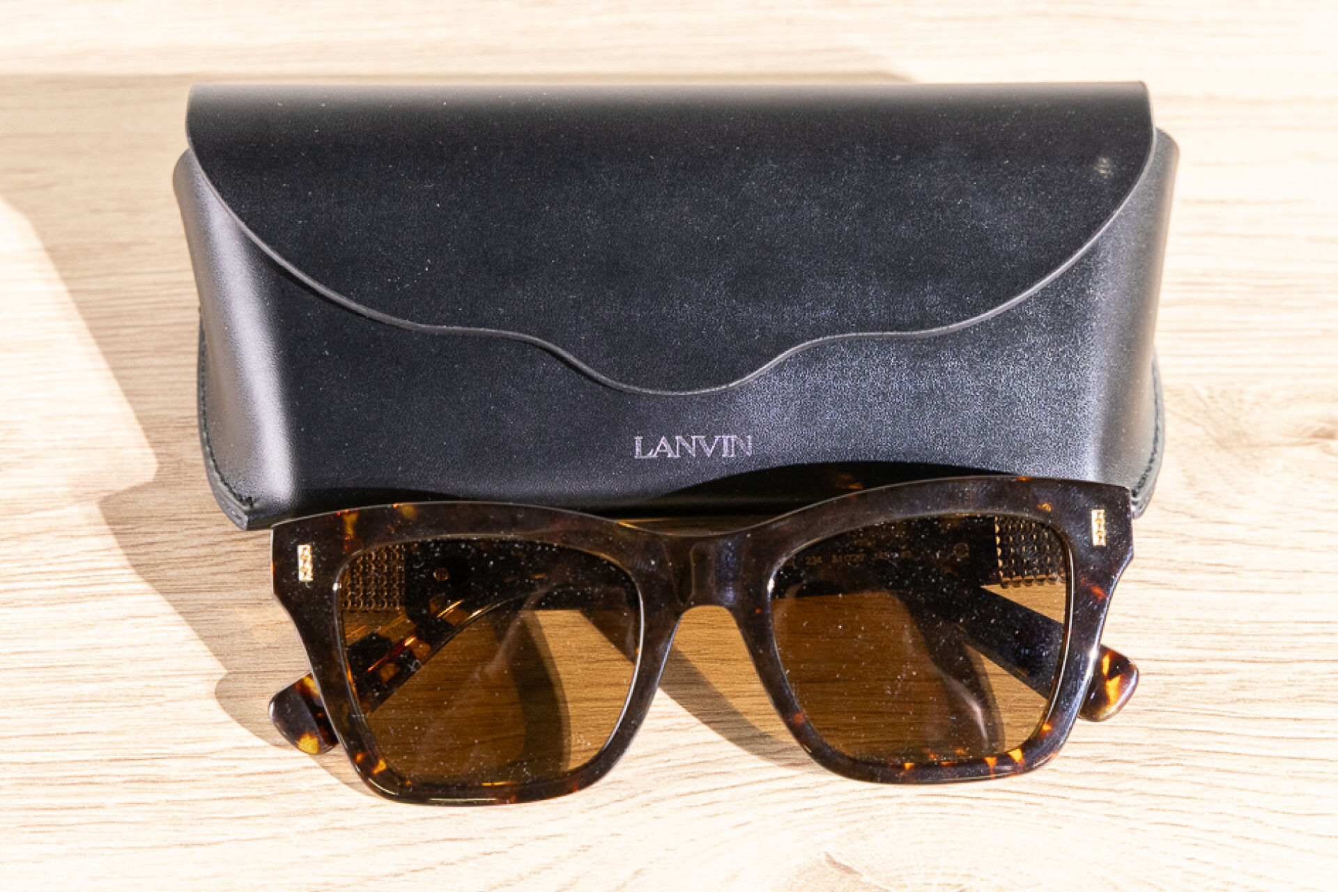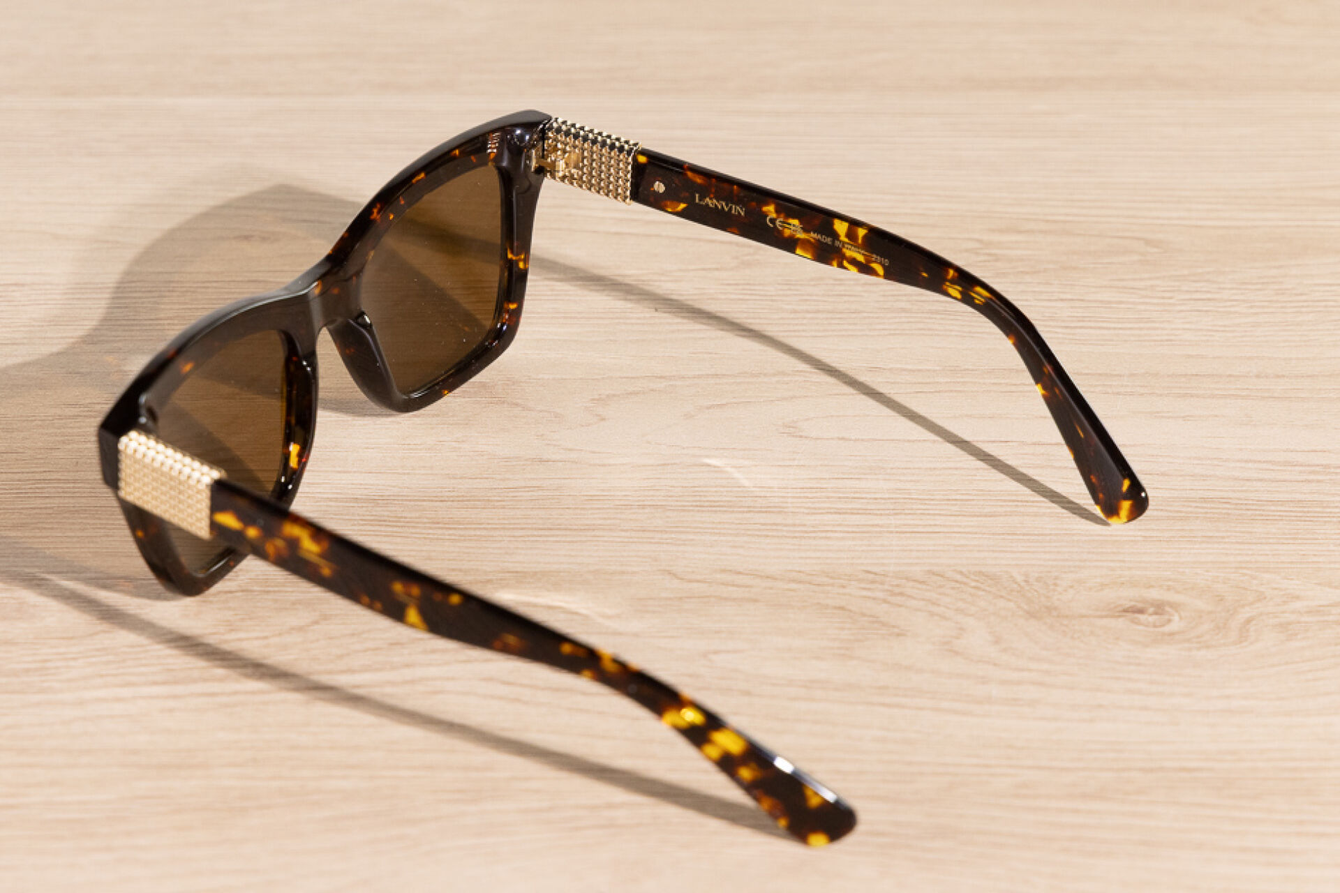 LANVIN - Paire de solaires marbrée panthère, attaches de branches à bagues en métal doré gravé, dans leur étui. Non portées