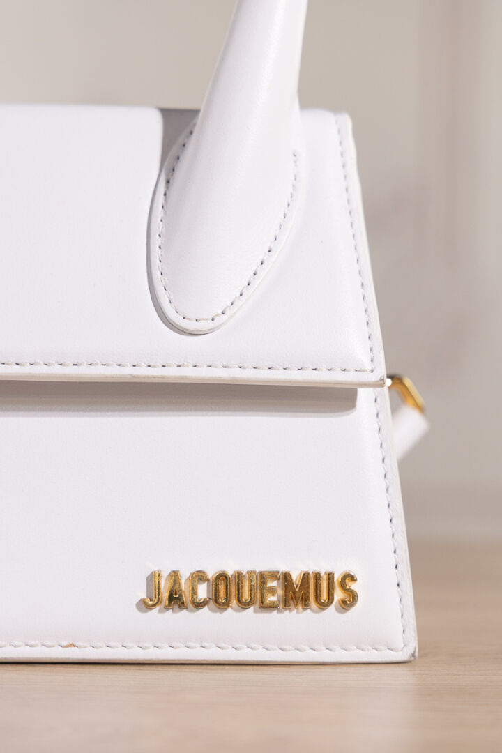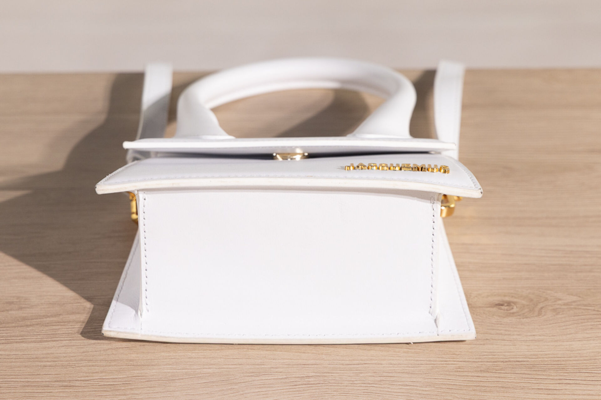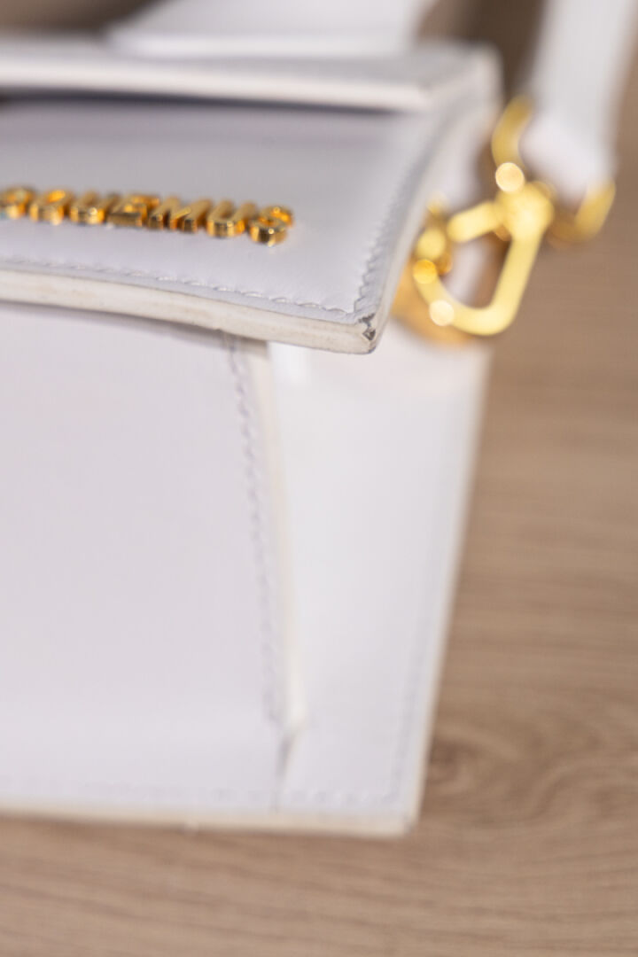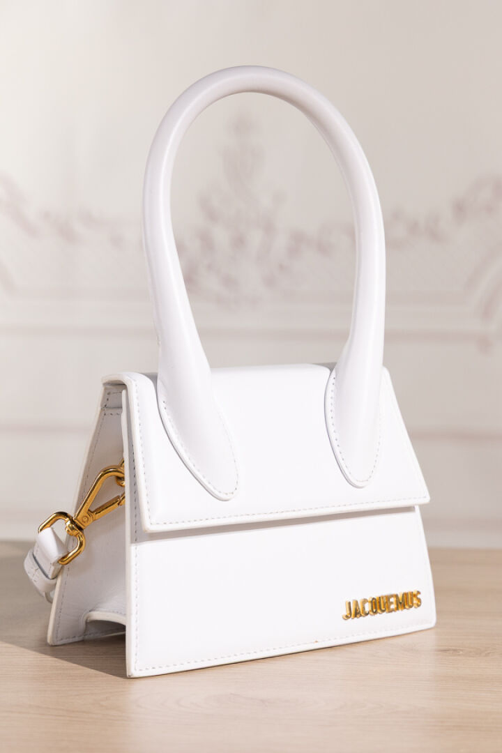 JACQUEMUS - Sac "Chiquito" en cuir blanc, fermoir aimanté sous rabat, poignée, anse bandoulière réglable, doublure toile naturelle. Dust bag. Haut. : 14 cm - Long. : 18 cm Quelques lettres oxydées