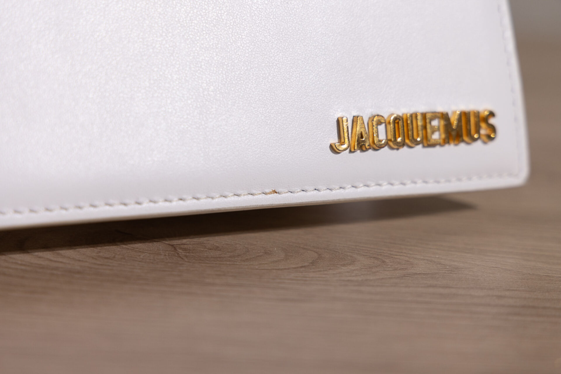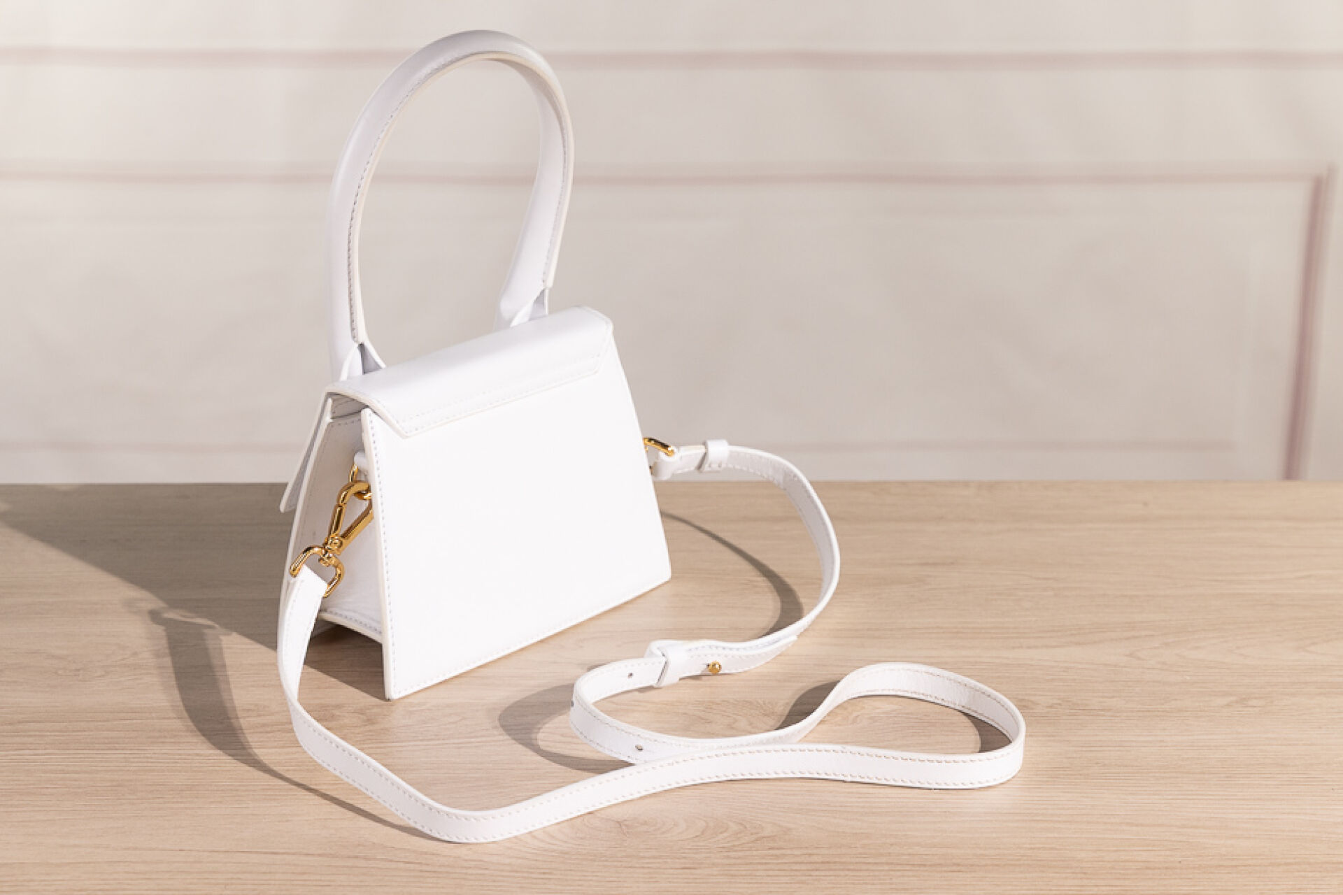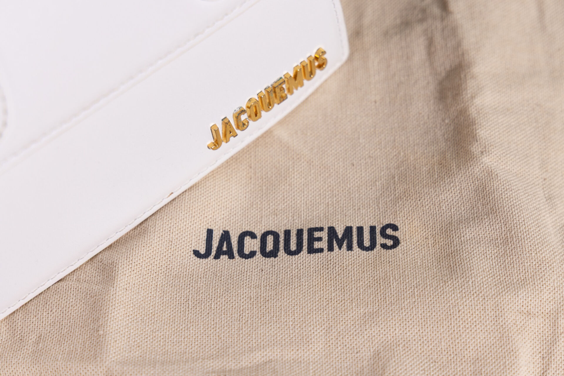 JACQUEMUS - Sac "Chiquito" en cuir blanc, fermoir aimanté sous rabat, poignée, anse bandoulière réglable, doublure toile naturelle. Dust bag. Haut. : 14 cm - Long. : 18 cm Quelques lettres oxydées