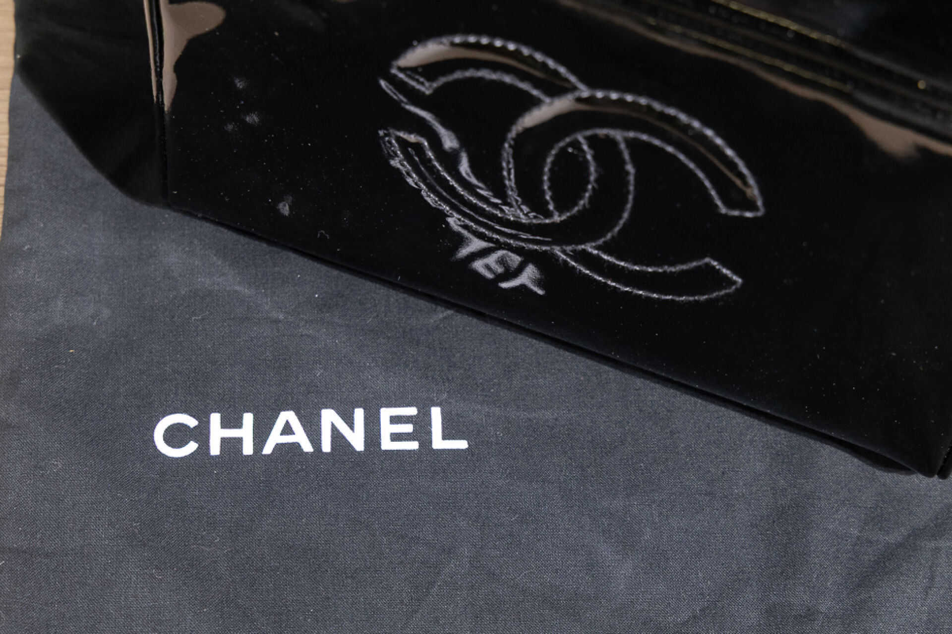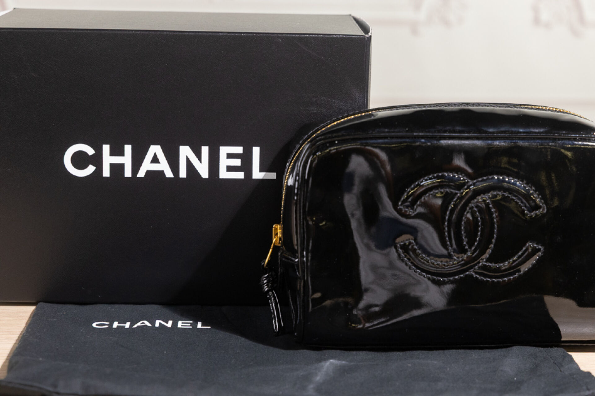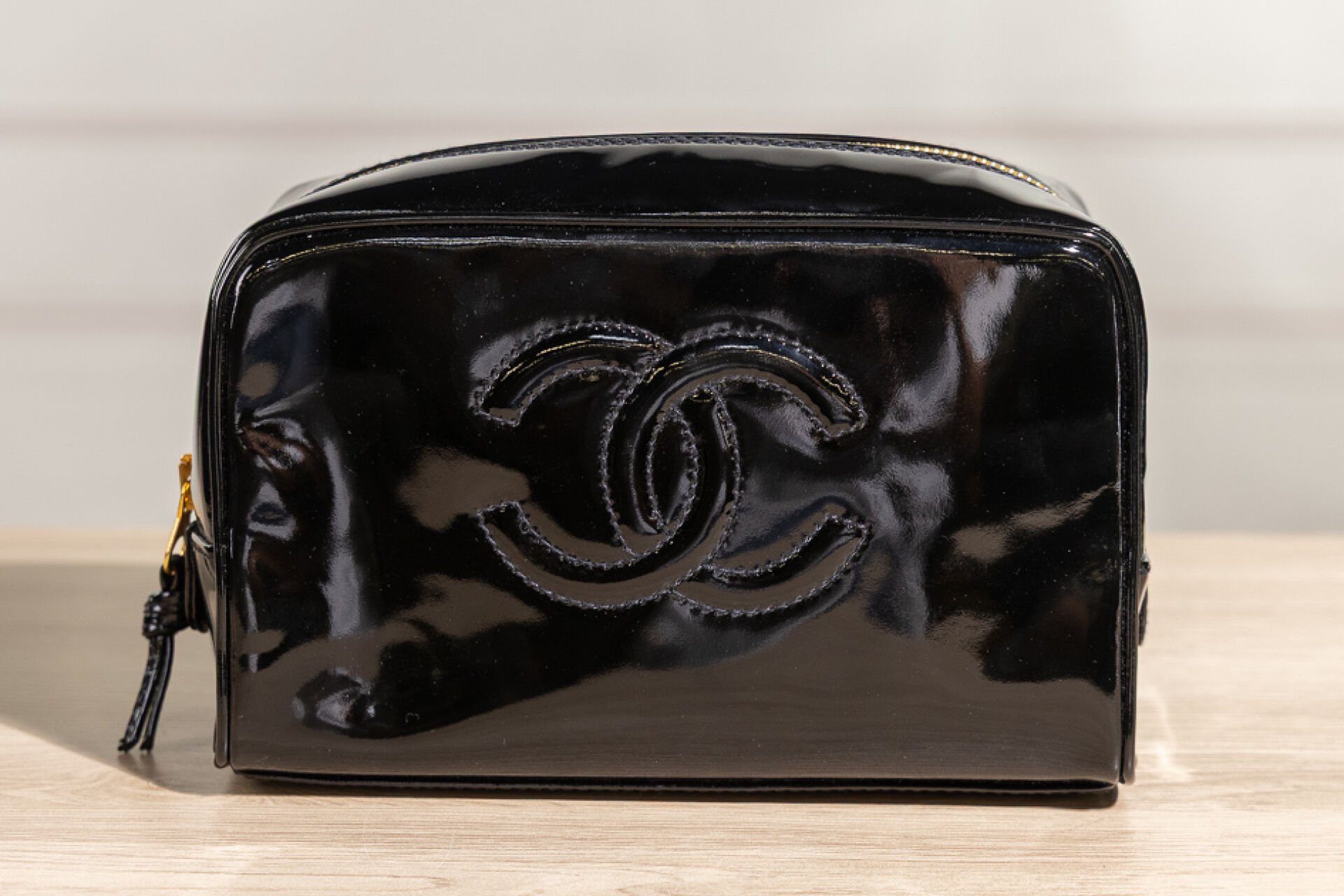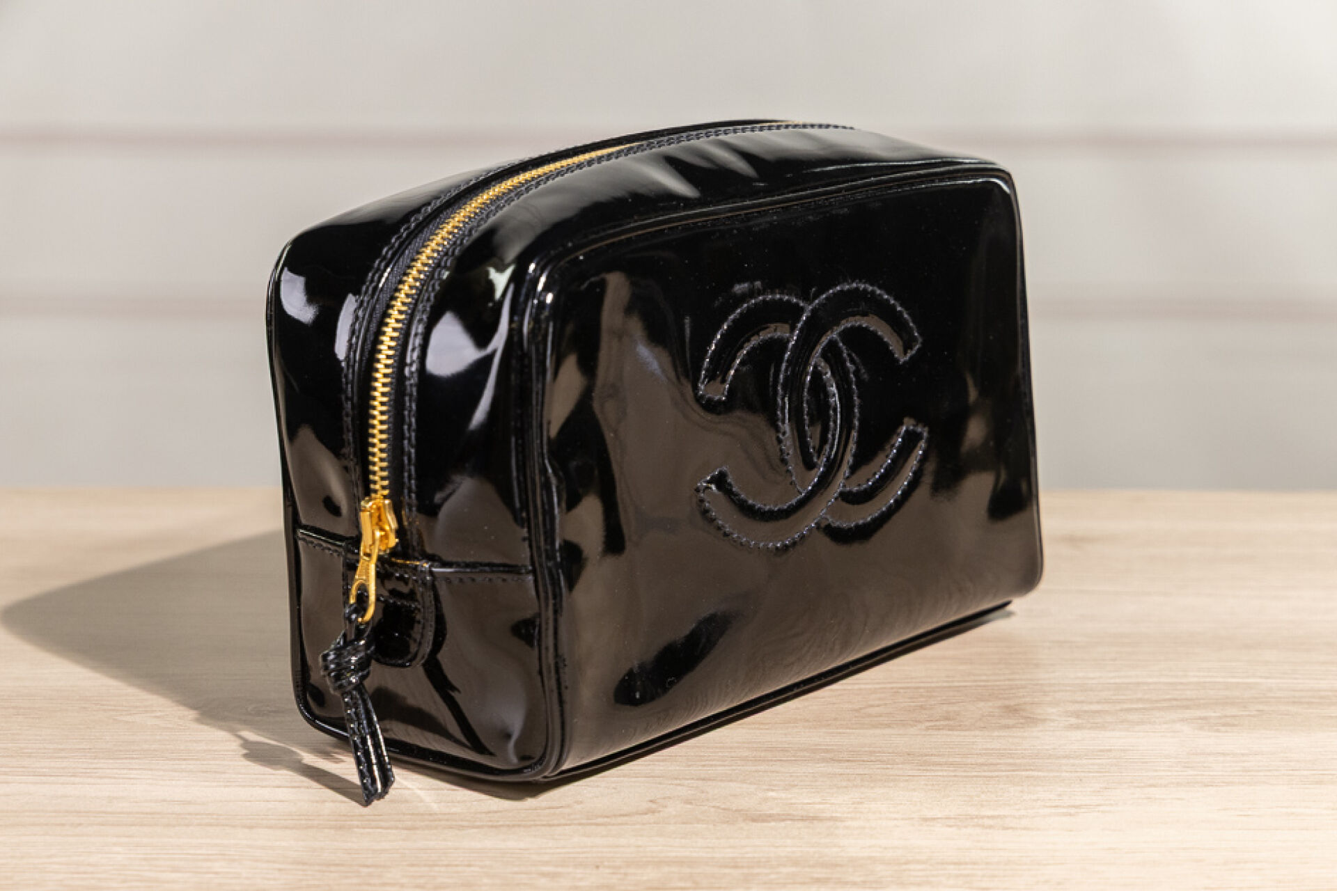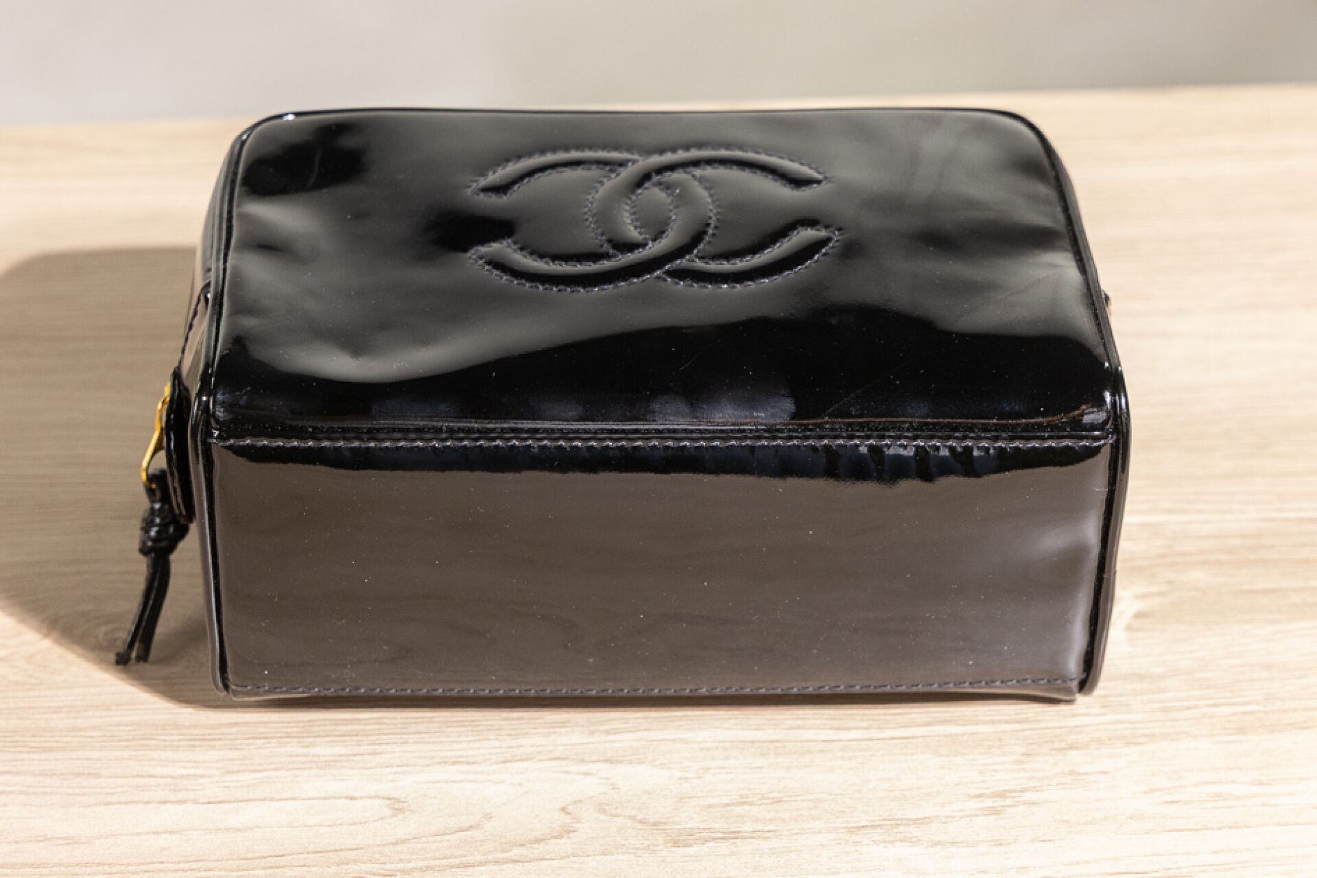 CHANEL - Trousse de toilette, vernis noir. Dans sa boite. Long. : 20 cm Très bon état