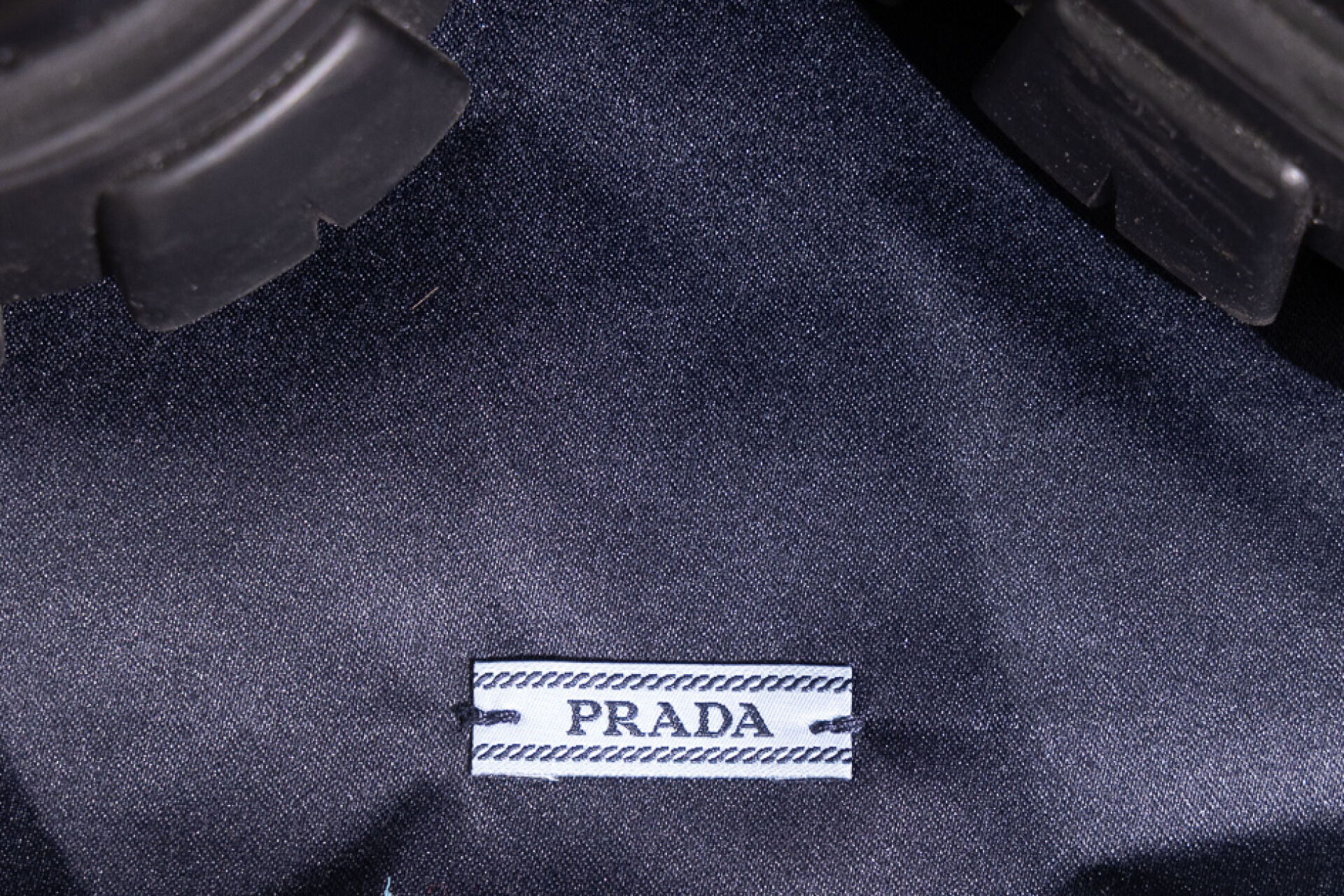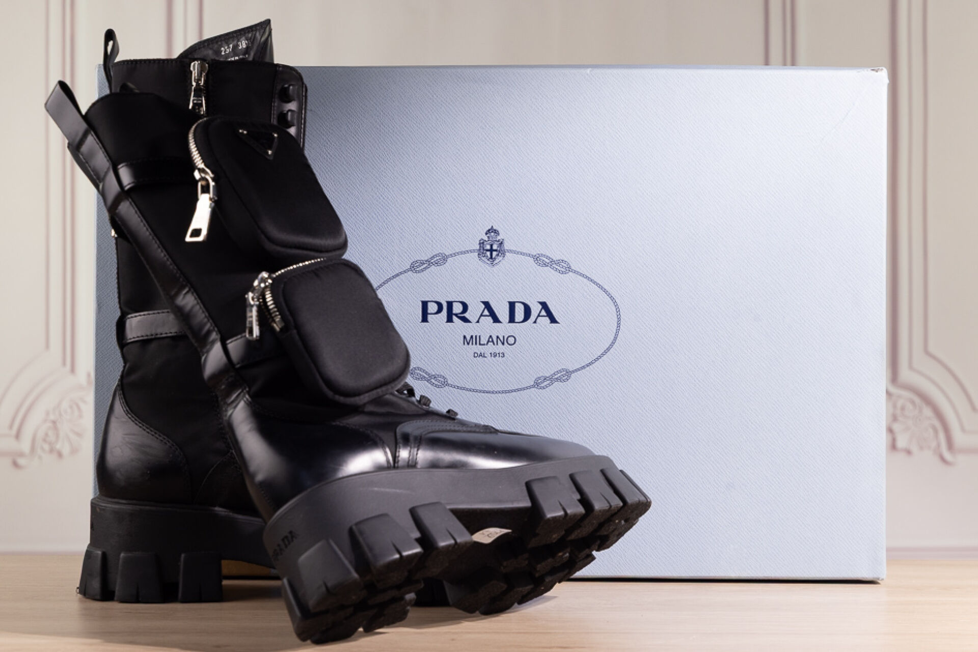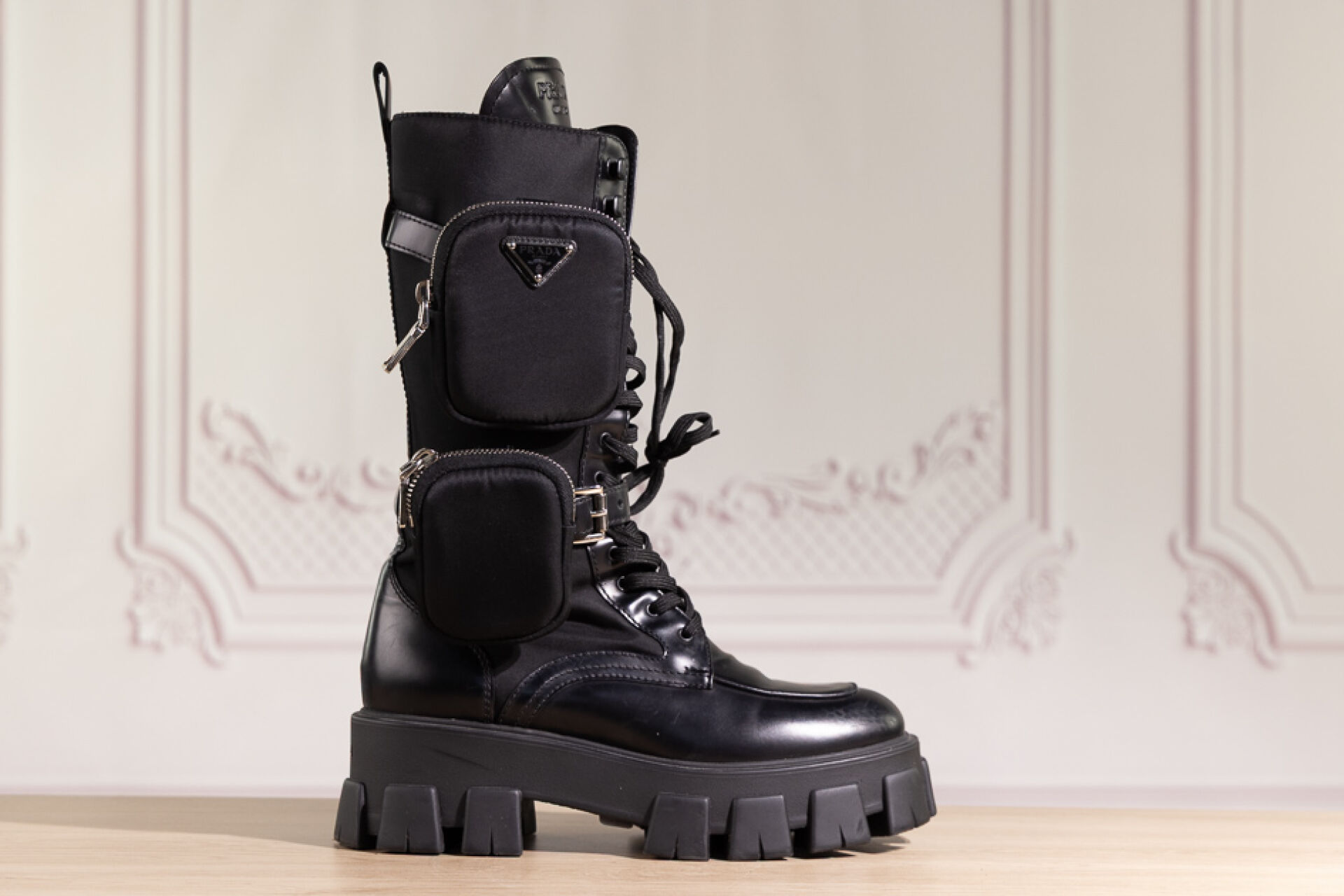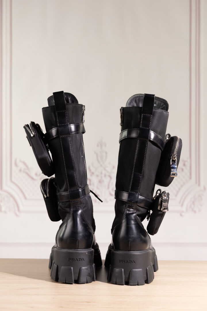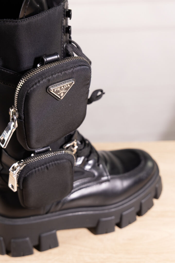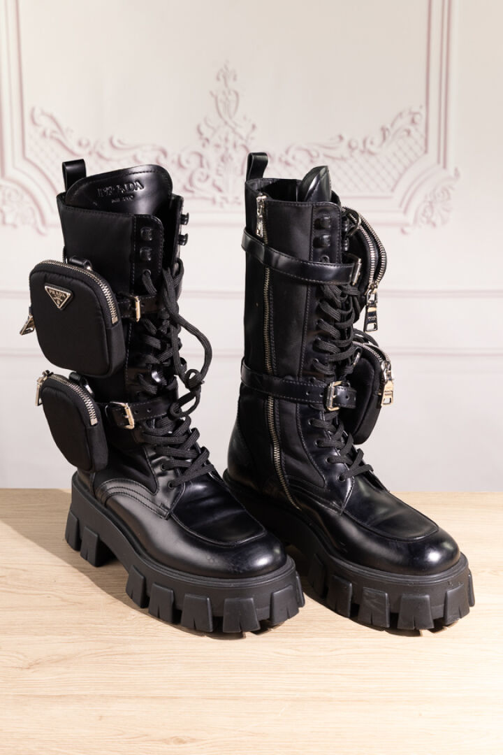 PRADA - Paire de bottes "Monolith" en cuir glacé et nylon noir, laçage sous deux pattes ornées d'une poche zippée, importante semelle crantée. Boite. Pointure 38,5 Déjà portées, griffures.