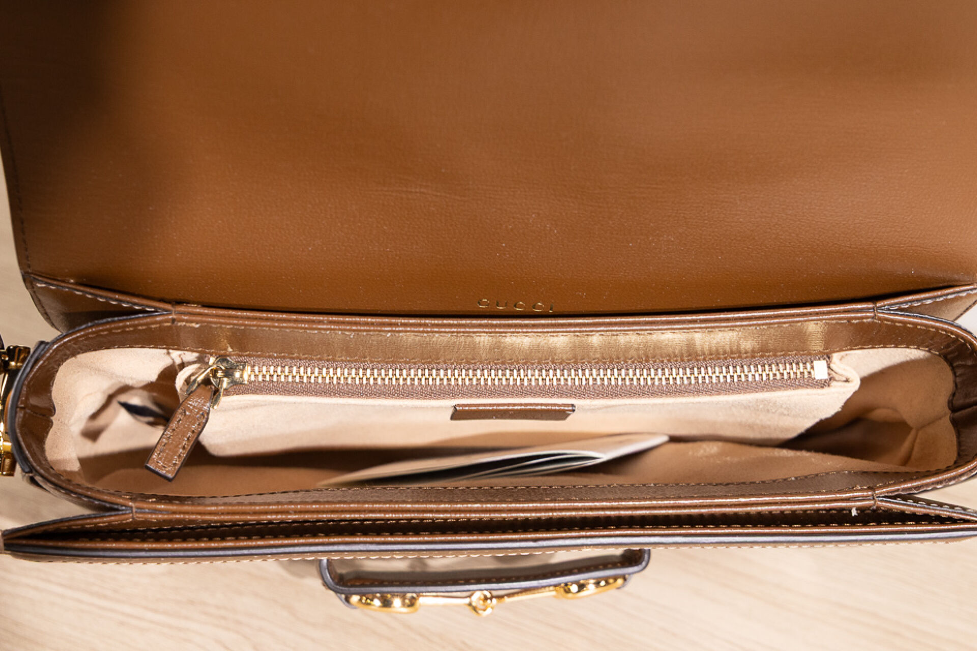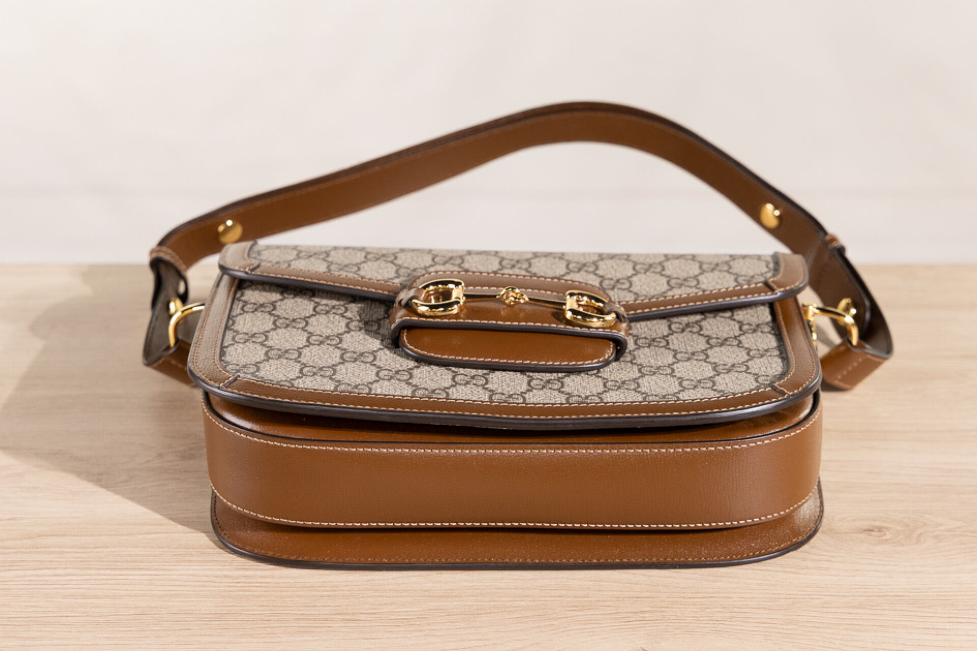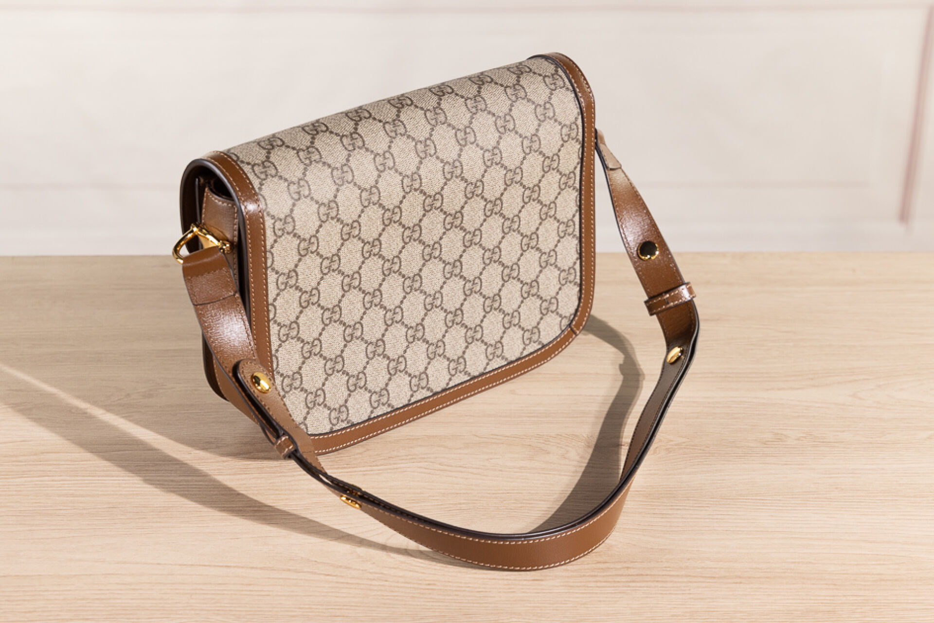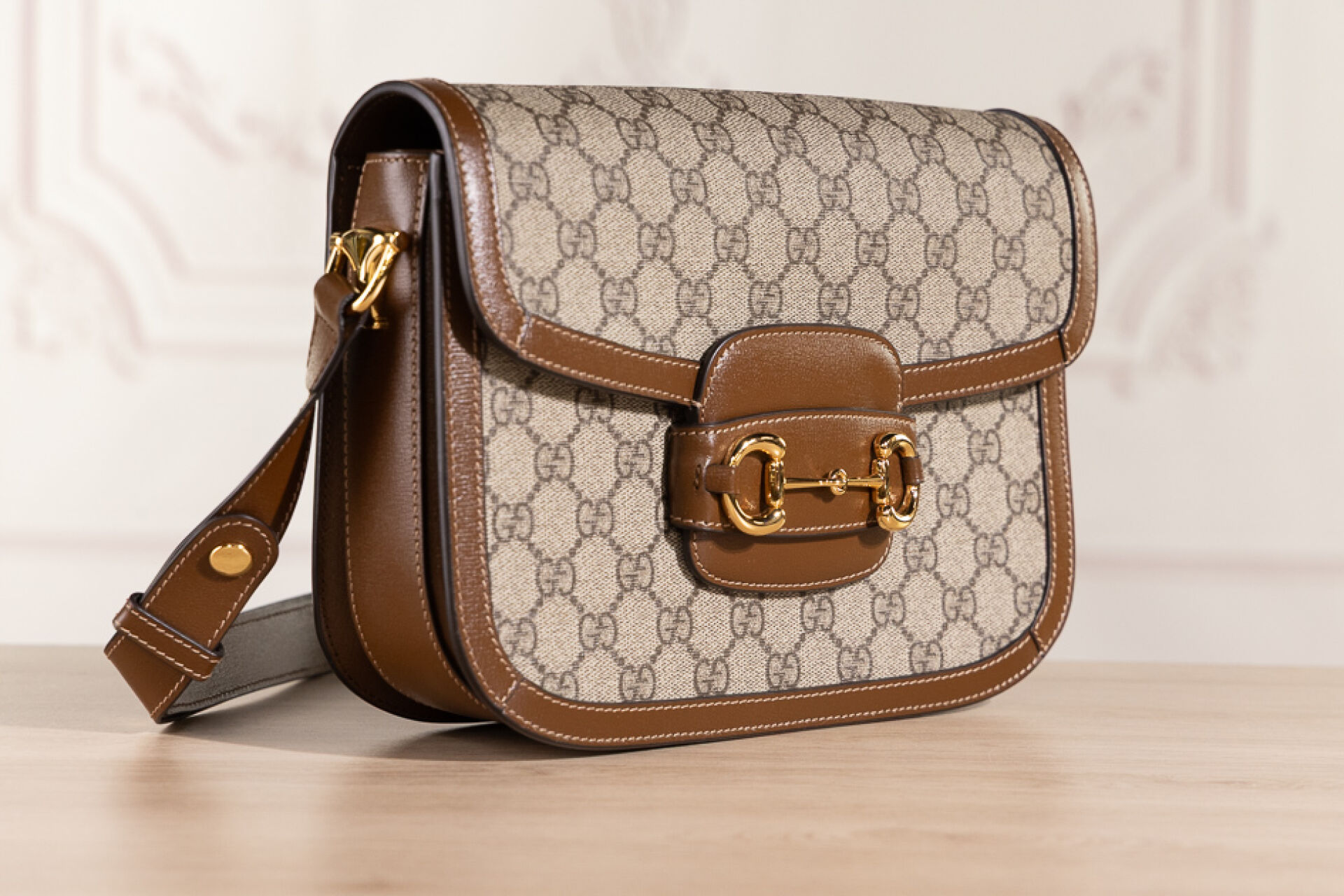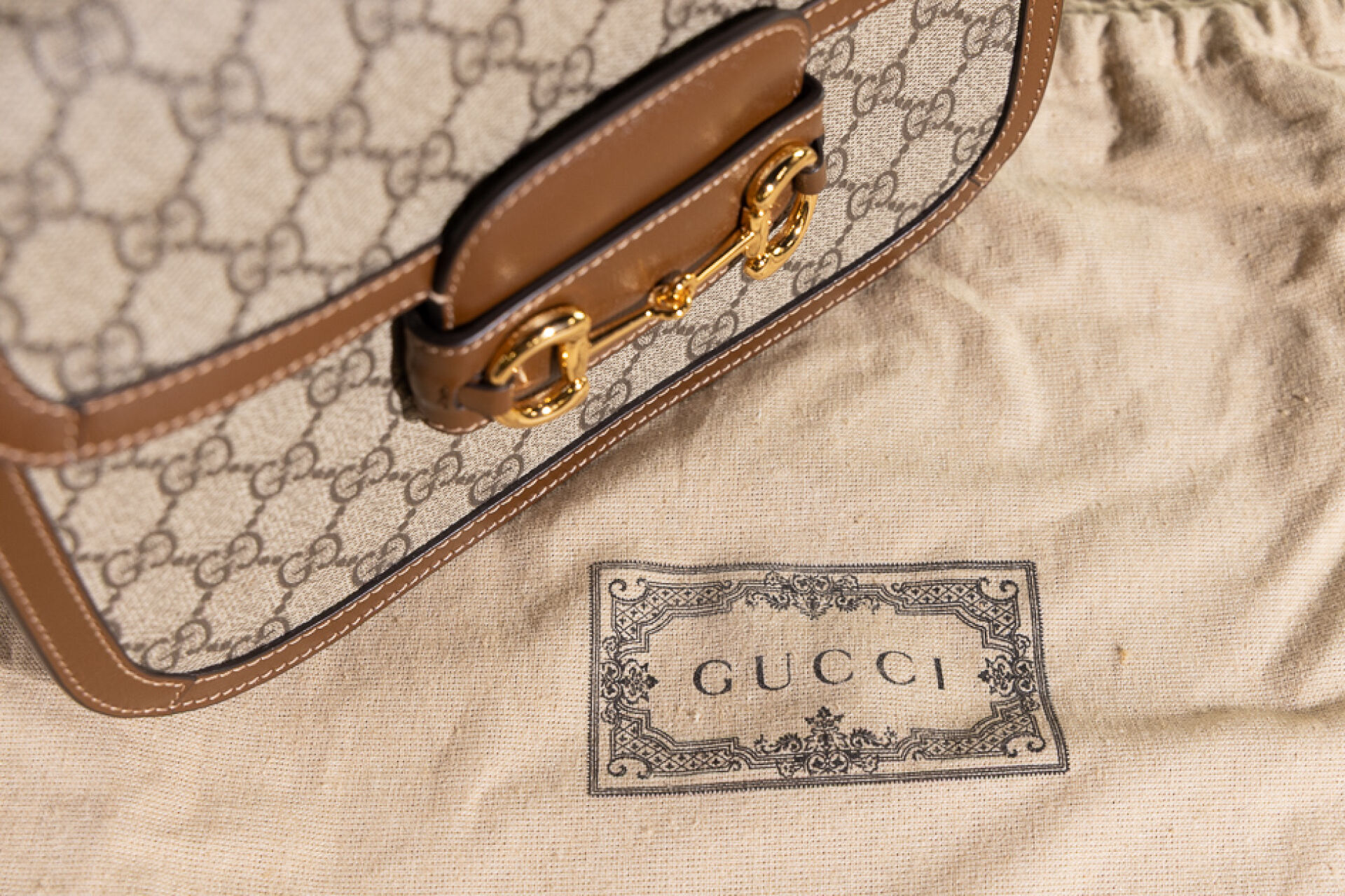 GUCCI - Sac "Horsebit" en toile enduite GG suprême et cuir beige, fermoir languette rehaussée d'un mors doré sur rabat, anse réglable, doublure en suédine nude. Dust bag. Haut. : 18 cm - Long. : 25 cm Très bon état