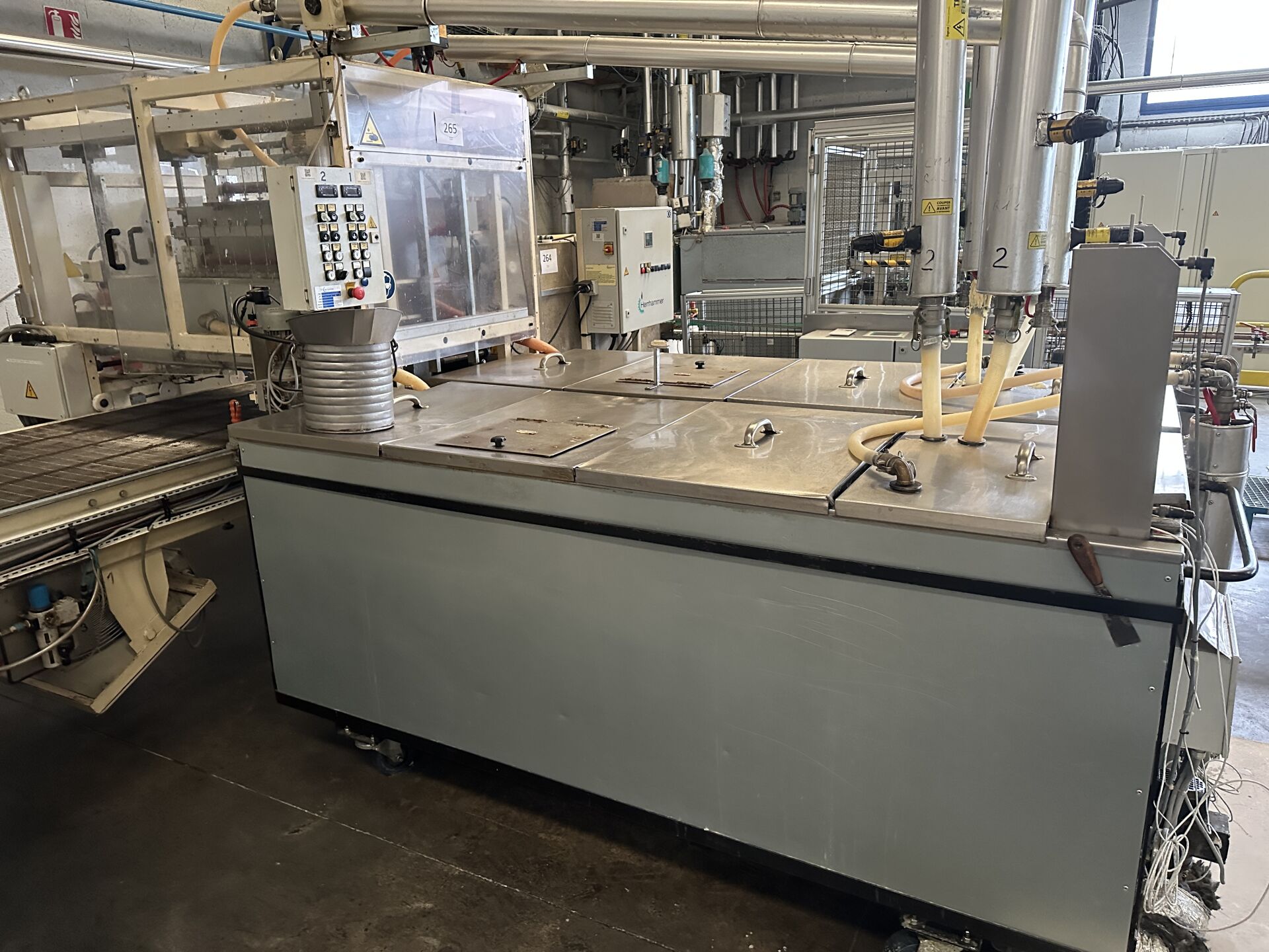 Vendu sur désignation le 04 11 2025 à 10h à NANTES, 24 rue du marché commun, visible le 03/11/2025 de 14h à 16h à GETIGNé, Enlèvement jusqu'au 19 décembre 2025 Ligne de remplissage (LR1) HERRHAMMER 2 bacs remplisseurs automatisés avec détecteurs et ouverture de buse 10 buses FULLER DUO No 05300190 de 2012 , cage de protection vitrée 200 x 110 cm + 2 bacs bain d'huile mobiles 232 X 80 X 90 cm hors roues (frais de mise à disposition 150 € TTC)