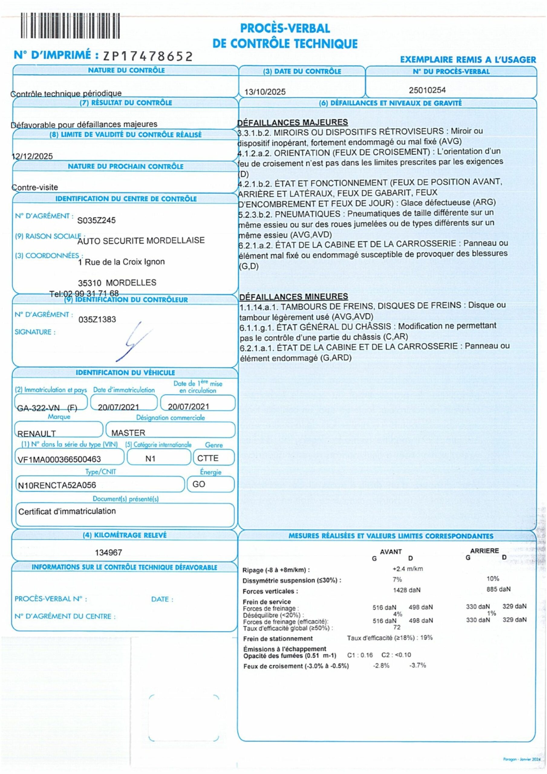 BOITE MANUELLE 6 VITESSES COMMANDES AU VOLANT VITRES ET RETRO ELECTRIQUES RADAR DE RECUL CLIMATISATION ECRAN TACTILE SIEGES TISSU NOIR CAISSE RESINE COQUE ET MIROIR RETRO G CASSES ET MANQUANTS FROTTEMNTS, ENFONCEMENTS, MANQUE BAGUETTE DE DPROTECTION AILE D PARE CHOC AR DEGRAFFÉ DEFAILLANCES MAJEURES : MIROIR OU RETRO INOPERANT AVG MAUVAISE ORIENTATION DES FEUX DE CROISEMENT PHARES : GLACE DEFECTUEUSE PNEUS DE TAILLE DIFFERENTE SUR UN MEME ESSIEU AVG AVD PANNEAU OU ELEMENT DE LA CABINE MAL FIXE OU ENDOMMAGE DEFAILLANCES MINEURES : DISQUE ET TAMBOUR DE FREINS LEGEREMENT USES AVG AVD MODIFICATION NE PERMETTANT PAS LE CONTROLE D'UNE PARTIE DU CHASSIS