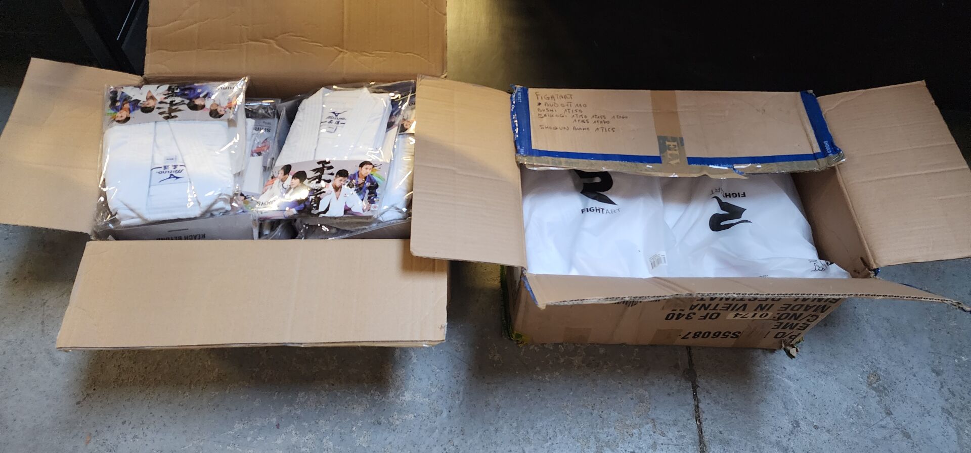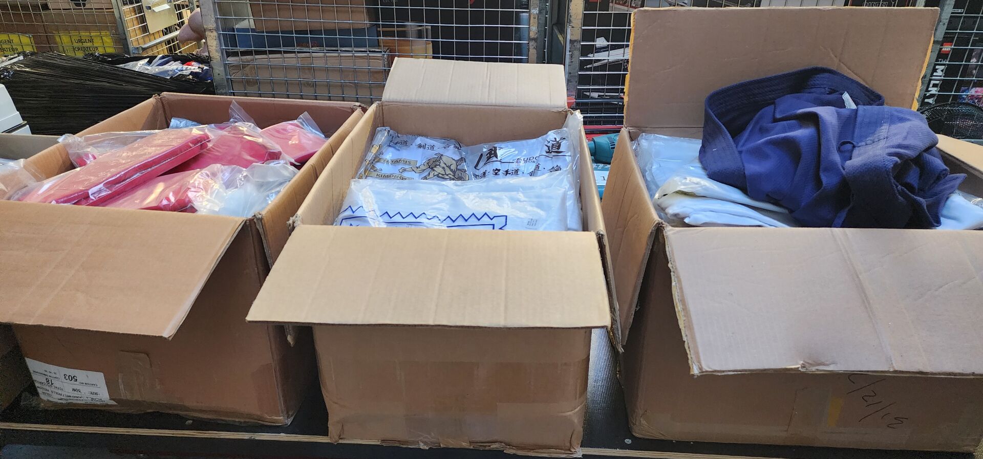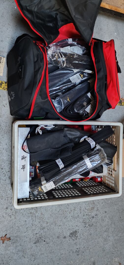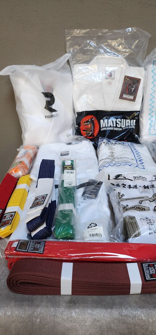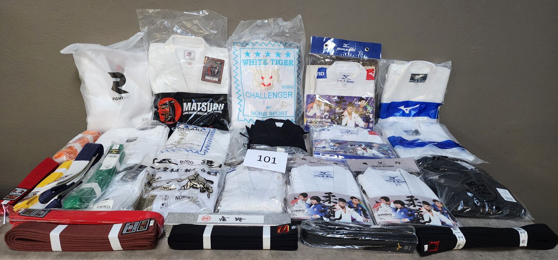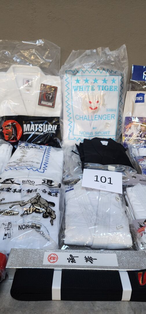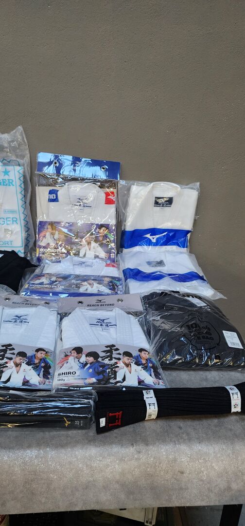 1 lot d'environ 110 kimonos pour judo de tailles et couleurs différentes dont : MIZUNO, MATSURU, NORIS etc... environ 50 ceintures de tailles et couleurs différentes dont : MIZUNO, FIGHTING FILMS, NORIS
